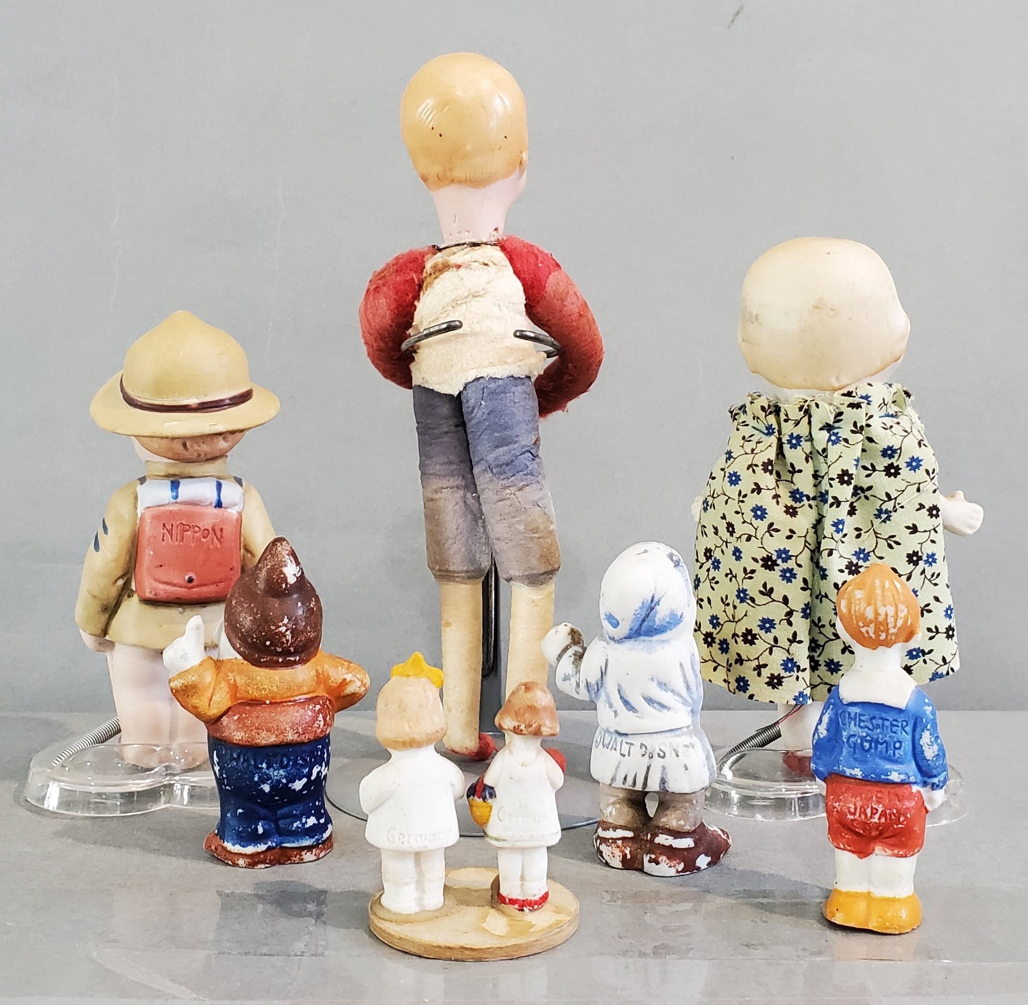 LOT OF 8 JAPANESE / GERMAN BISQUE DOLLS - 1 1/2" - 6 1/2", 1- GERMAN HEAD ON SPUN-COTTON BODY W/ BISQUE HANDS, ALL OTHERS ARE MADE IN JAPAN, NO DAMAGE NOTED TO THE BISQUE