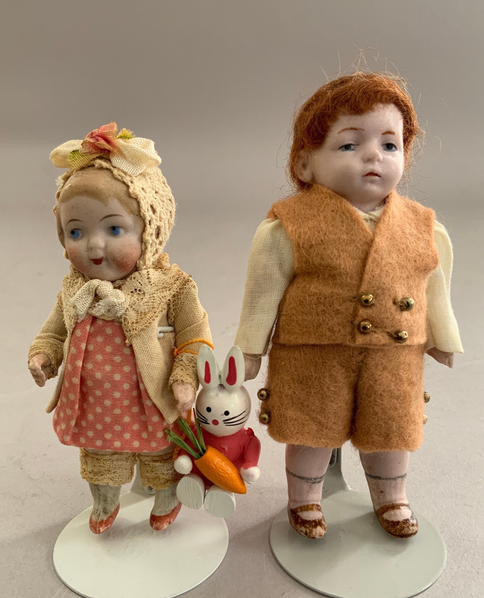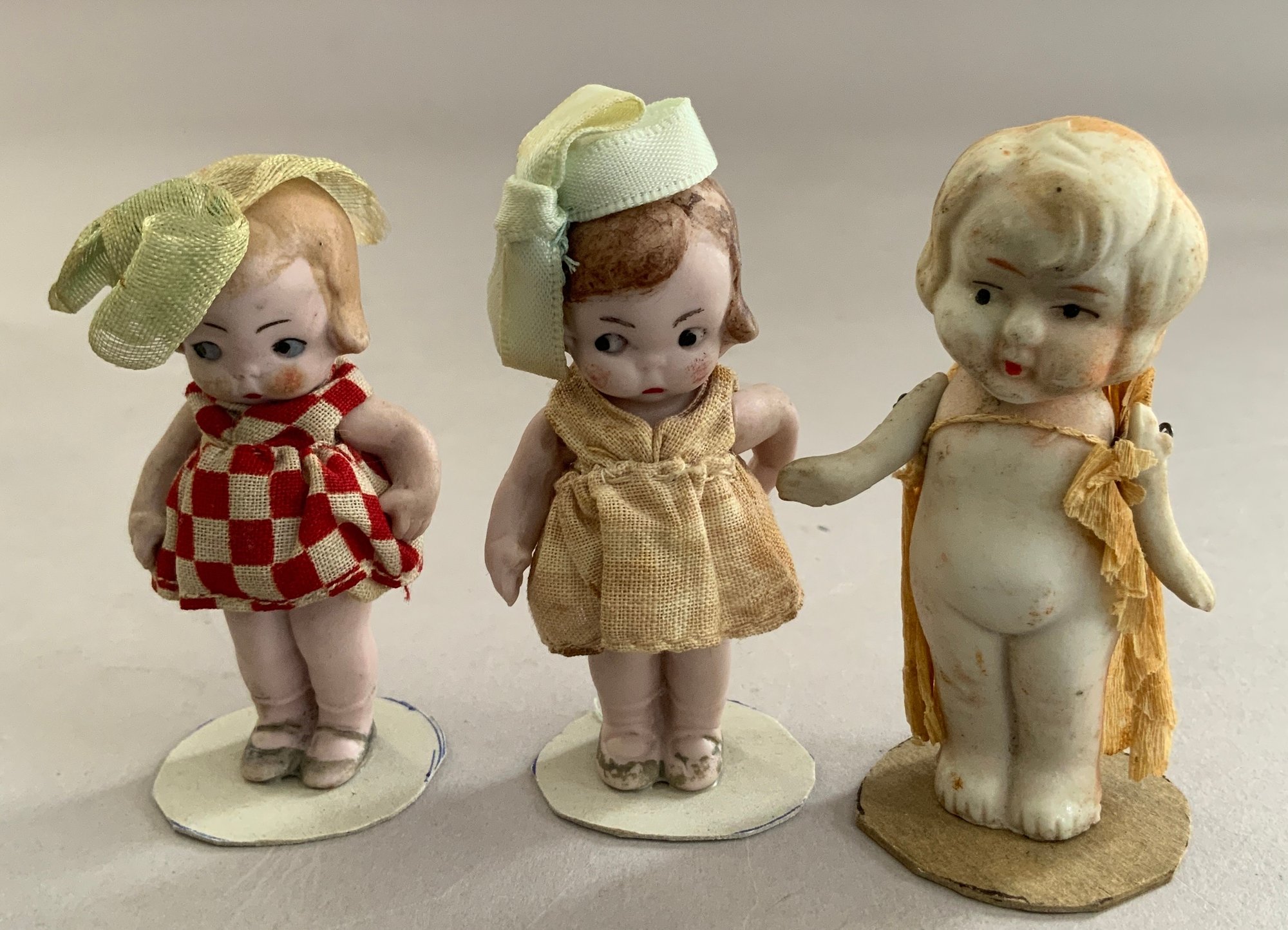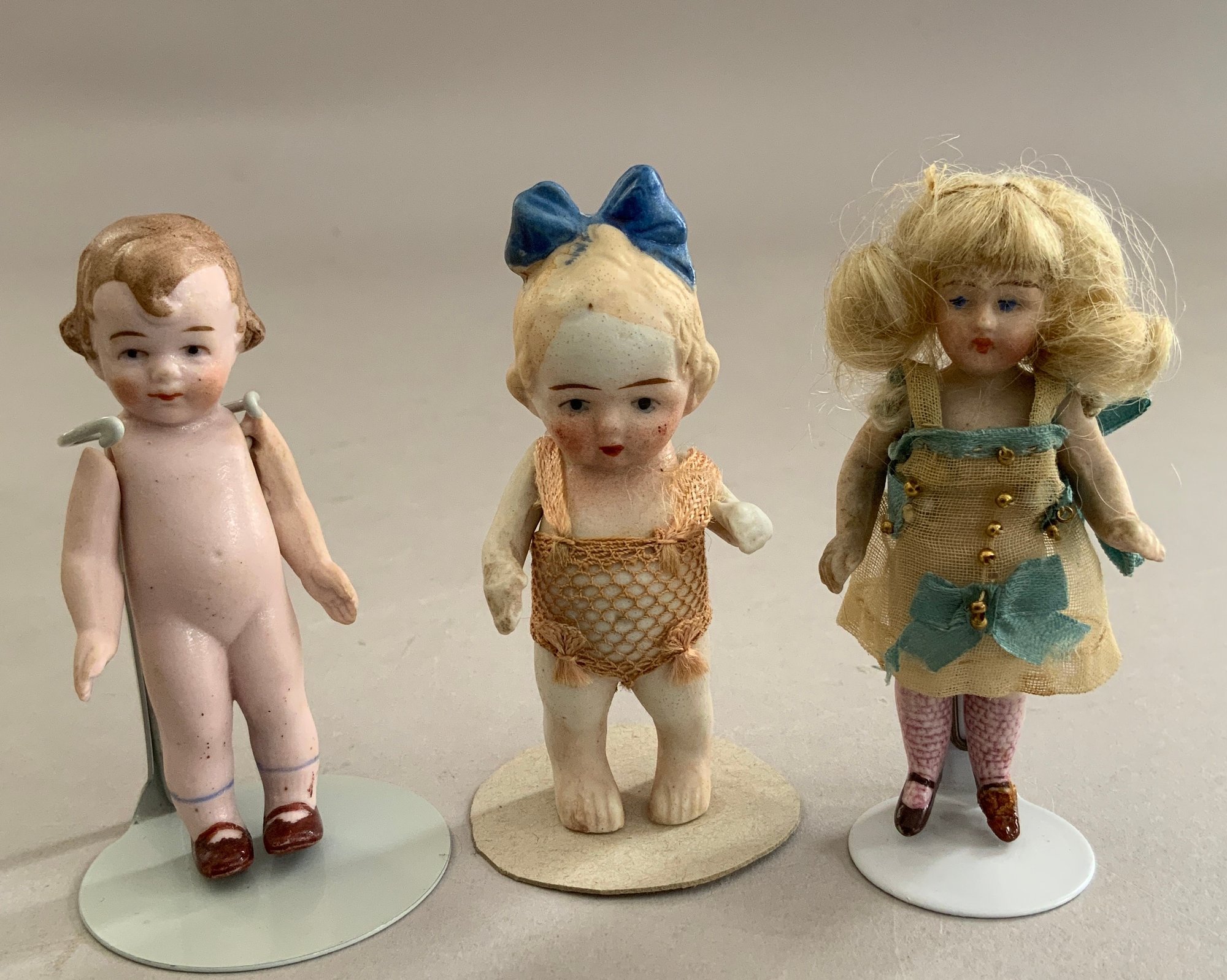 Lot of 8 small all bisque dolls, 2 ½” – 4 ¼” tall, assorted outfits