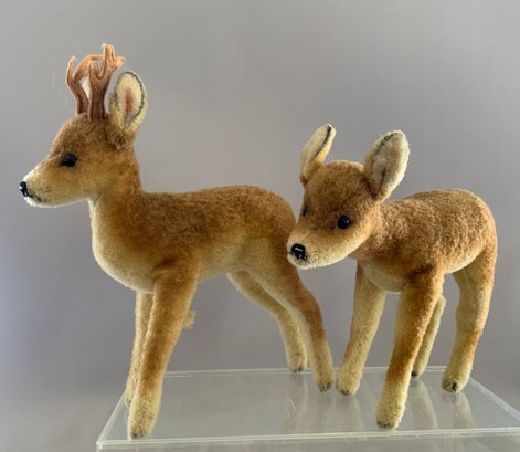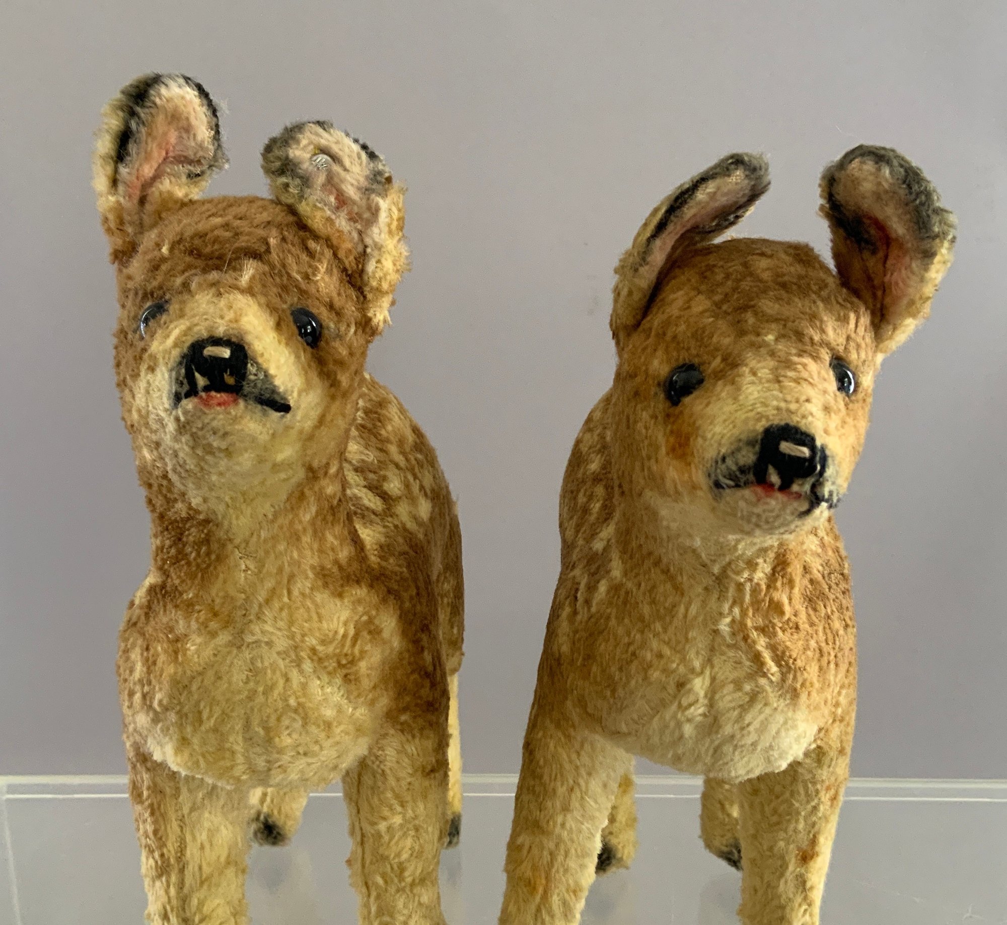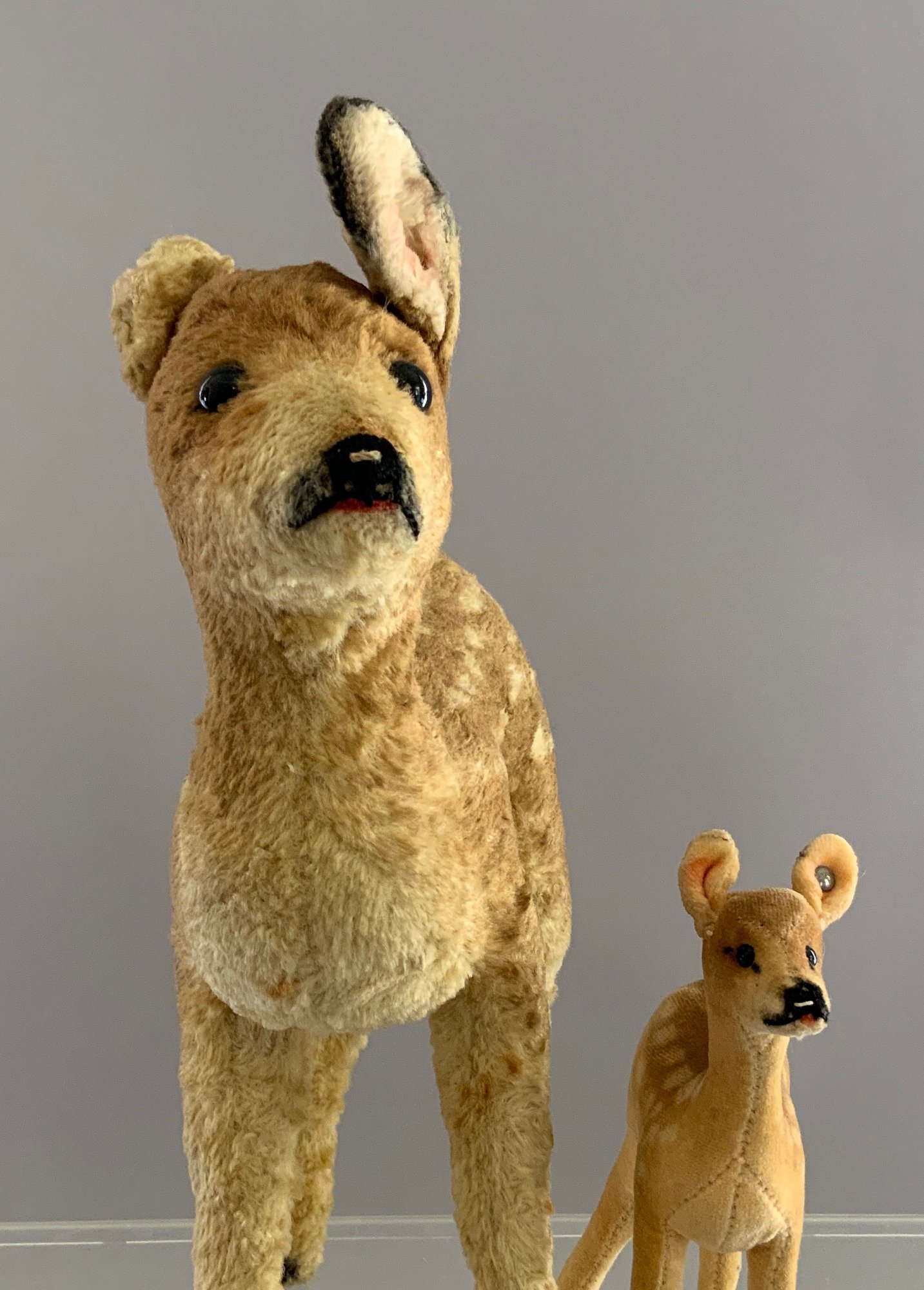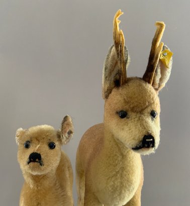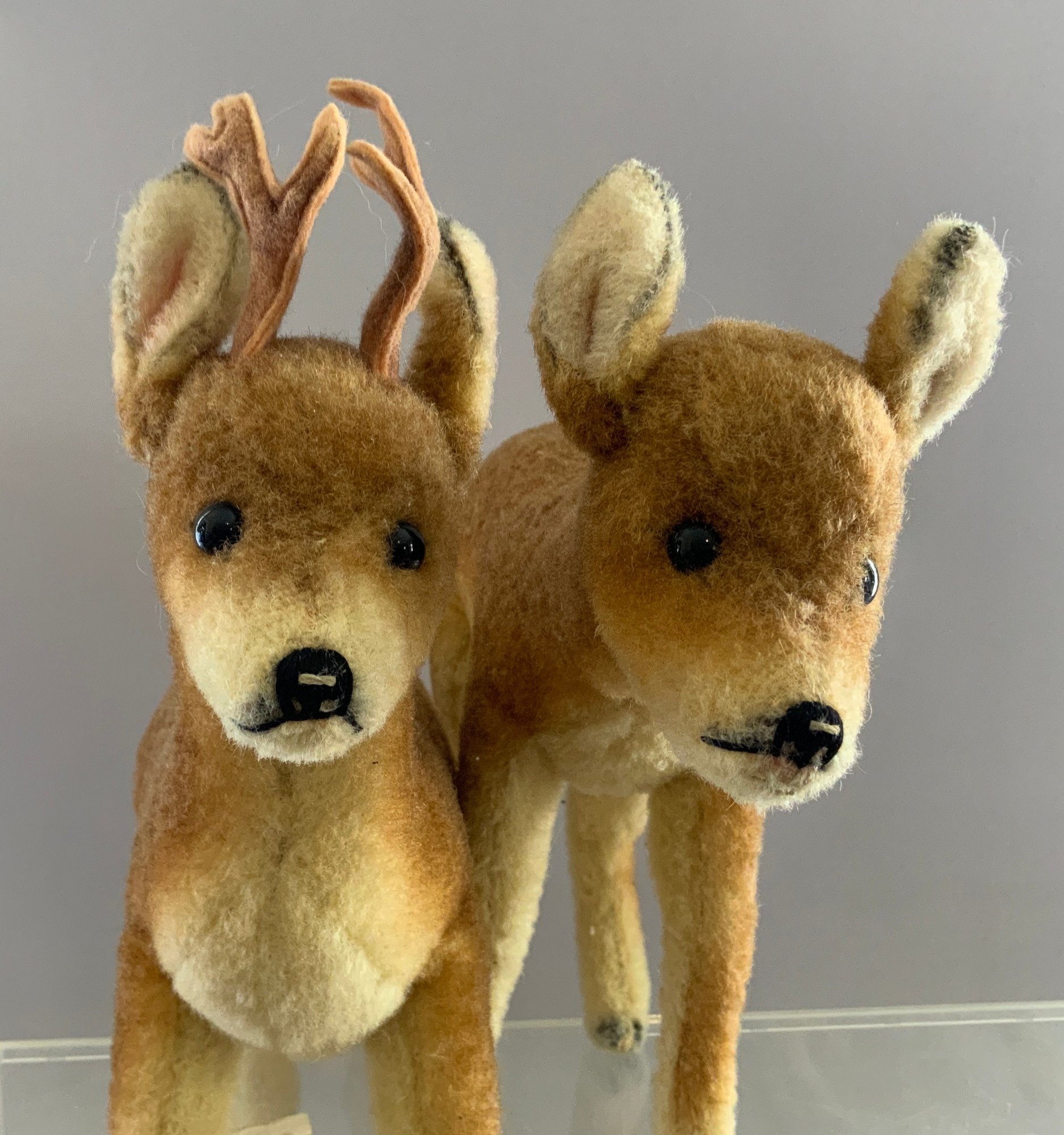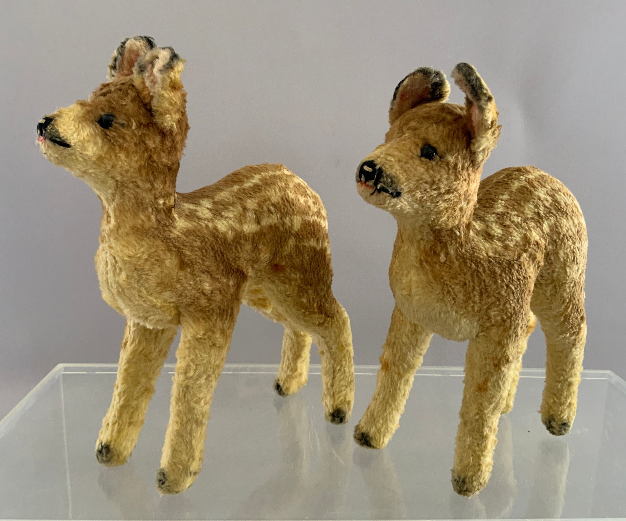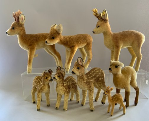 Lot of 8 Steiff deer 4” – 11” long, 3 – with buttons, 3 with US Zone Germany tags, (wear)