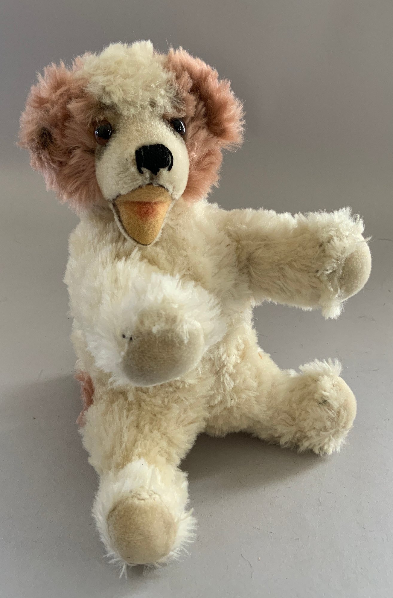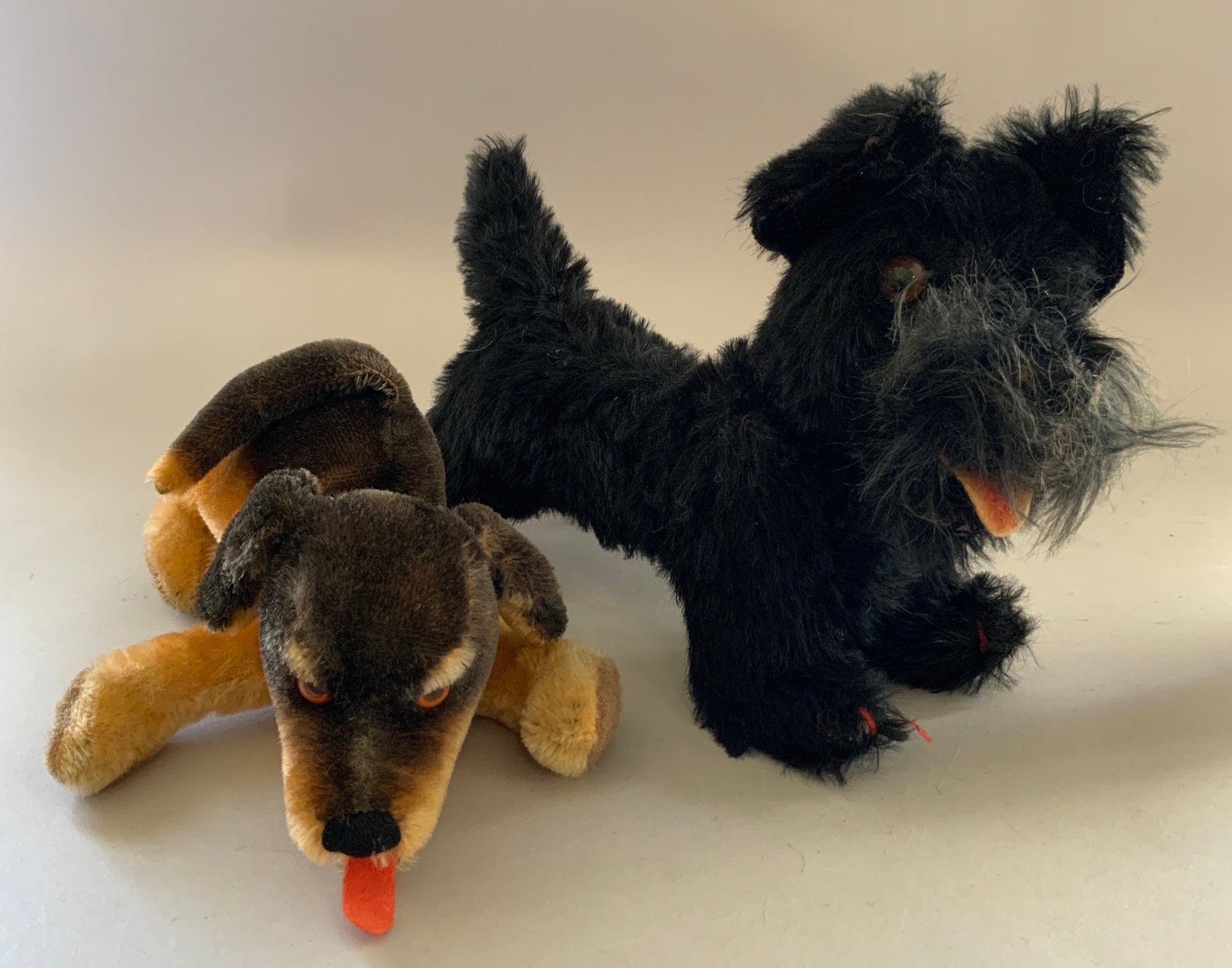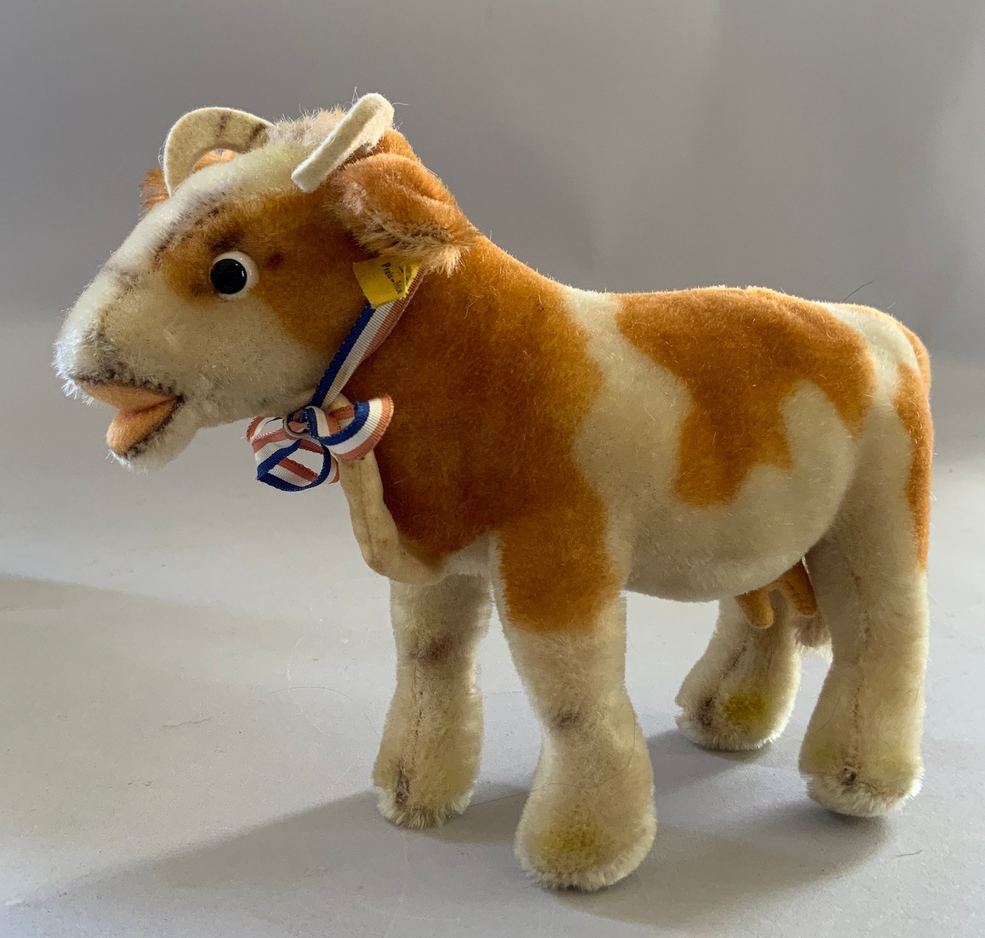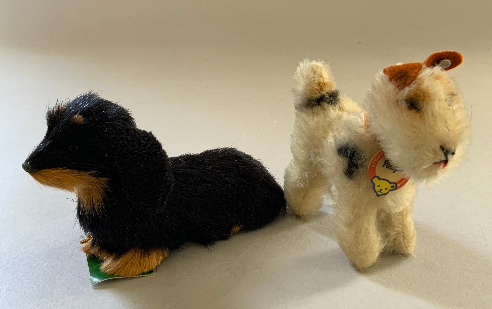 Lot of 8 toy stuffed animals, 3 ½” Steiff “Foxy” dog, 6” Steiff camel on cushion, 9” Steiff cow, 3 – plush/mohair dogs, & 1 – 4 ½” Kurt S Adler dog, & 1 – 10” camel