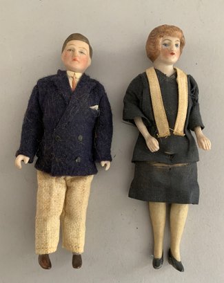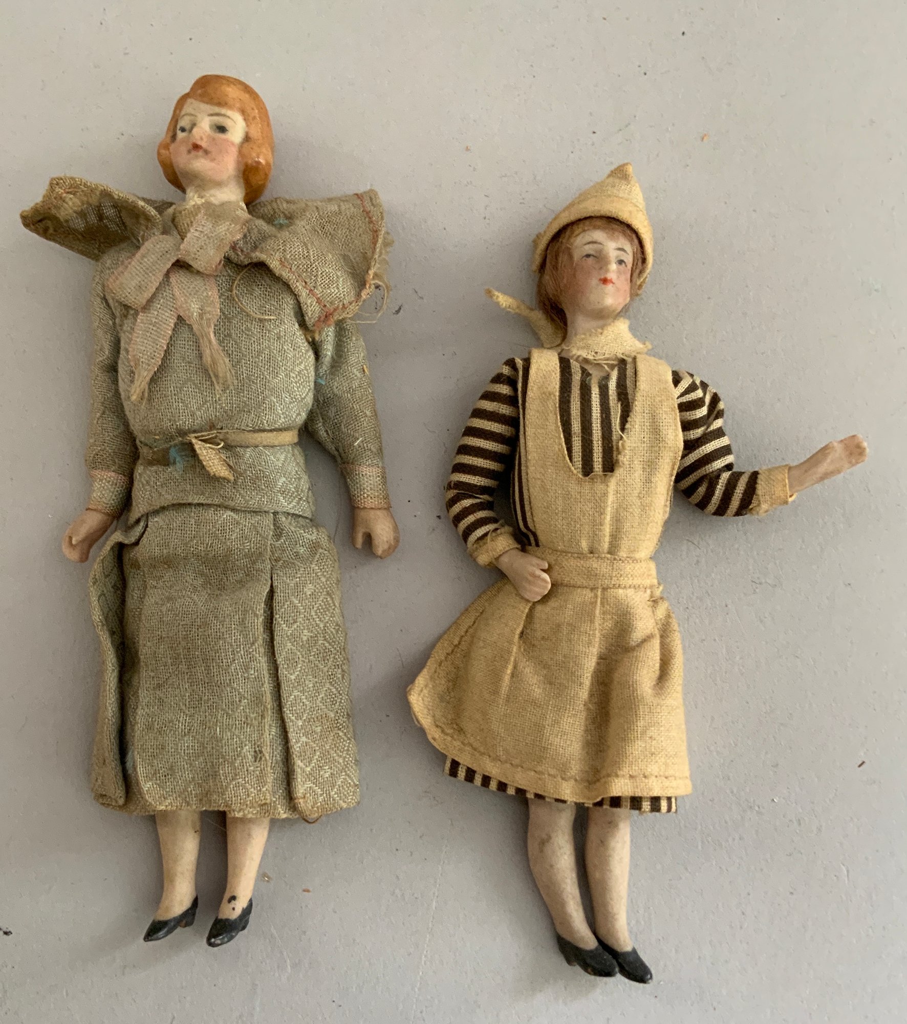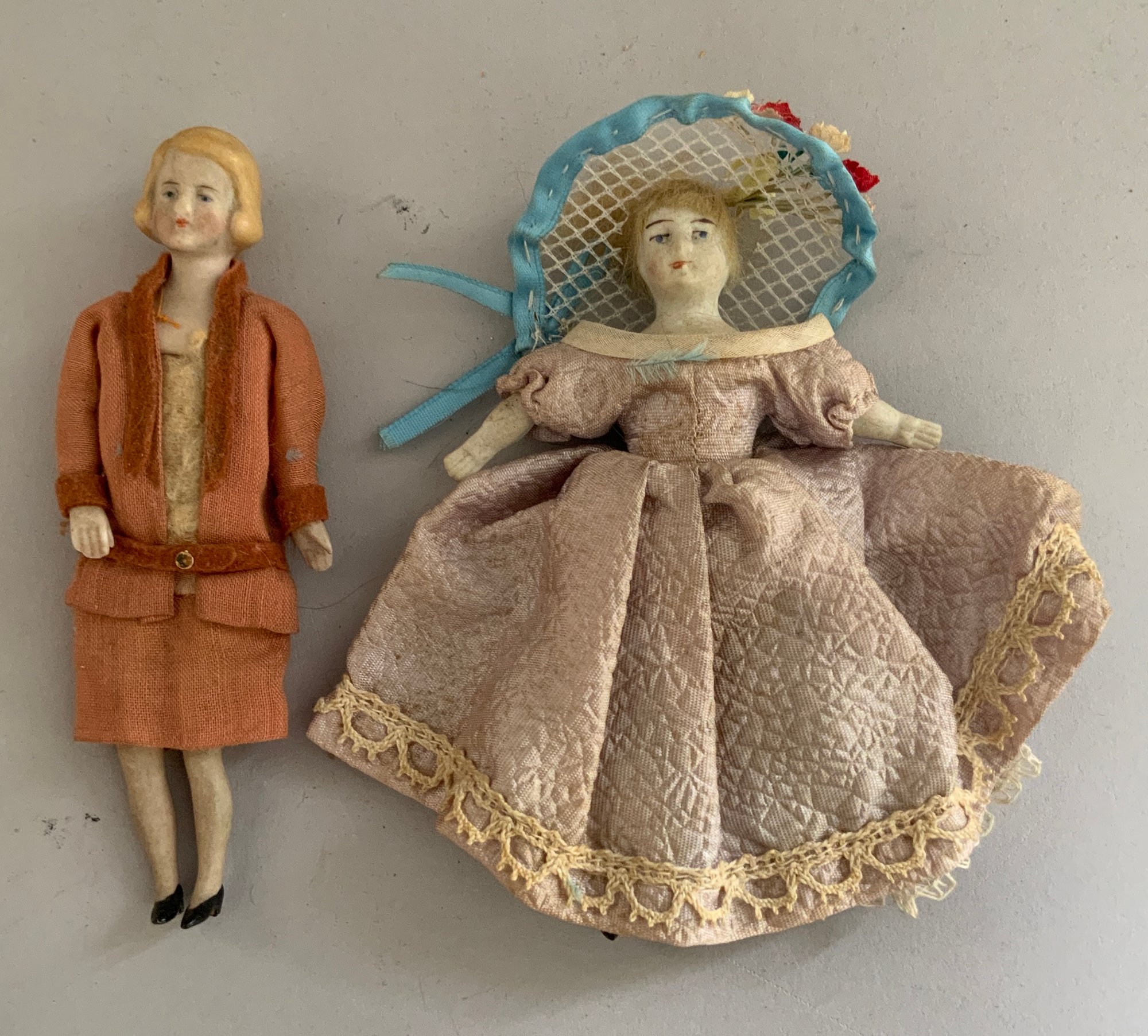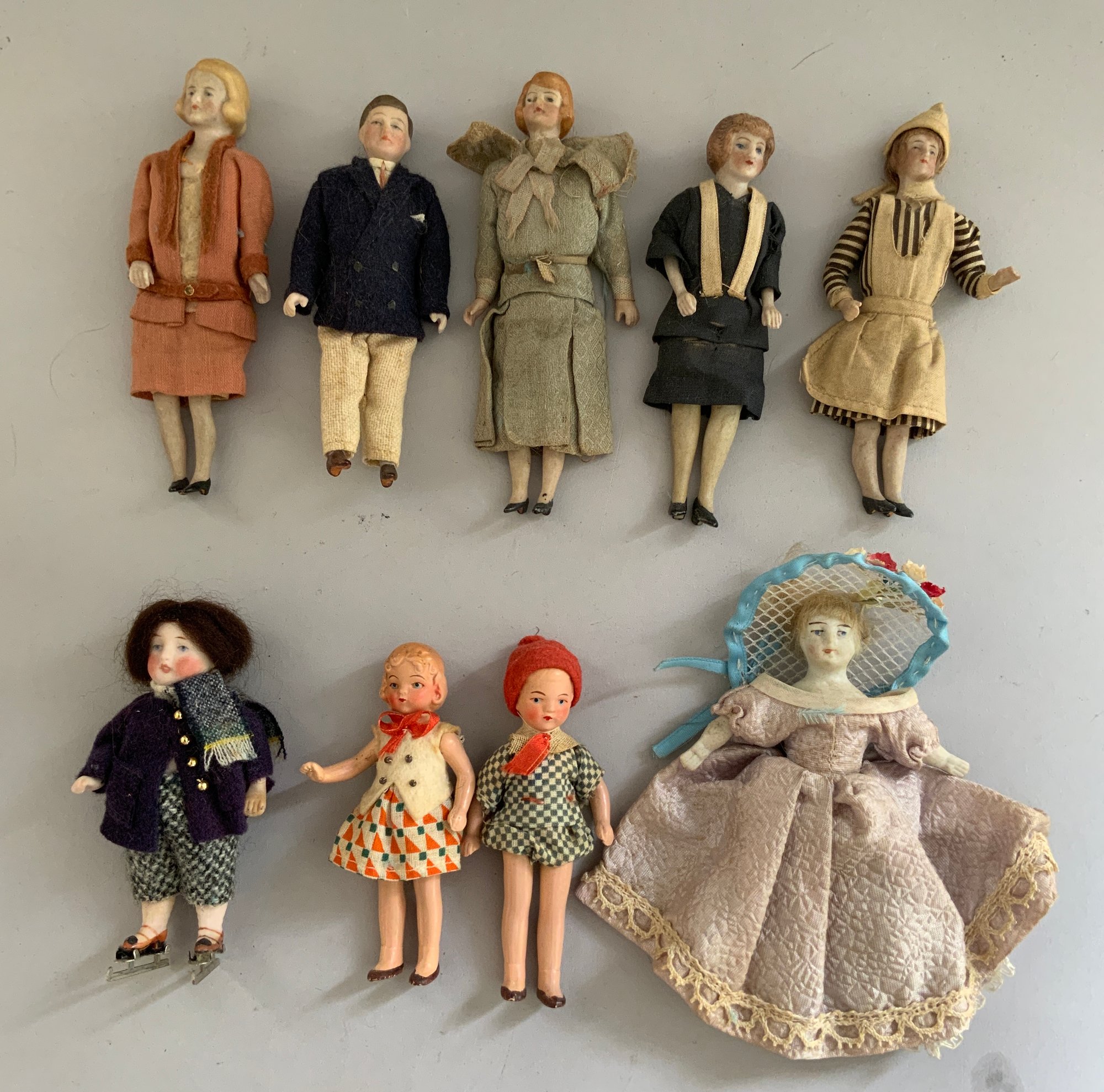 Lot of 9 doll house dolls 4” – 5” tall, 2 – flapper dolls