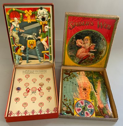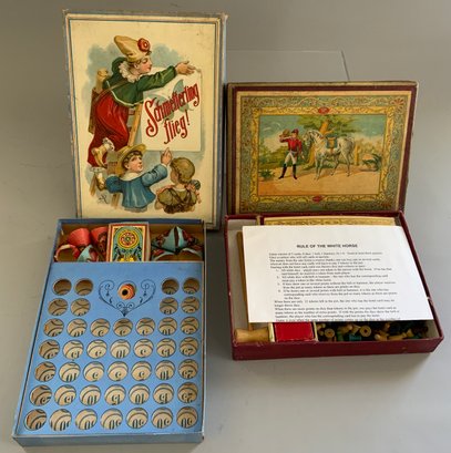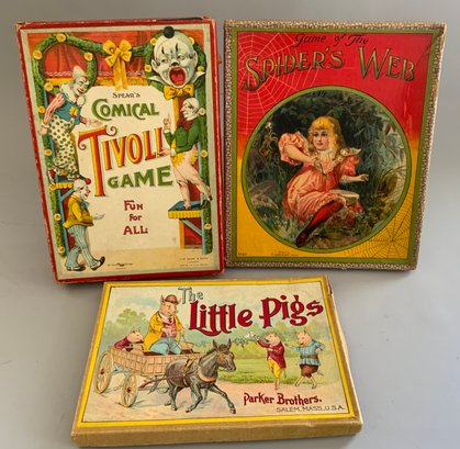 Lot of 9 Early games & puzzles, Robber Kitten picture puzzle by Parker Brothers, Spear’s Comical Tivoli Game, J.W. Spears & Sons London, Regle Du Cheval Blanc, (rule of the white horse game), Paris, Big Nell Scroll Puzzle 4730, Milton Bradley Springfield, Game of the Spider’s Web, 5125, McLoughlin Bros. New York, Schmetterling Flieg, The Butterfly Game, Germany, The Little Pigs Parker Brothers Salem Mass, Victory wood jig-saw puzzle, England, farm scene 20 pcs. (very worn box), Zebra & Leopard wood puzzle made in Germany
