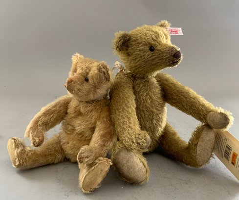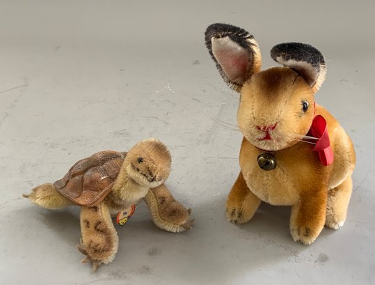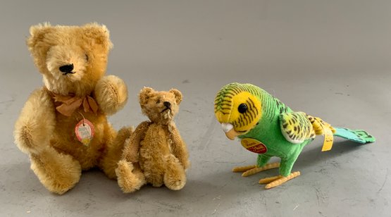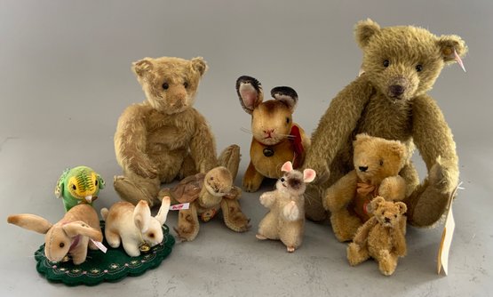 Lot of 9 Steiff animals, 3 ¼” – 12” long, 4 – Teddy bears, parakeet, turtle, mouse, & rabbits, 4 with buttons, 9” bear (worn spots)
