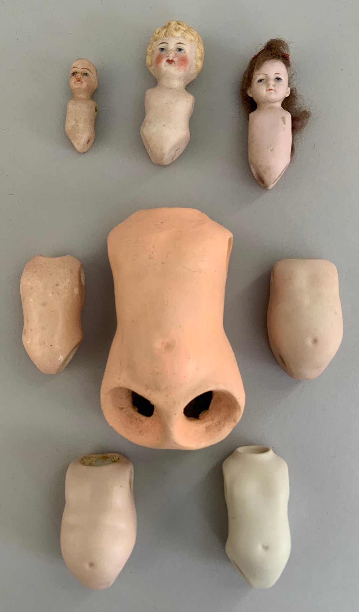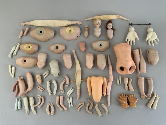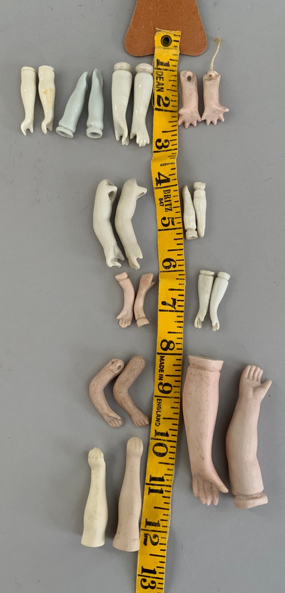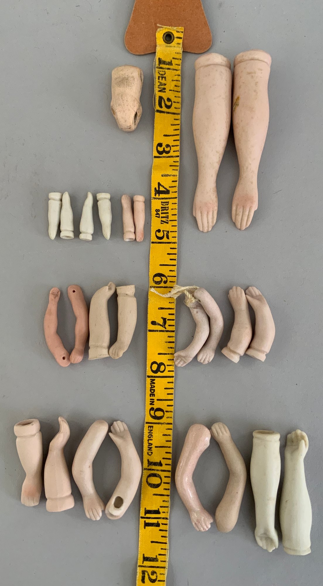 Lot of antique bisque shoulder plates, small bodies, arms & hands