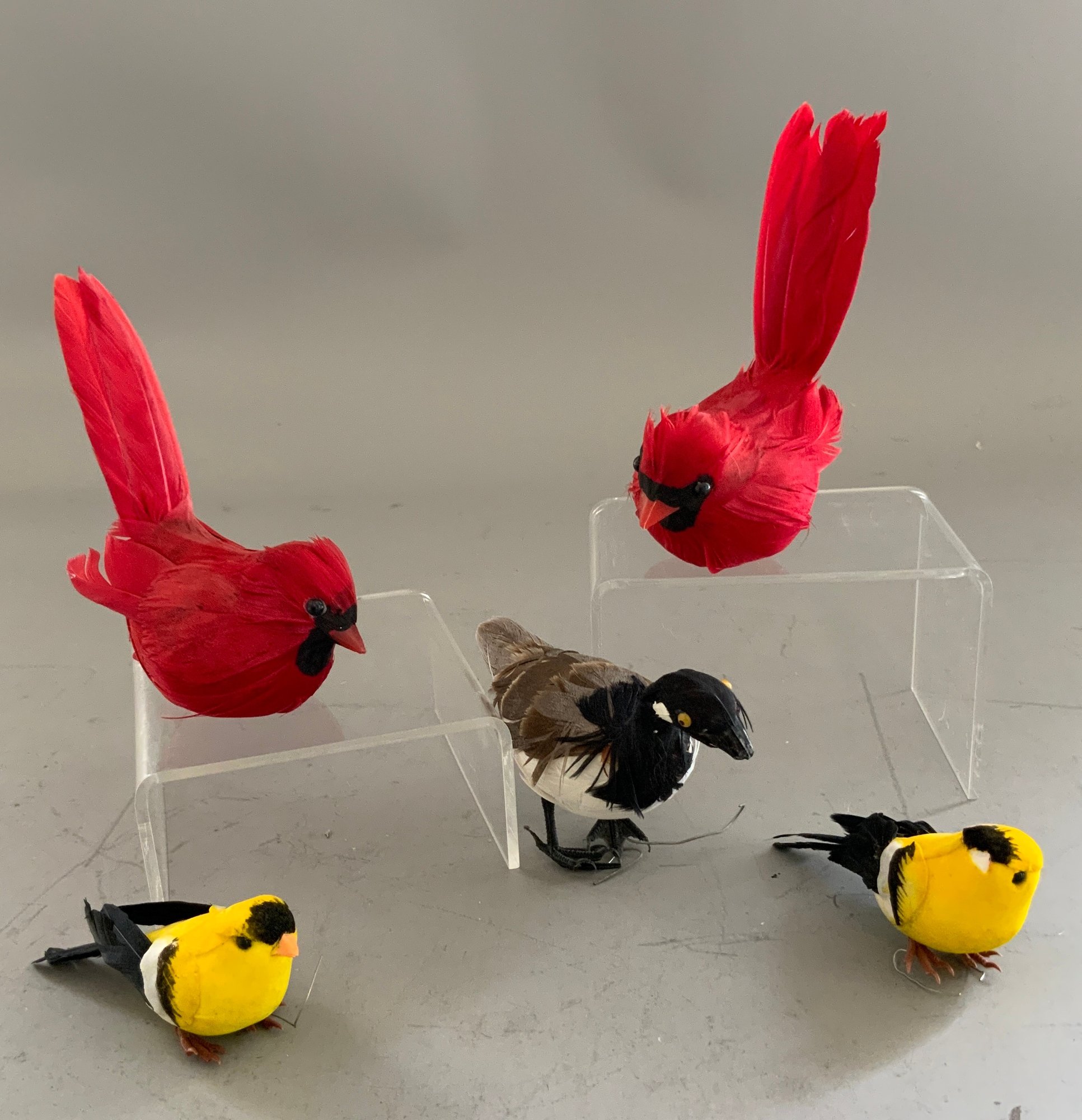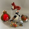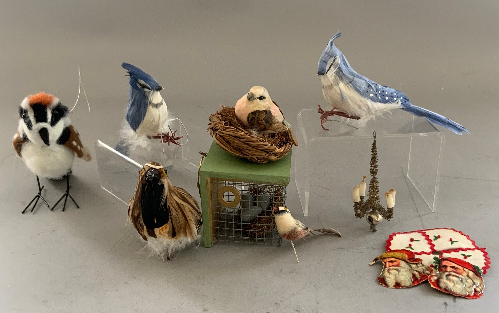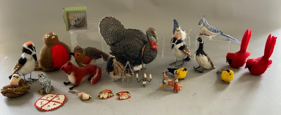 Lot of assorted birds, nests, animals, 8” paper mache turkey candy container, wool bird Christmas ornaments, felt birds, convention robin, etc.