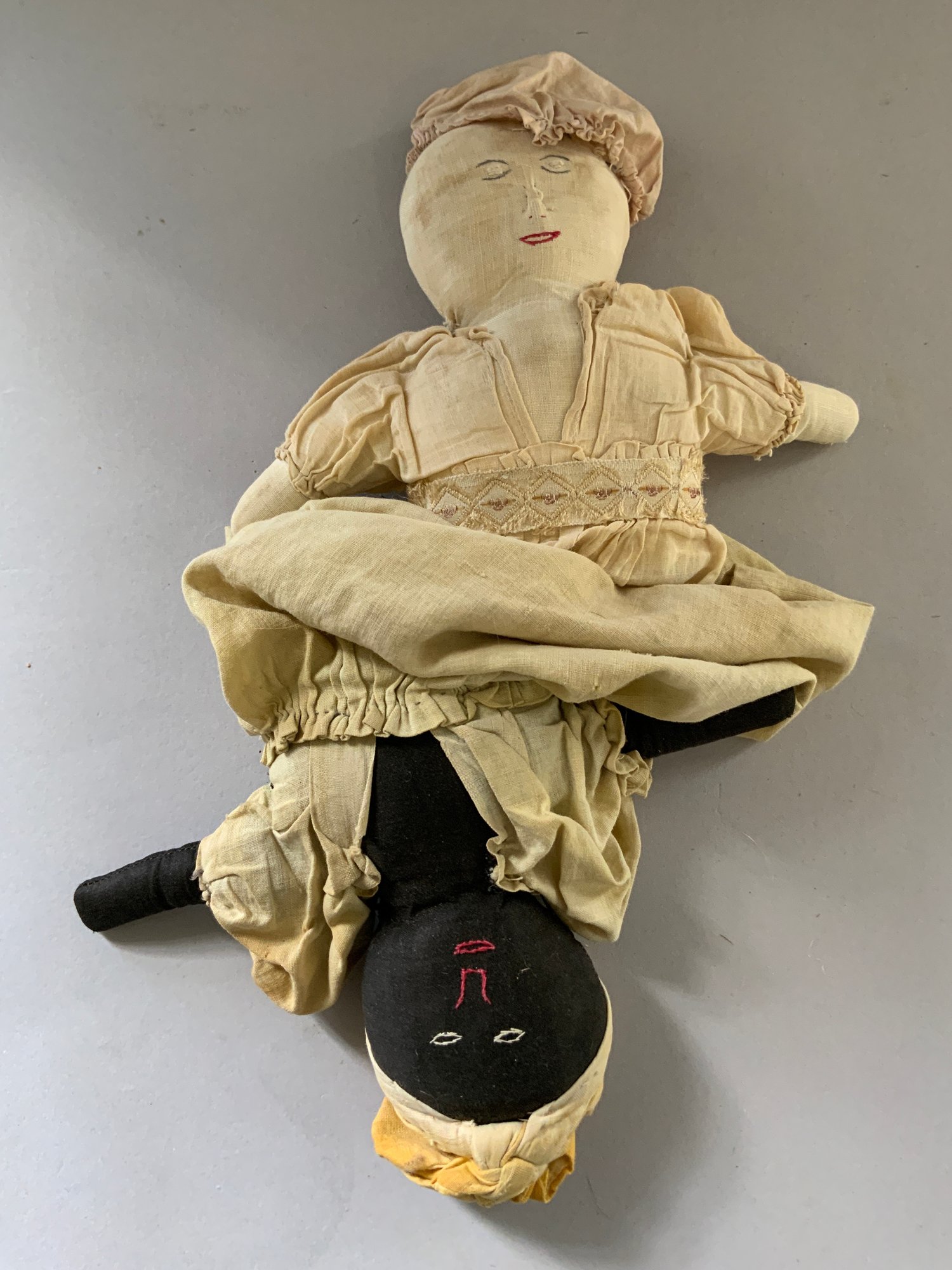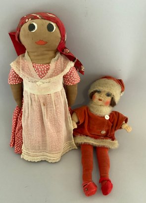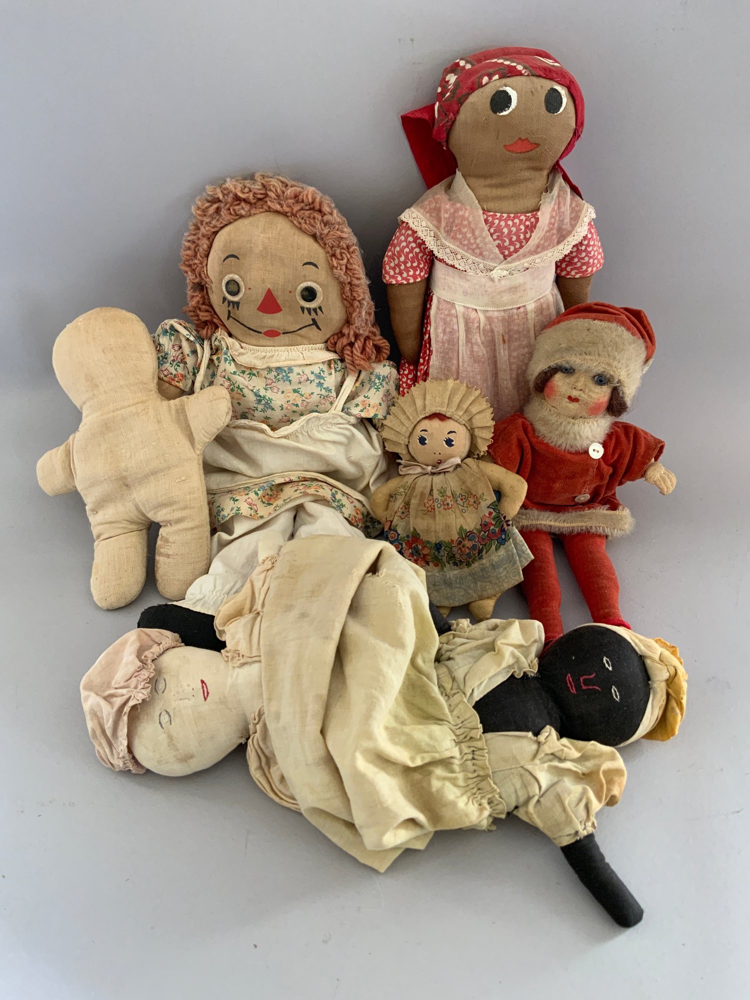 Lot of assorted cloth dolls, 11” topsy Turvey stitched features, raggedy ann & andy, Chad Valley, etc.