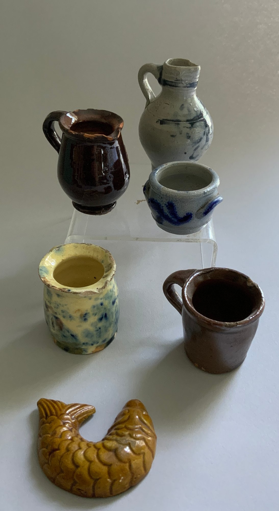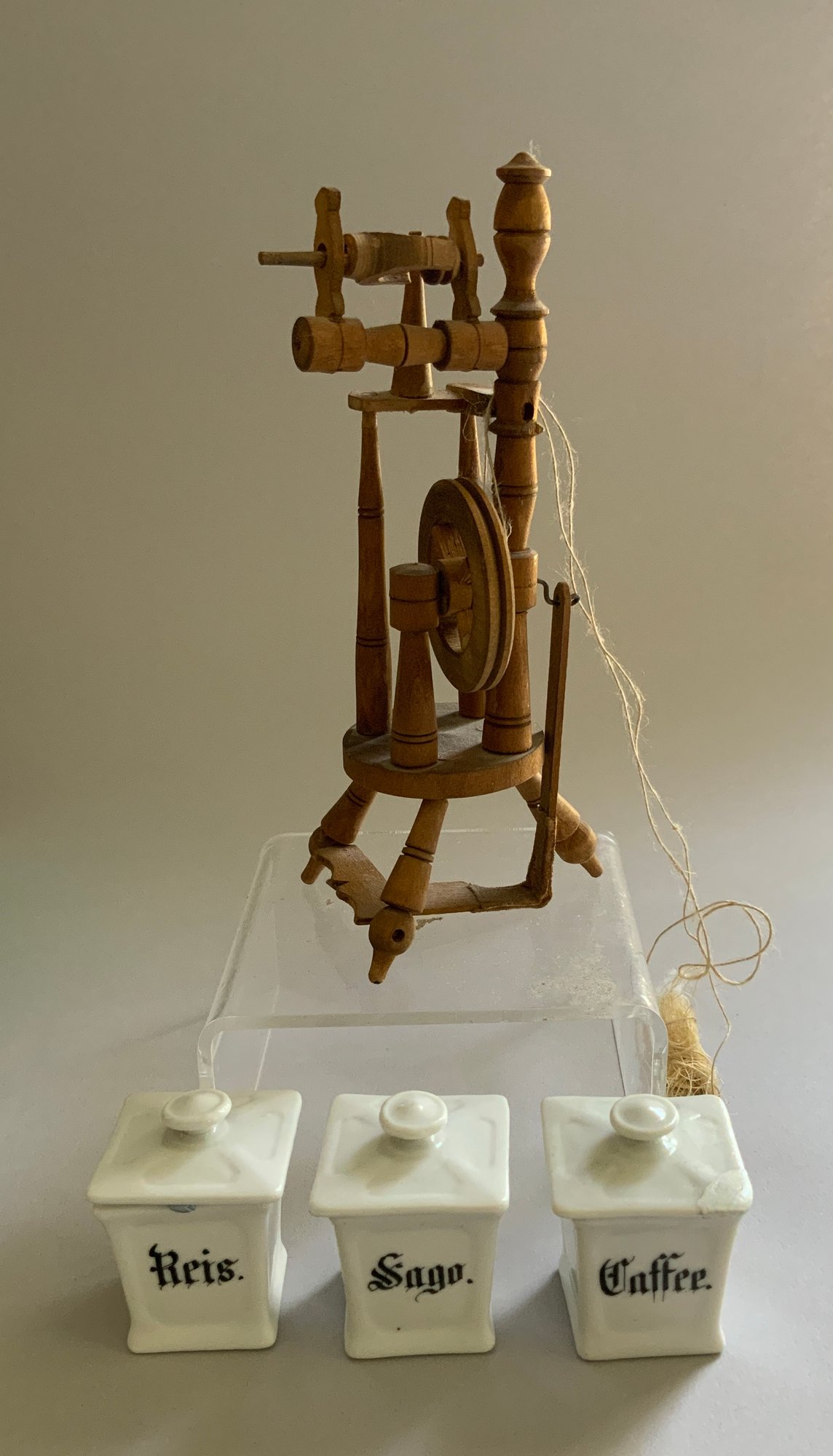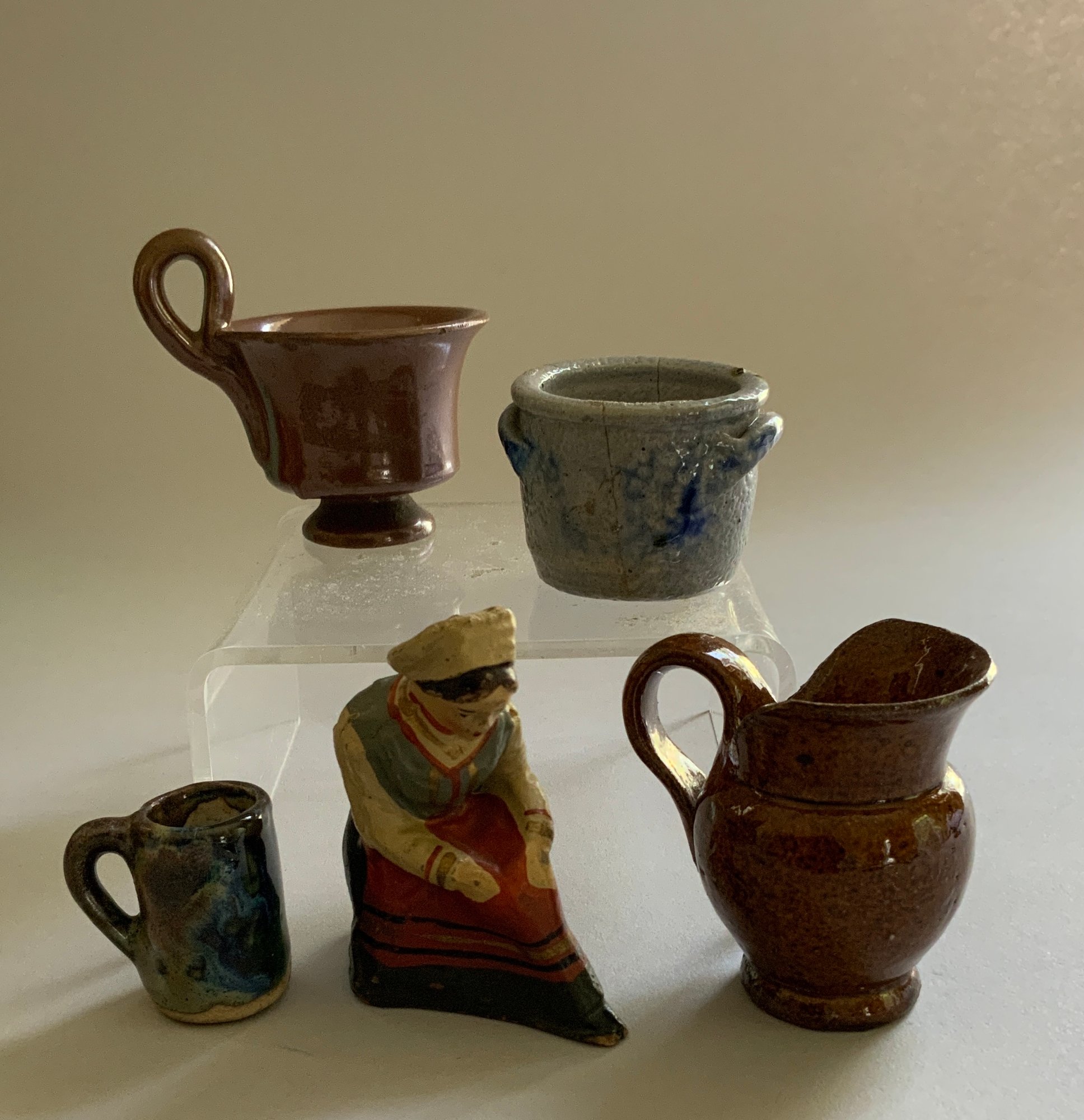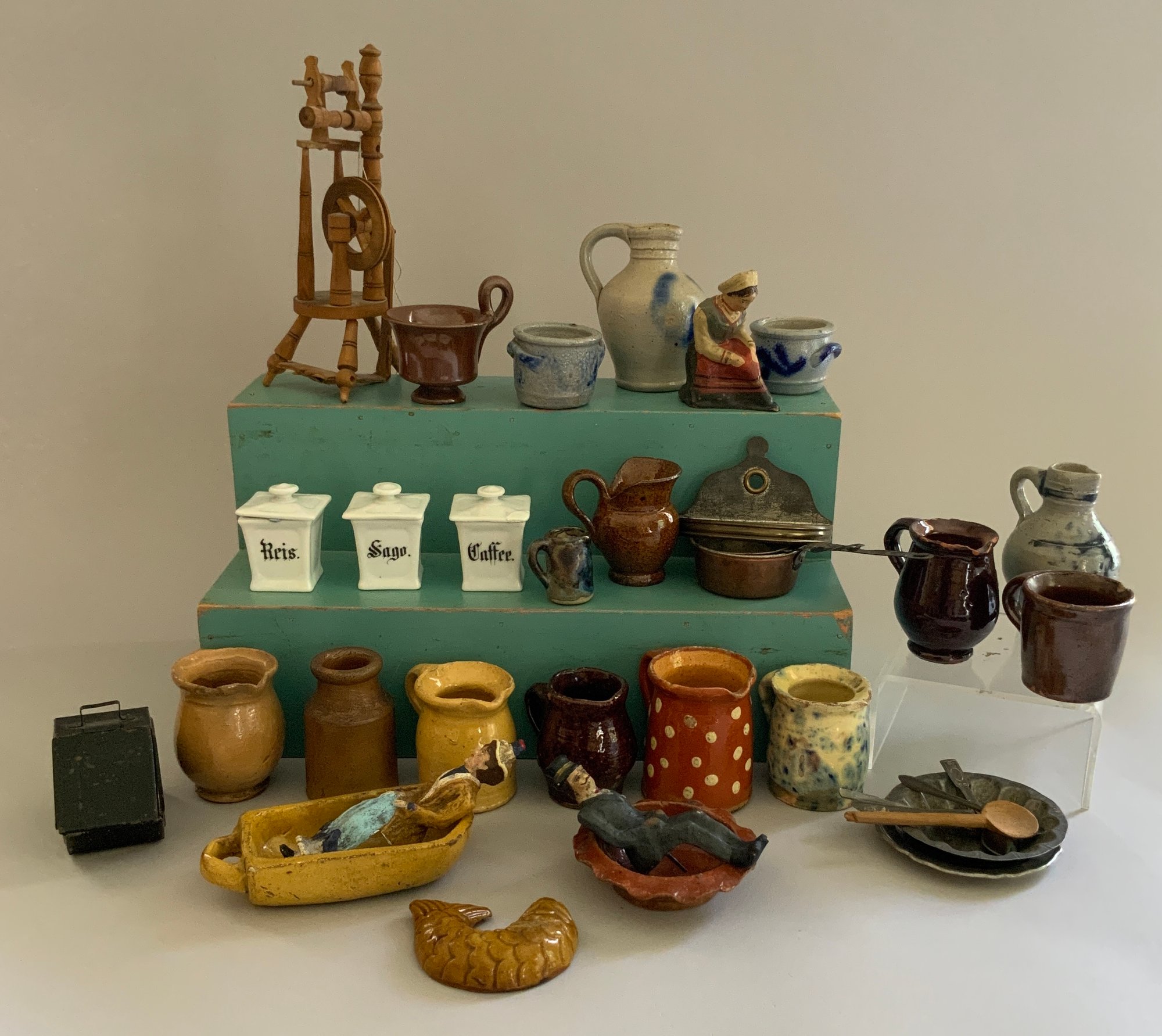 Lot of assorted doll miniatures, early stoneware, tin ware, flax wheel, etc.