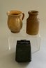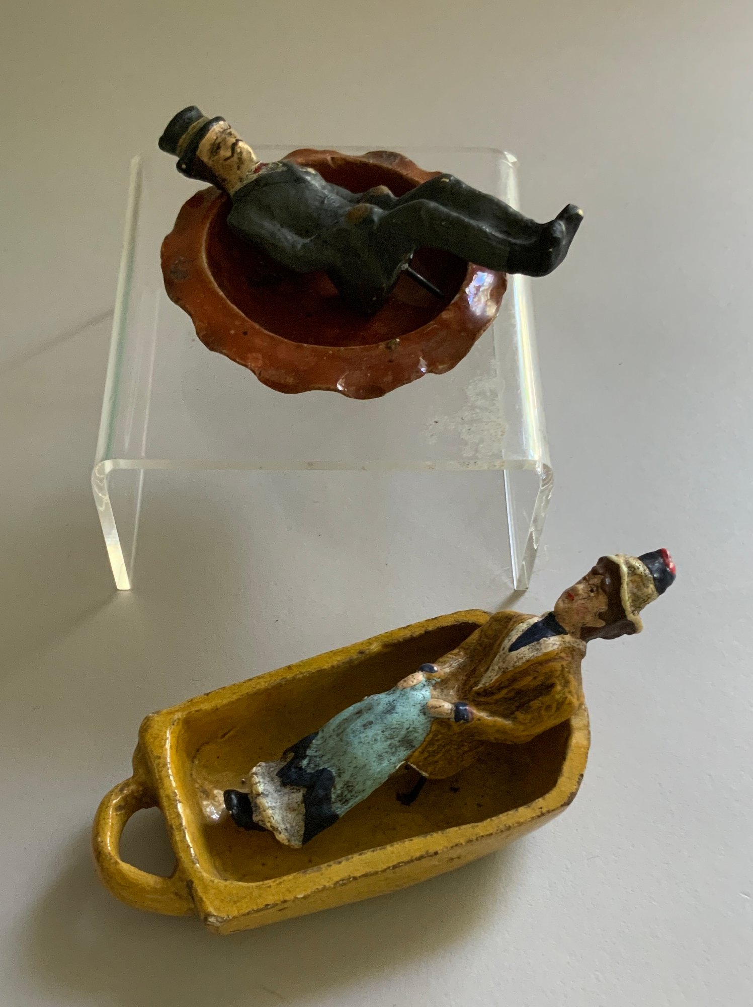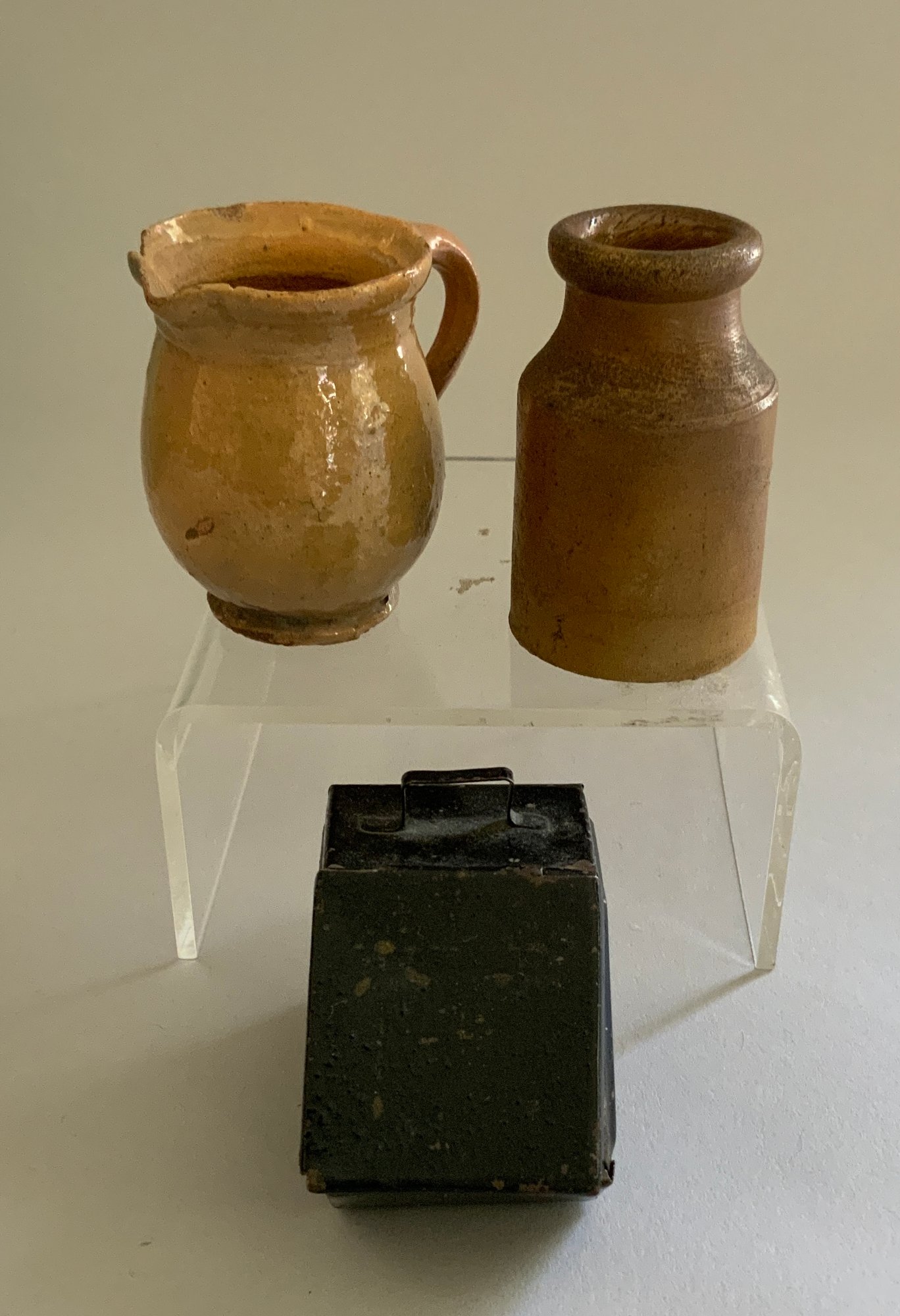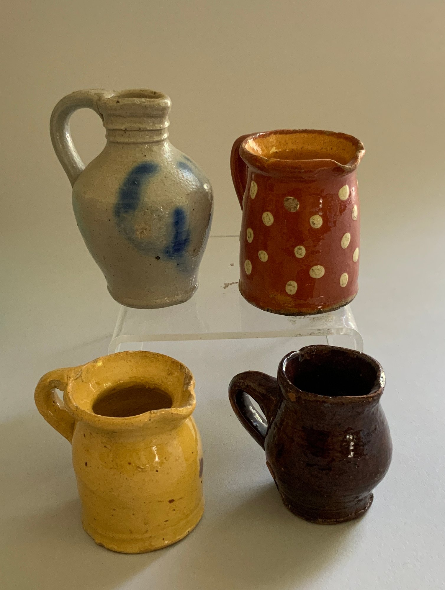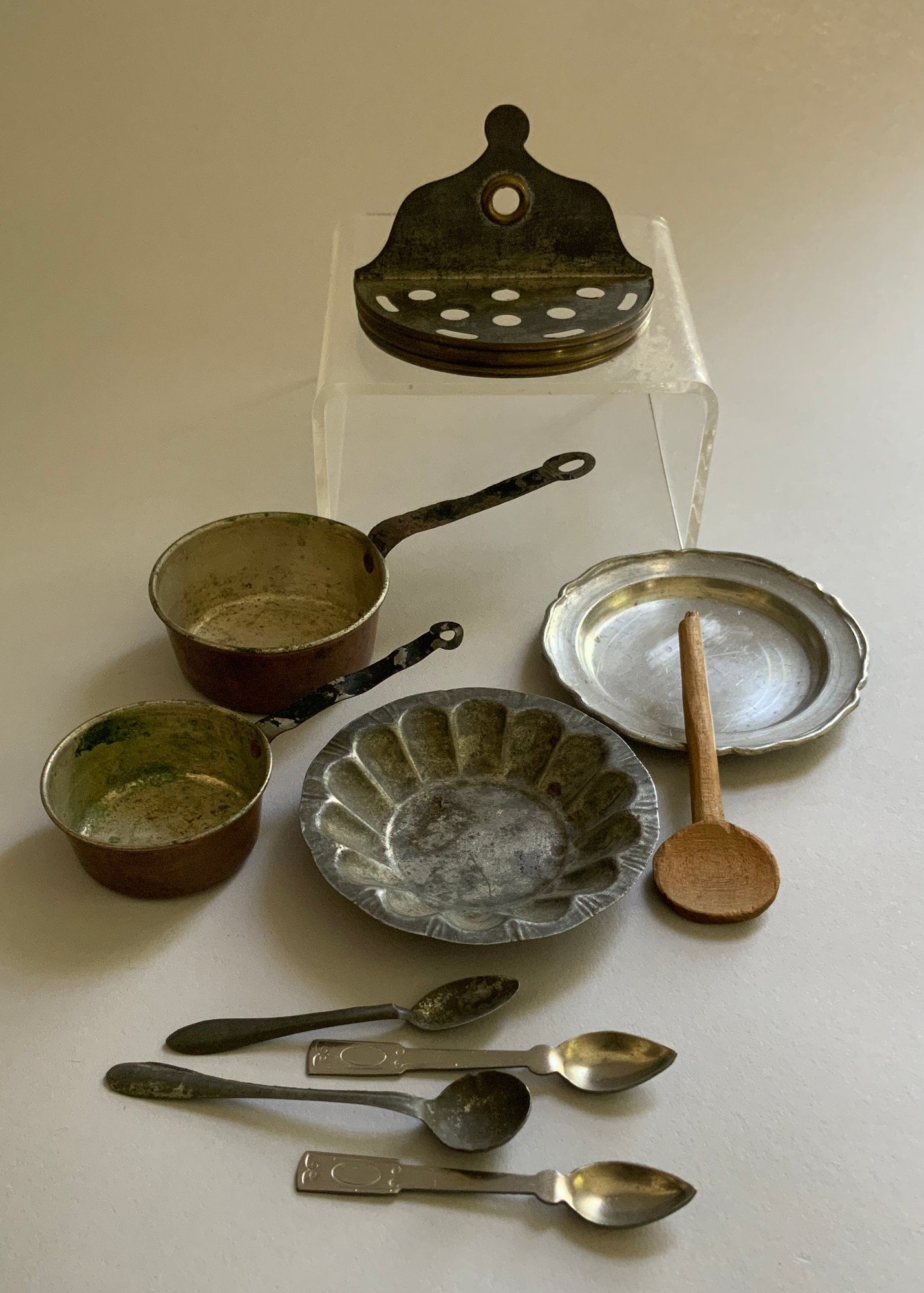 Lot of assorted doll miniatures, early stoneware, tin ware, flax wheel, etc.