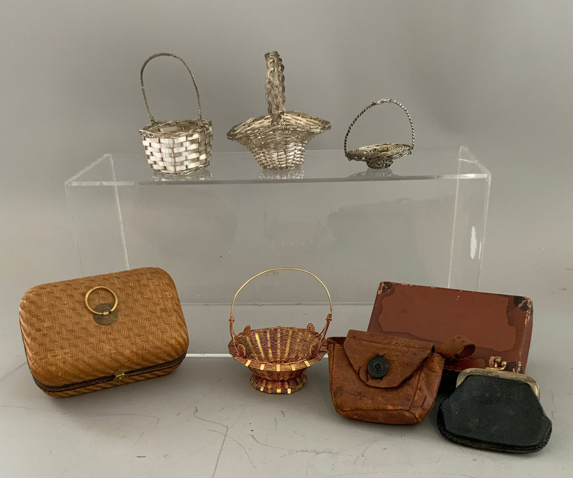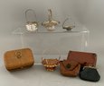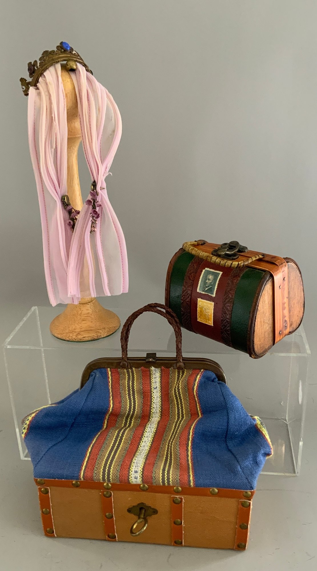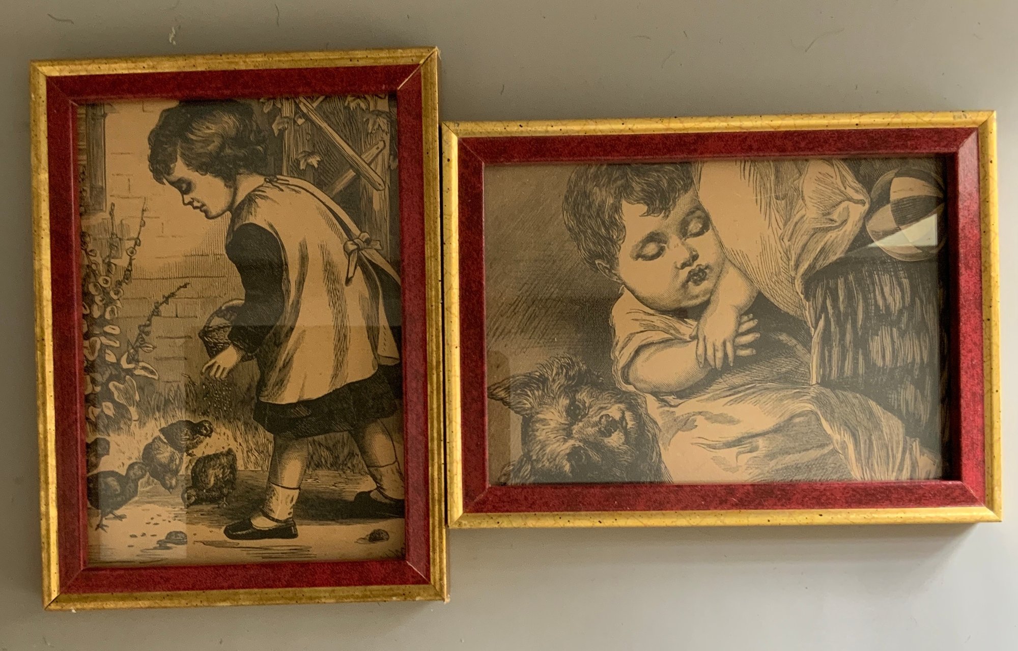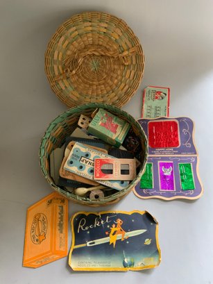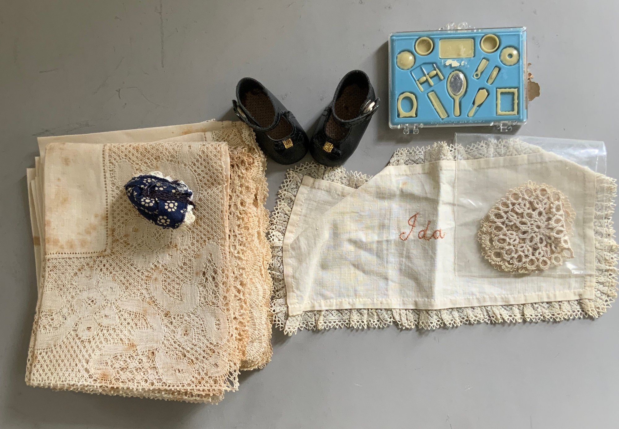 Lot of assorted items, wicker sewing basket full of sewing items, French style miniature suitcases, lot of 12 antique hankies with lace borders, 2 framed engravings of children 8” long, etc.
