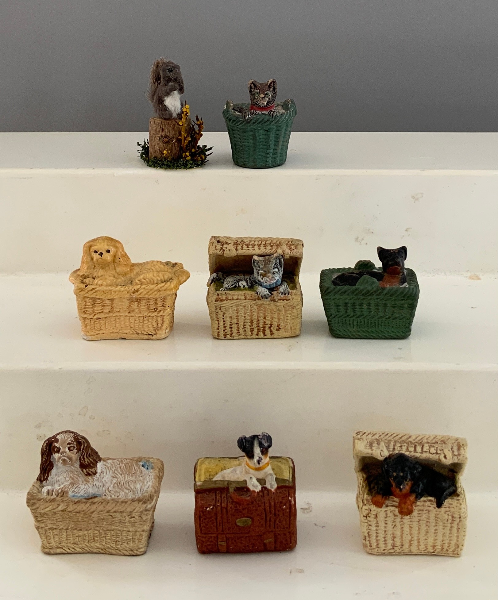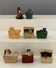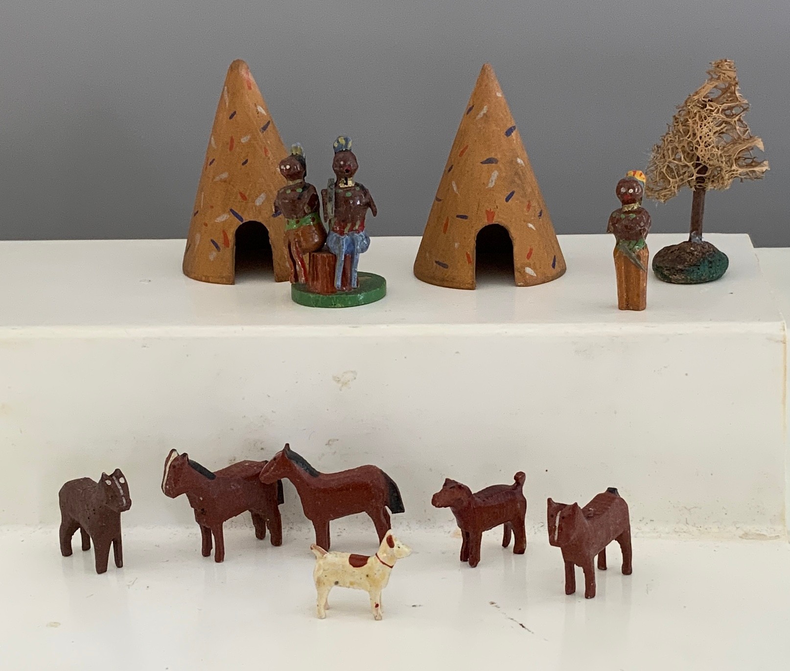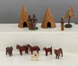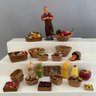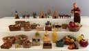 Lot of assorted miniatures, baskets, fruits & veggies, ceramic animals in baskets, teepee village