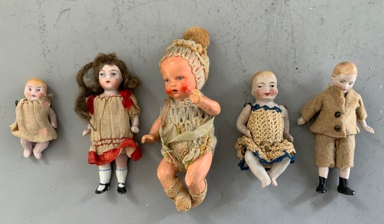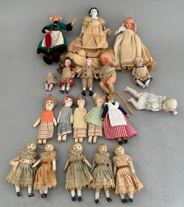 Lot of assorted small dolls 1 34” – 5”, Parian, china, all bisque, comp, cloth, Beccasine, etc.