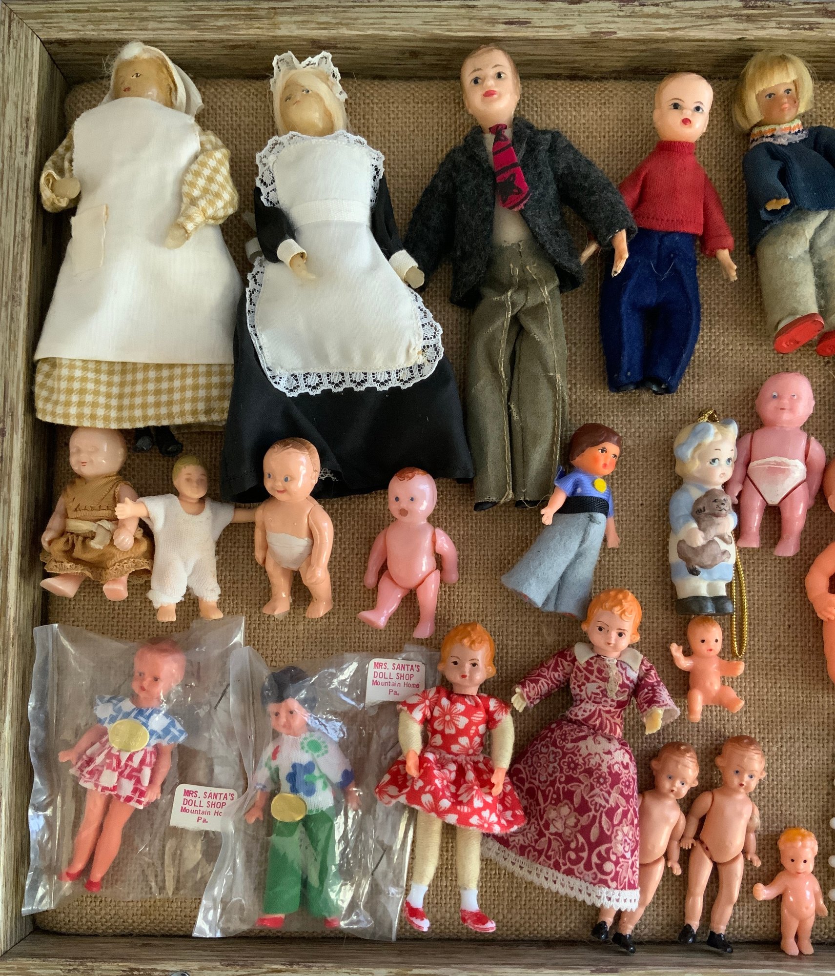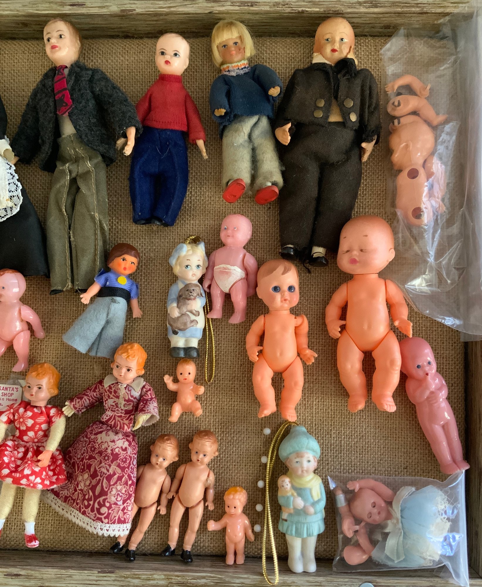 Lot of assorted small dolls, 1 ½” – 5” tall, wax, bisque, celluloid, etc.