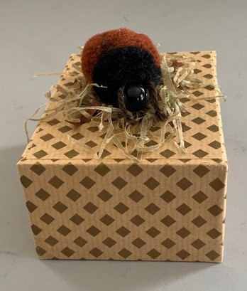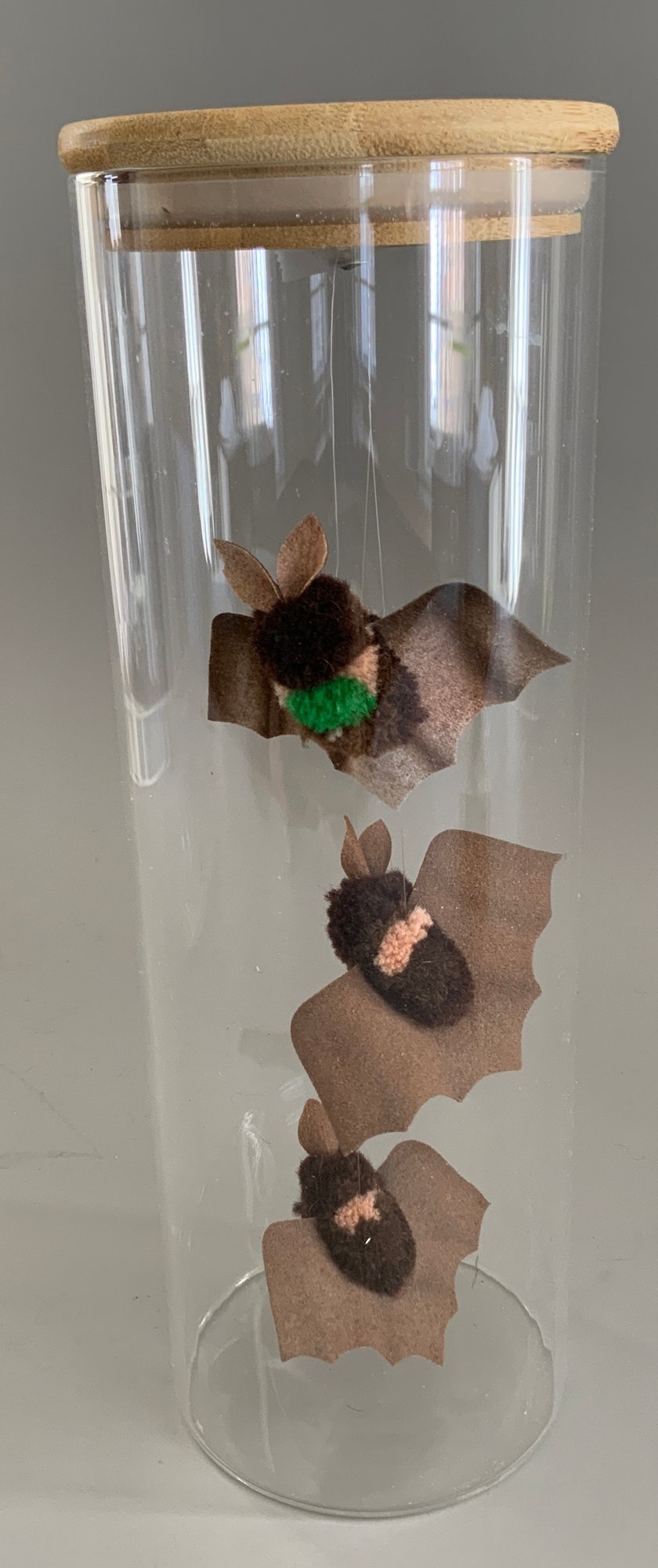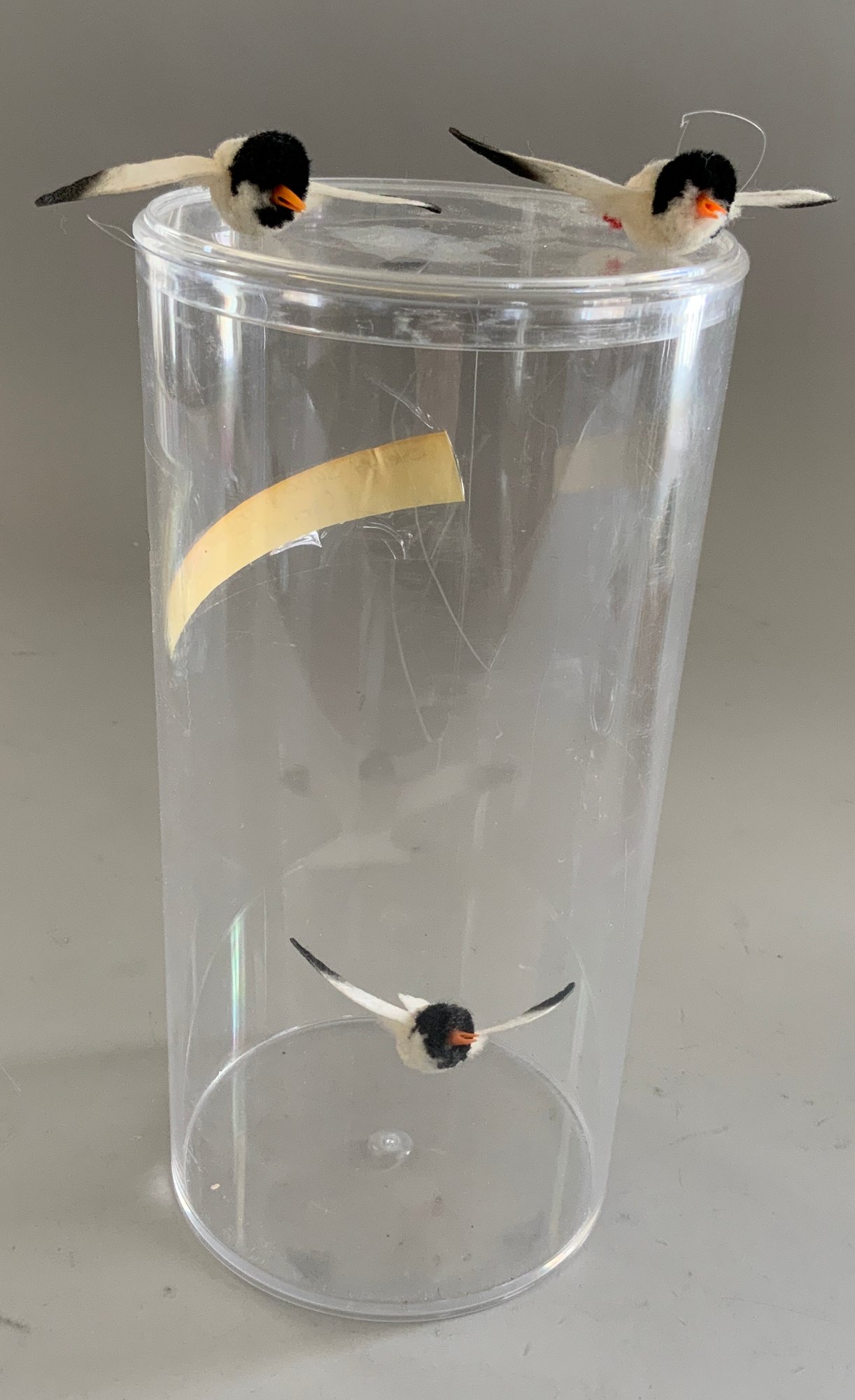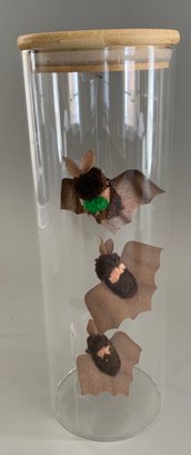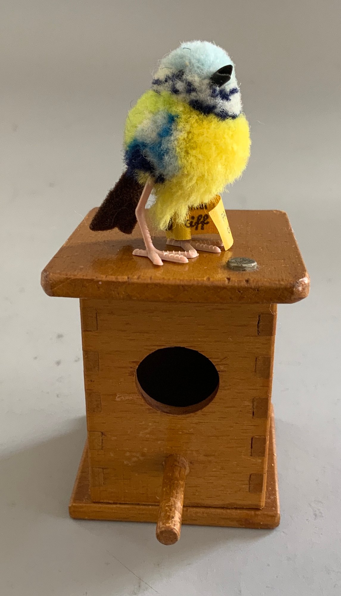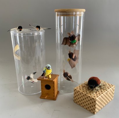 Lot of assorted small Steiff items, 3 β Bats hanging in a glass cylinder, 3 β Seagulls for a mobile, 2 ΒΌβ Cockroach, & small bird & wood birdhouse
