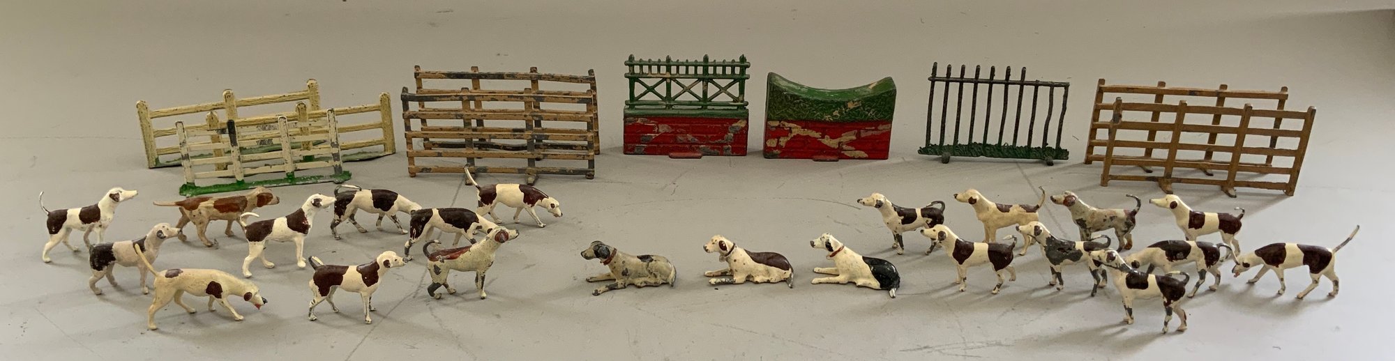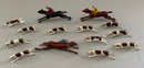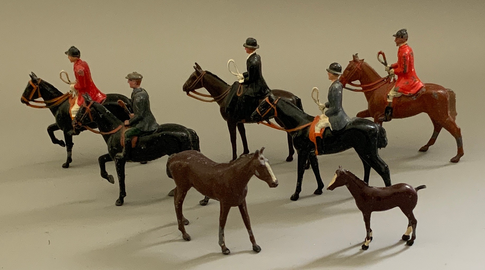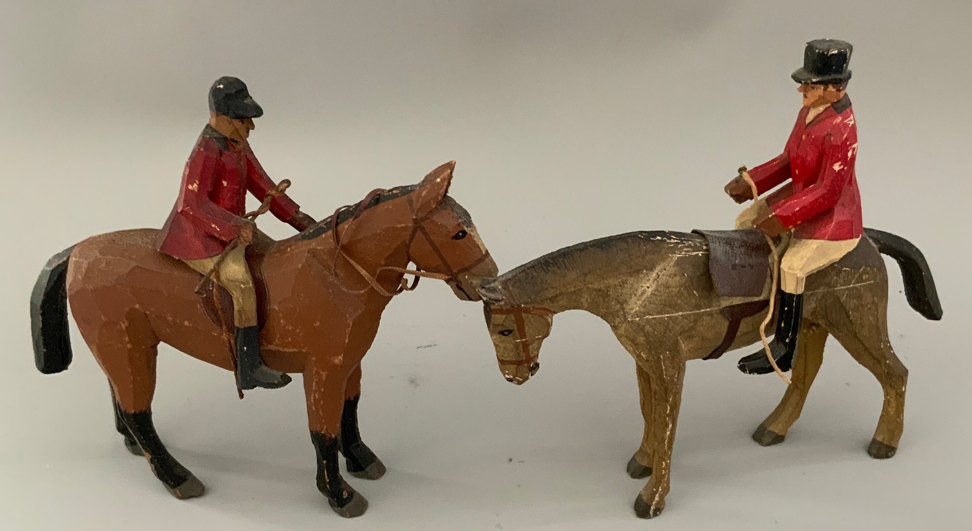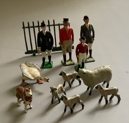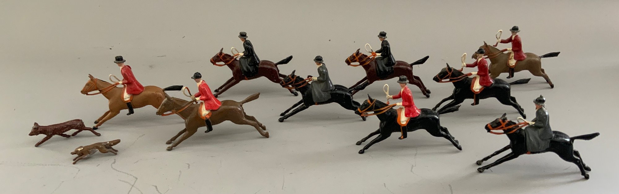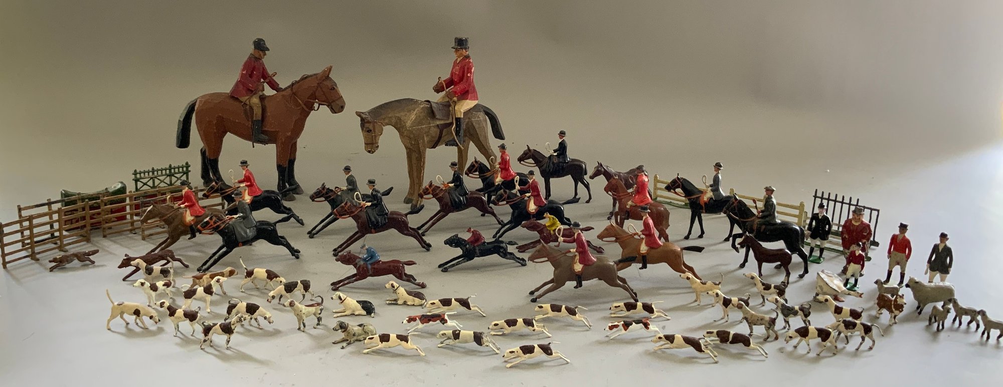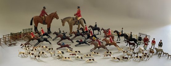 Lot of Britains fox hunt riders on horses, hounds & fences along with 3 jockeys & riders and 2 wood carved & painted fox hunt riders & horses 7” long