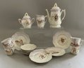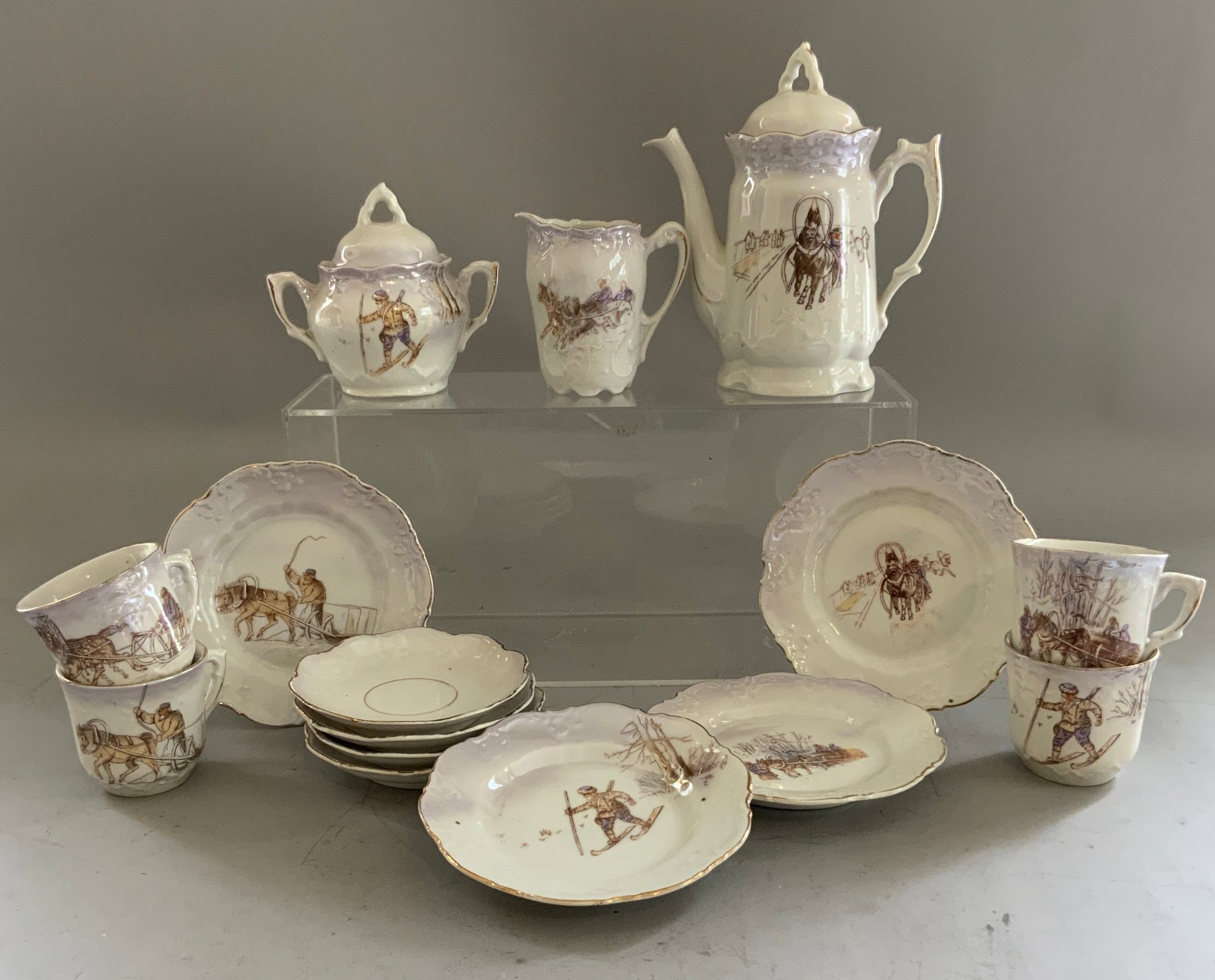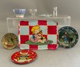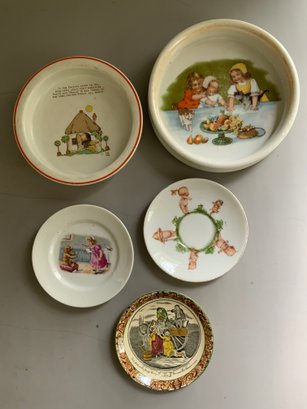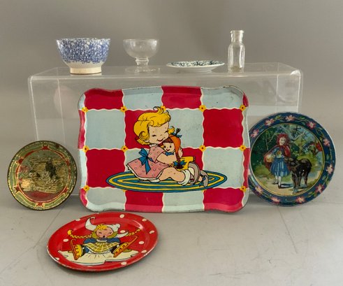 Lot of child’s china, 15 pcs. German gold rim rural scene cups, saucers, etc., 6 ¼” Shelley England bowl, 7 ¼” cat & children bowl (bottom crazing), 3 - 5” plates, & 4 pcs of decorated tin ware
