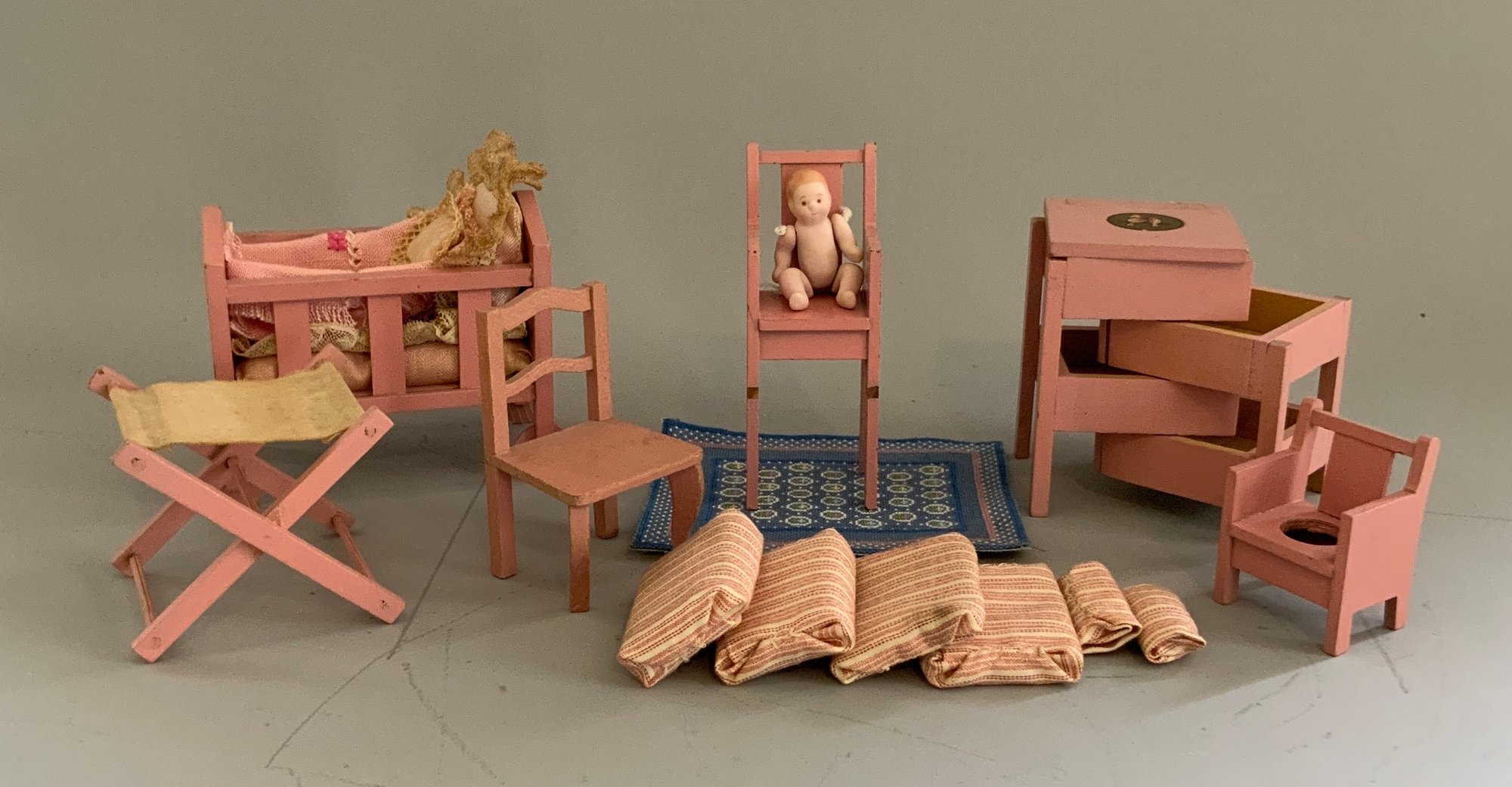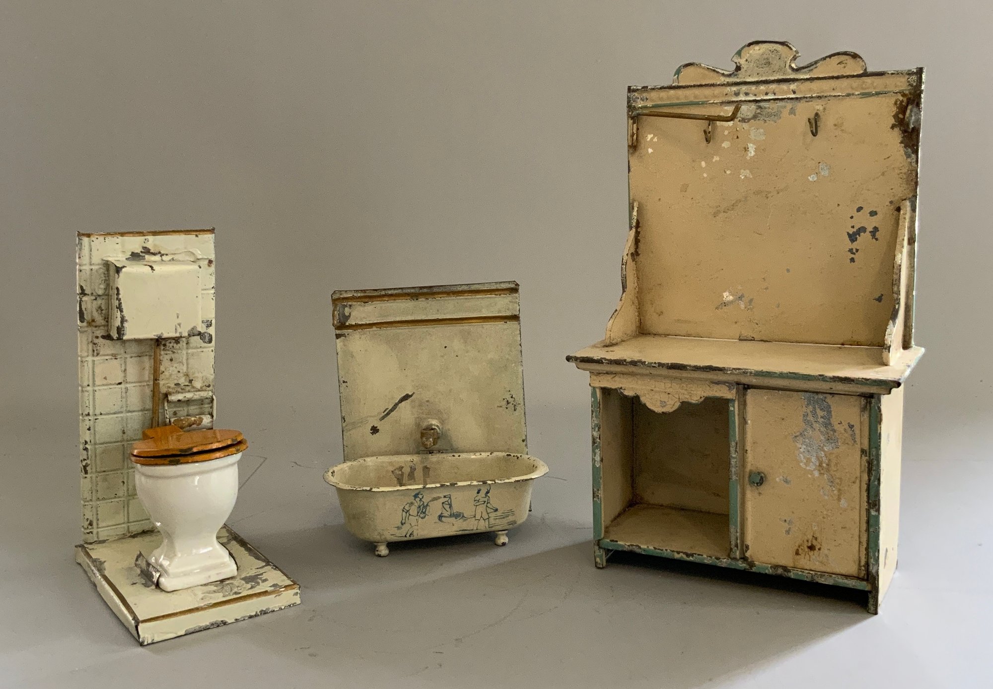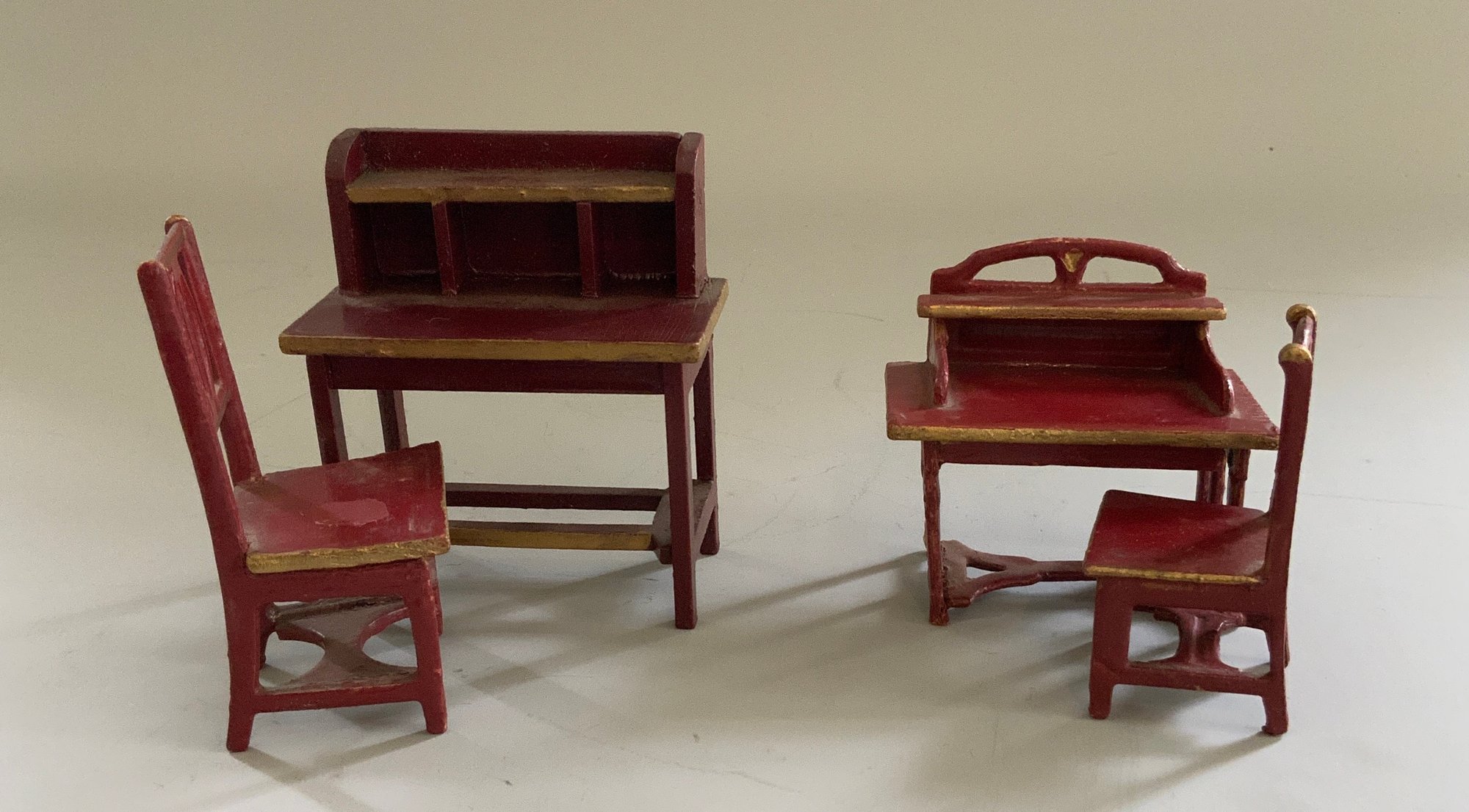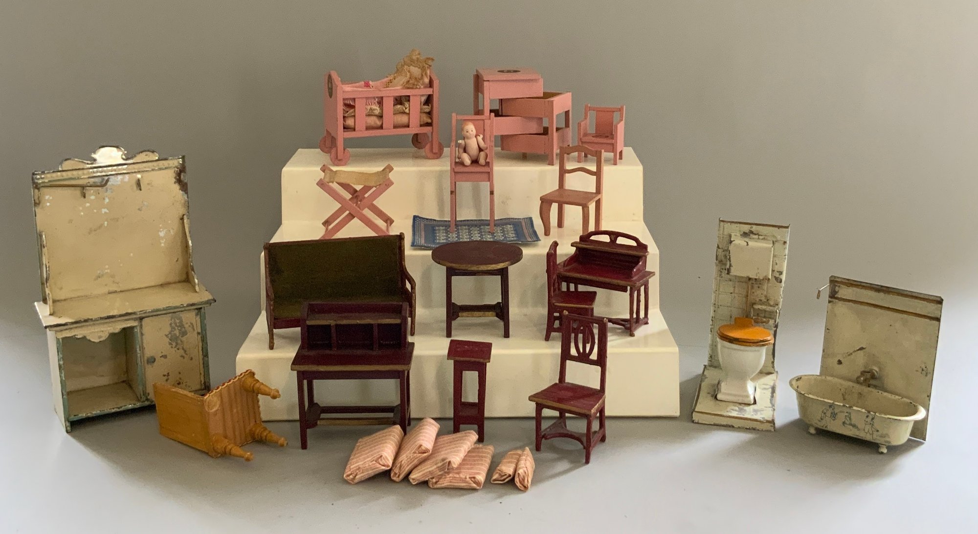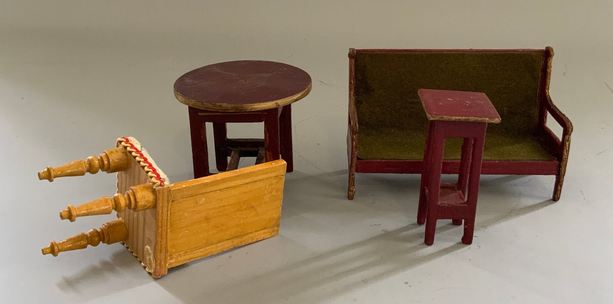 Lot of doll house miniature furniture, 7 - red/gold painted Gottschalk furniture, & 3 pieces of tin bathroom furniture, (played with condition)