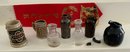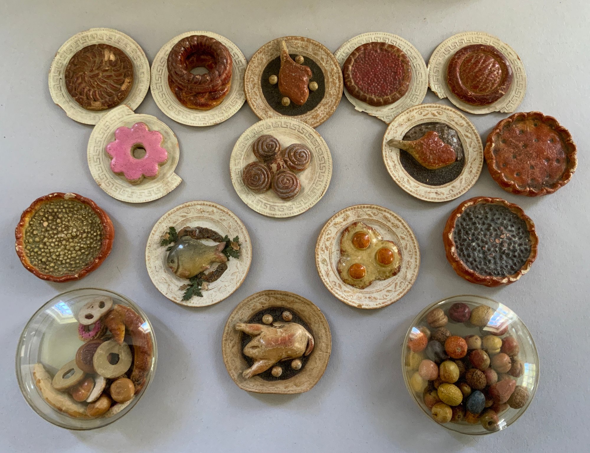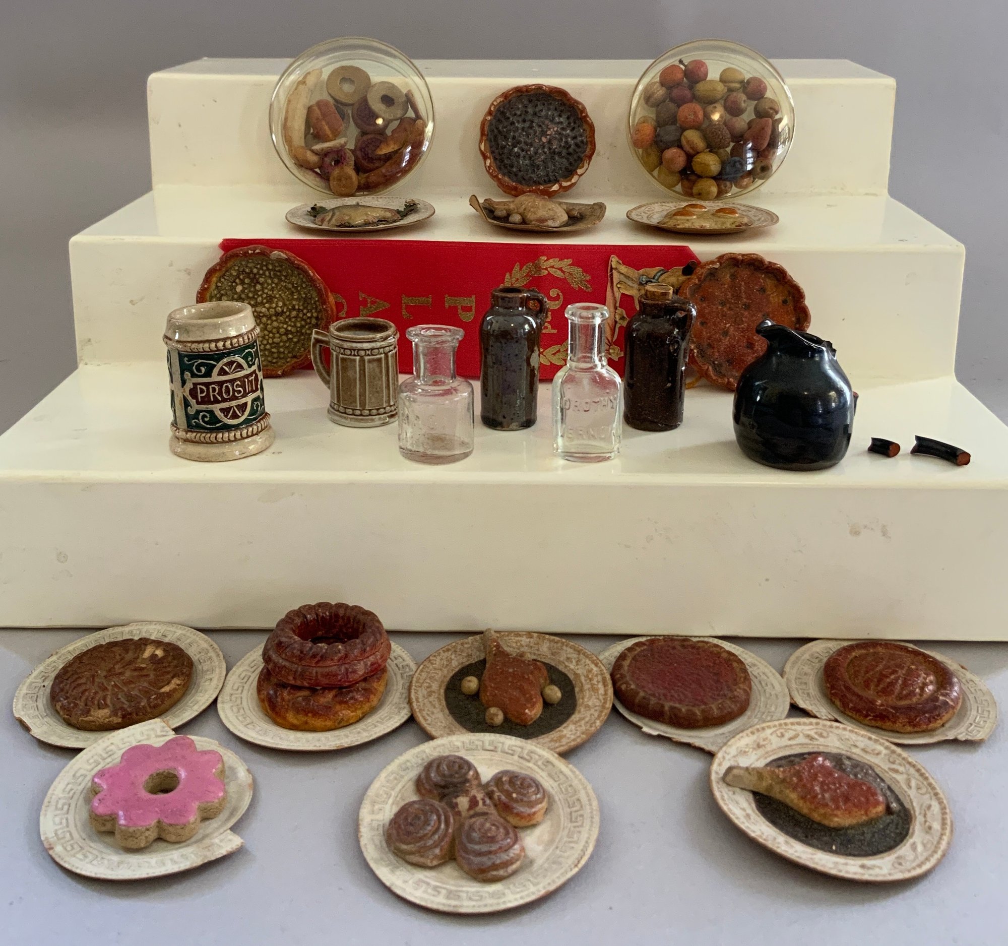 Lot of doll house miniatures: 14 platters of Papier Mache Doll house food: Pastries, Fish, Eggs, Chicken, etc., asst fruit, bakery items, cakes, & 7 serving pcs. Steins Jugs, medicine bottles, etc.