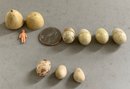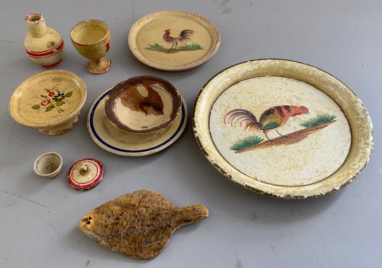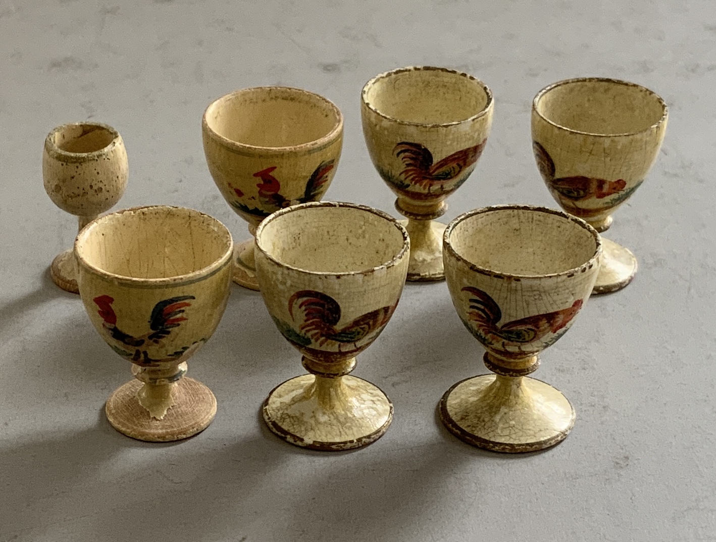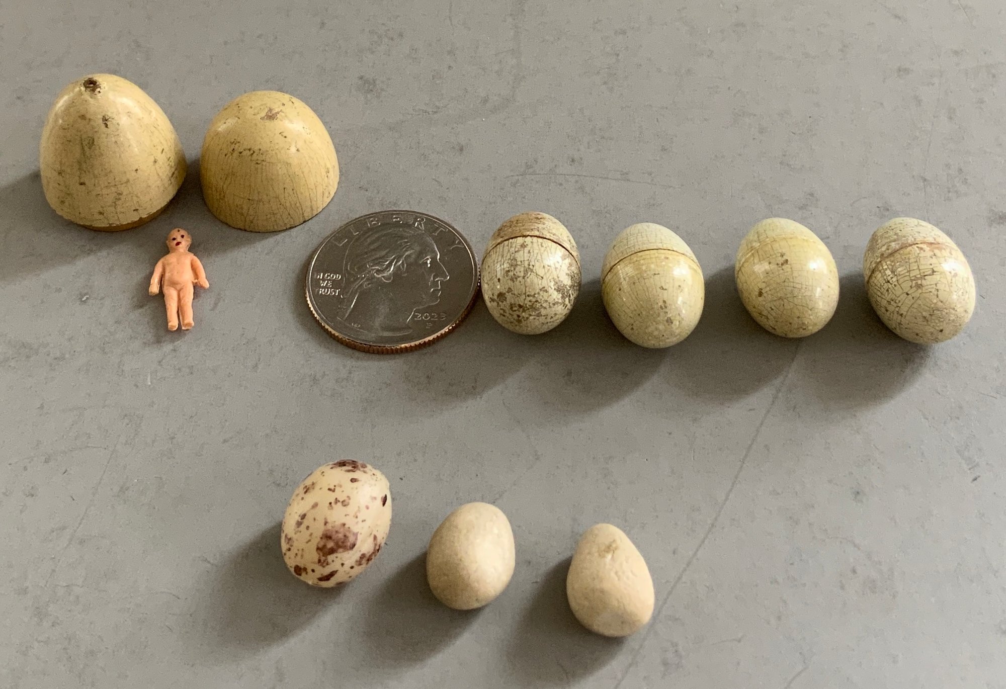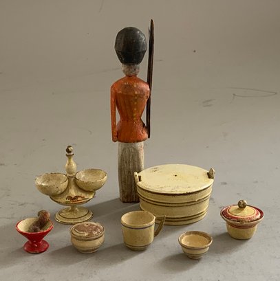 Lot of early miniature paint decorated wooden ware, plates, bowls, goblets, cups, 2-piece tiny eggs, & 1 – 3 ½” peg wood soldier