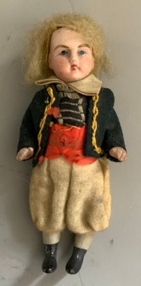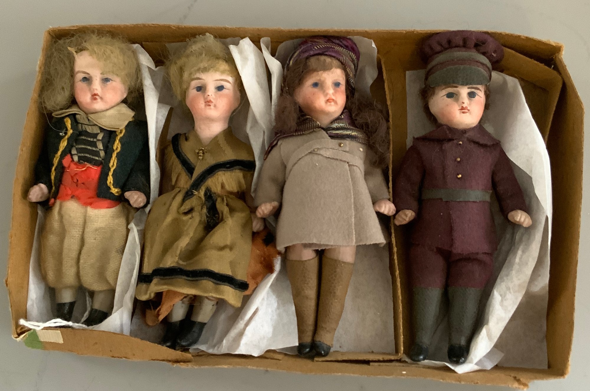Lot of four – 4” All Bisque dolls: c/m, ptd eyes, mohair, in original costumes, orig. box (as is shelf dust