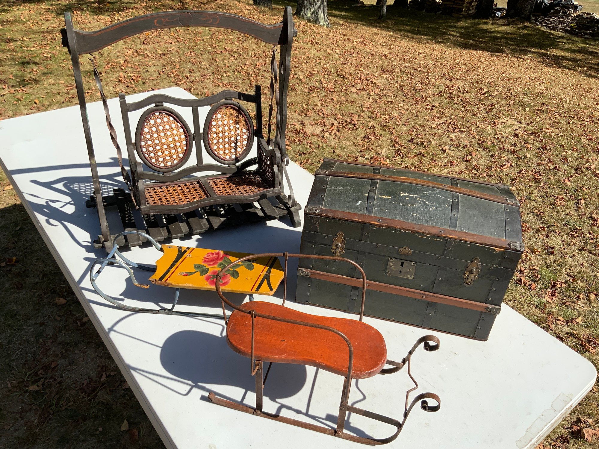Lot of four various wooden items. One 19.5”x20.5” wooden doll swingset. One 16”x10” small wooden chest. One 14.5”x9.5” small wooden sled. One 15”x5” small wooden sled with floral motif, sled is broken.