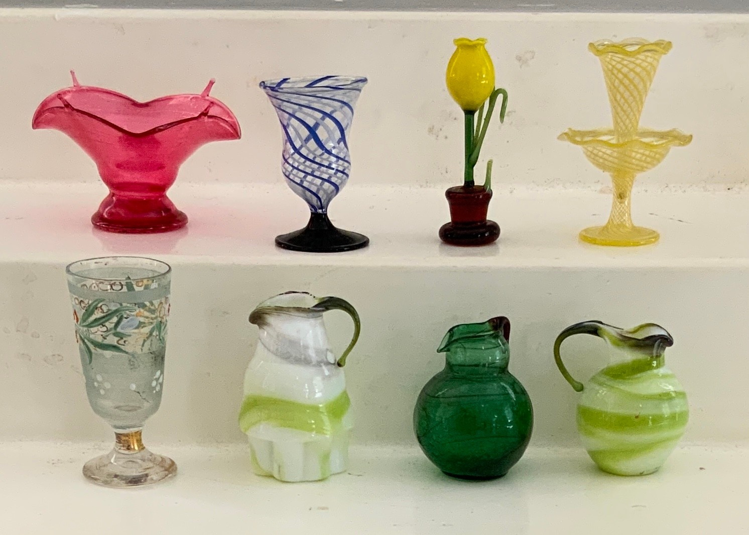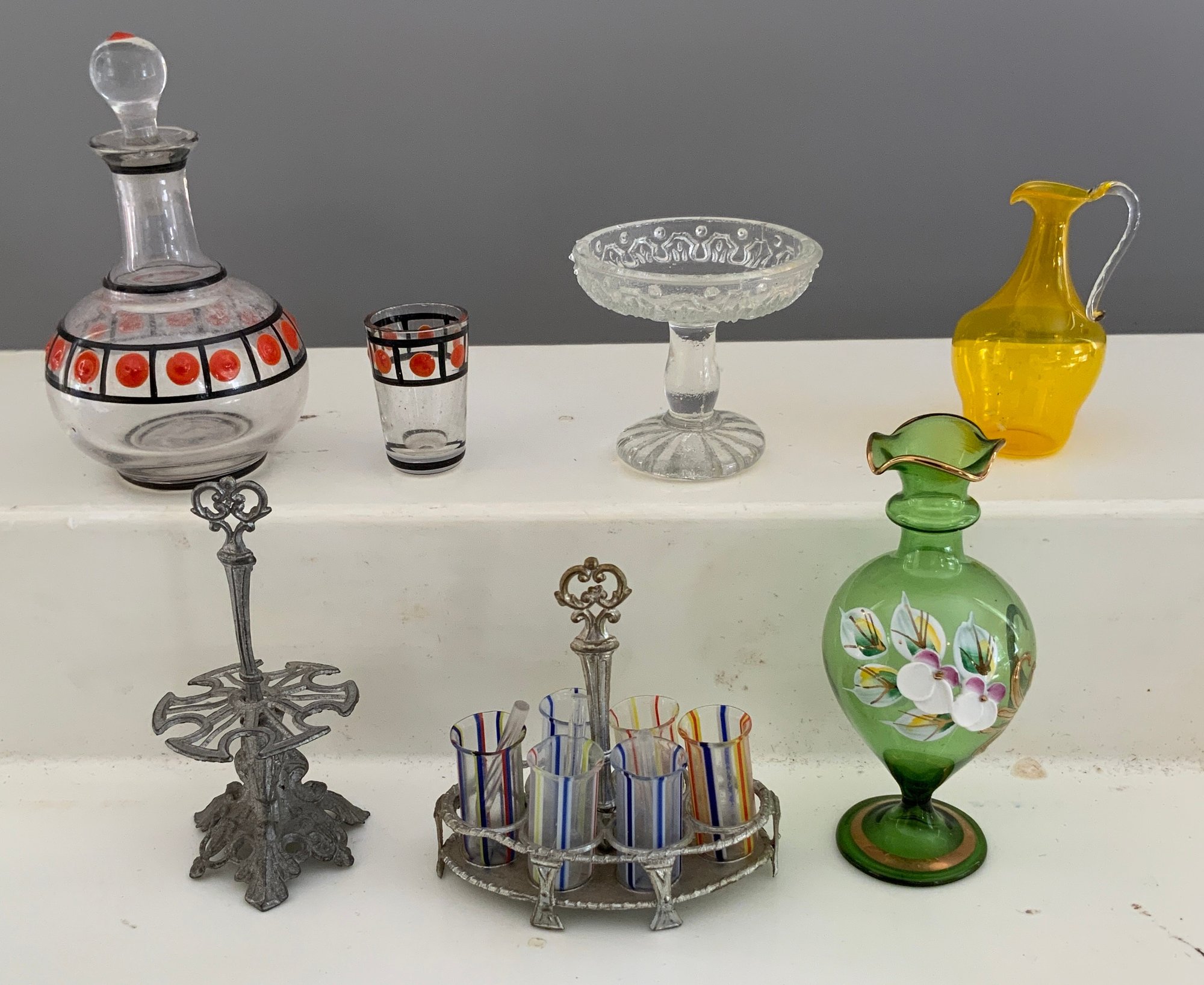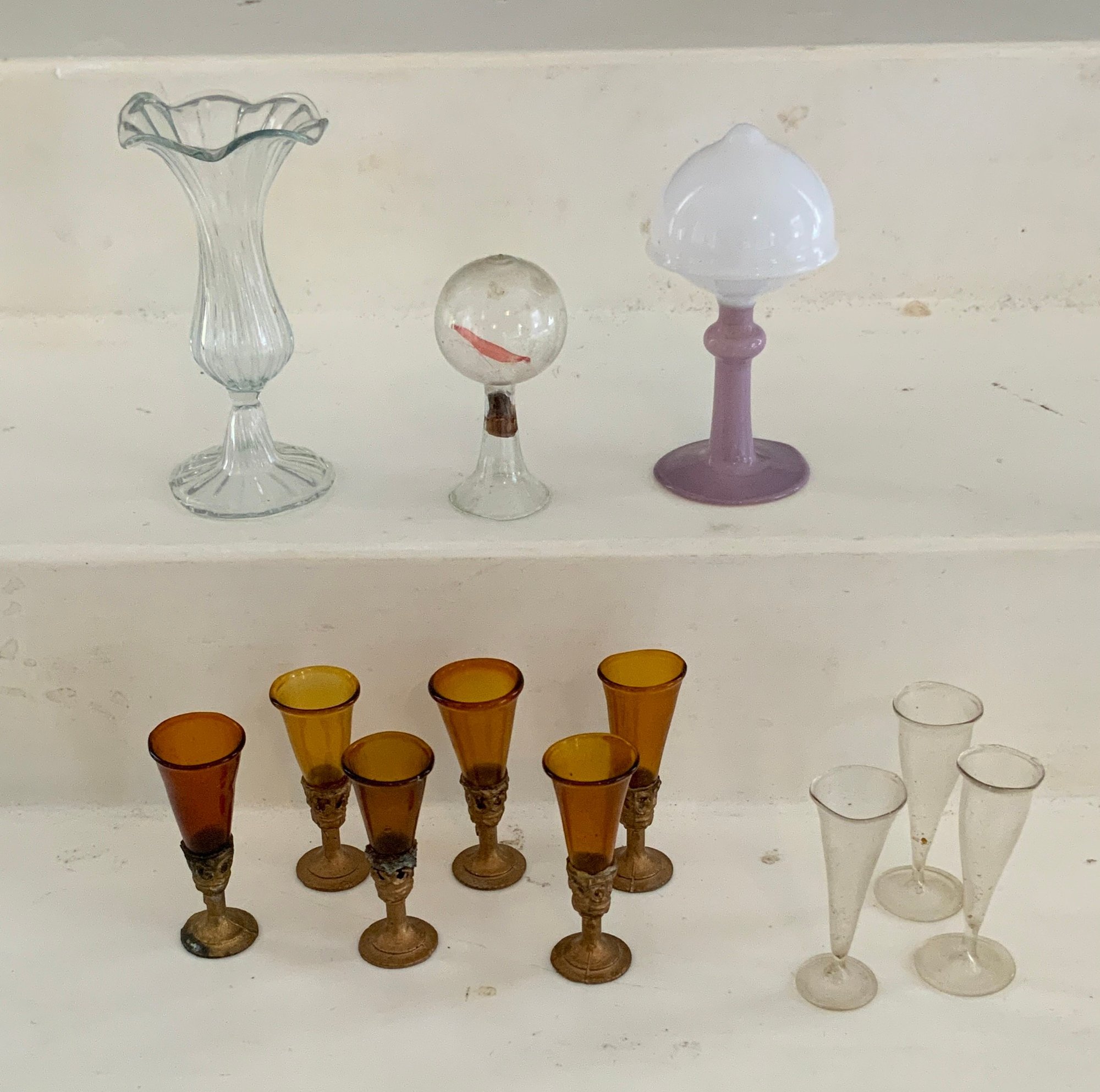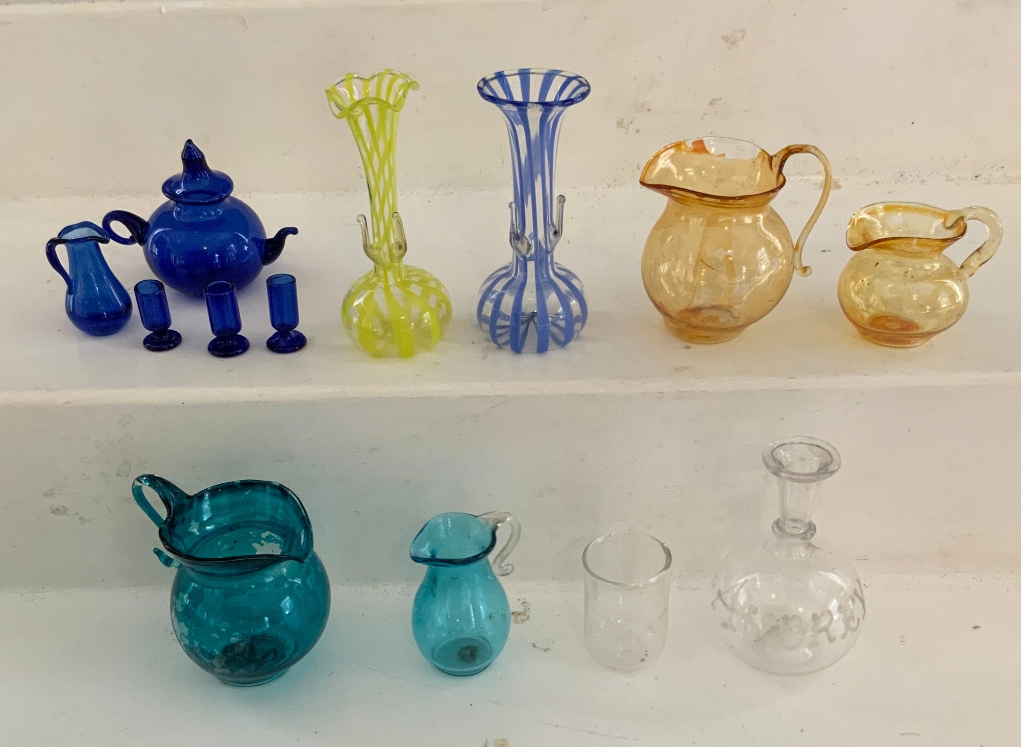 Lot of glass & blown glass doll house accessories, pitchers, stem ware, etc.