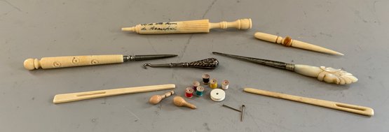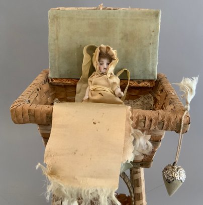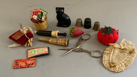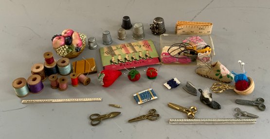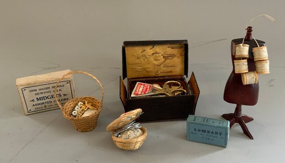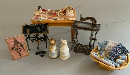 Lot of miniature sewing accessories, sewing machines, baskets, thimbles, & 12” sewing basket stand with basket top & small bisque doll