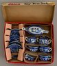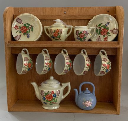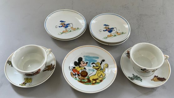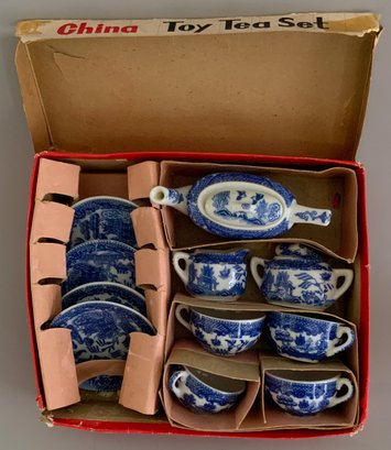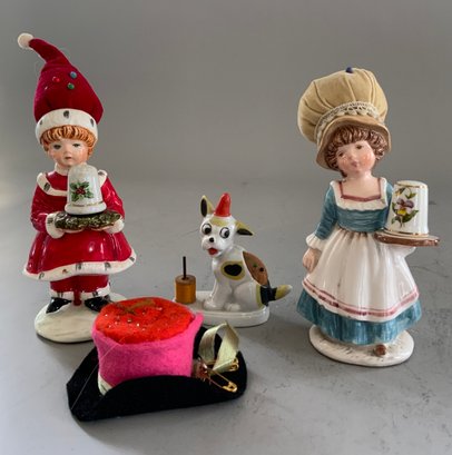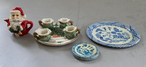 Lot of miniature tea sets, Mickey Mouse Japan, blue willow, Santa, & Schmid figural sewing items, etc.