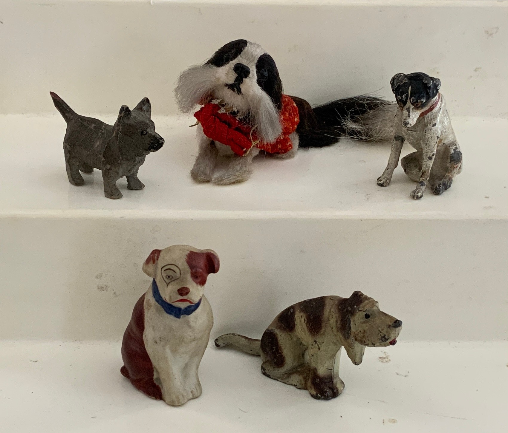 Lot of misc. vintage animals of various compositions, metal, wood, etc., reindeer & dogs, 2” – 6” long