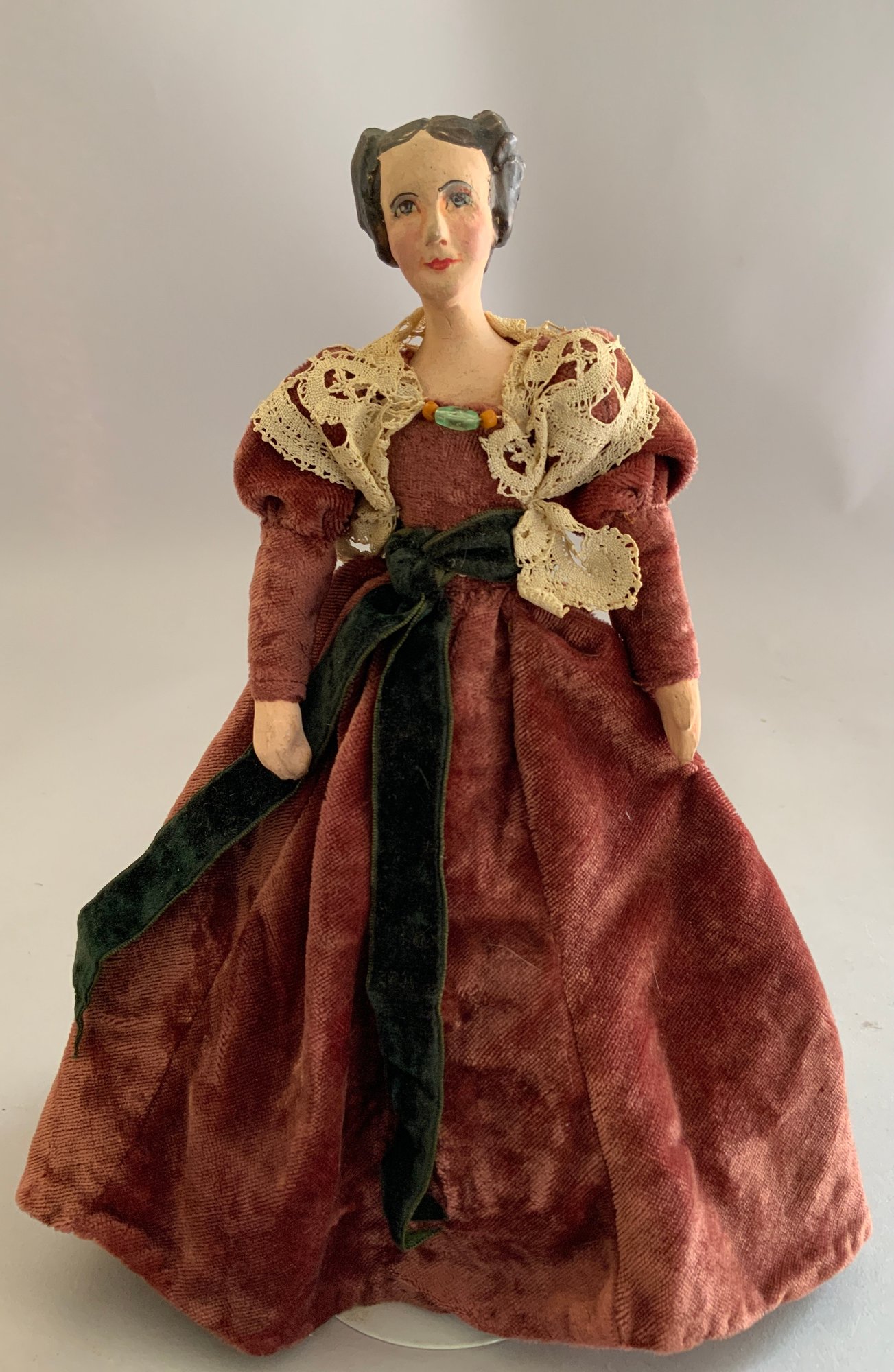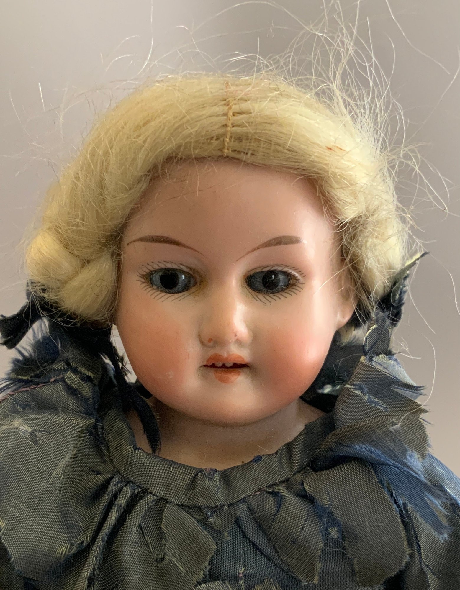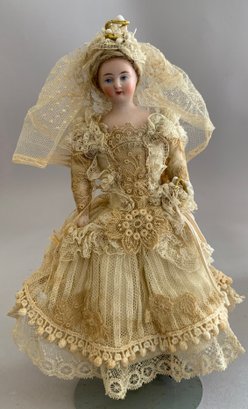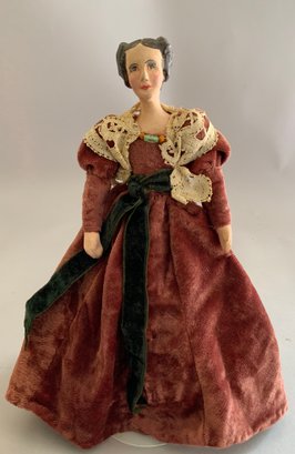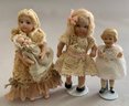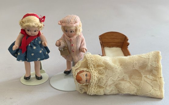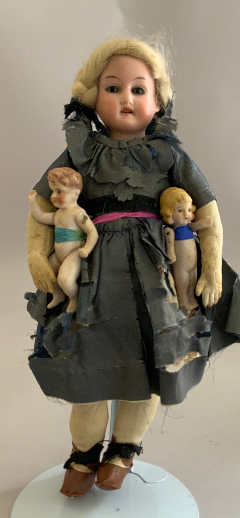 Lot of miscellaneous dolls, 6 – Small 2”-3” Hedi Ott bisque dolls, 11” AM370 holding 2 small all bisque dolls, blue dress (melting), 1 – 8” bisque shoulder head 560?, cloth body, 9 ½” artist doll of Anna Symmes Harrison wife of William Henry, molded, painted features, red velvet gown, Skinner tag
