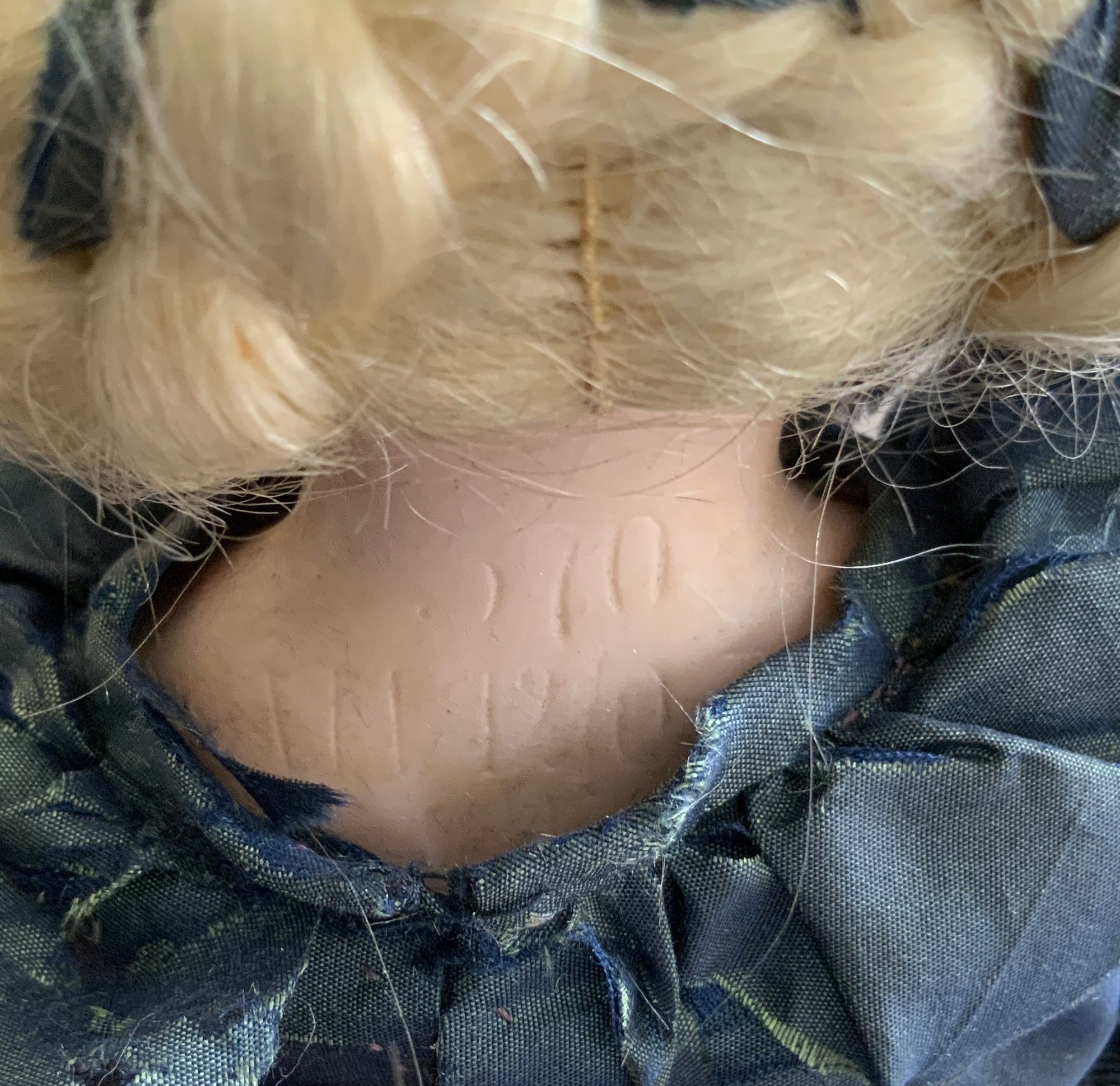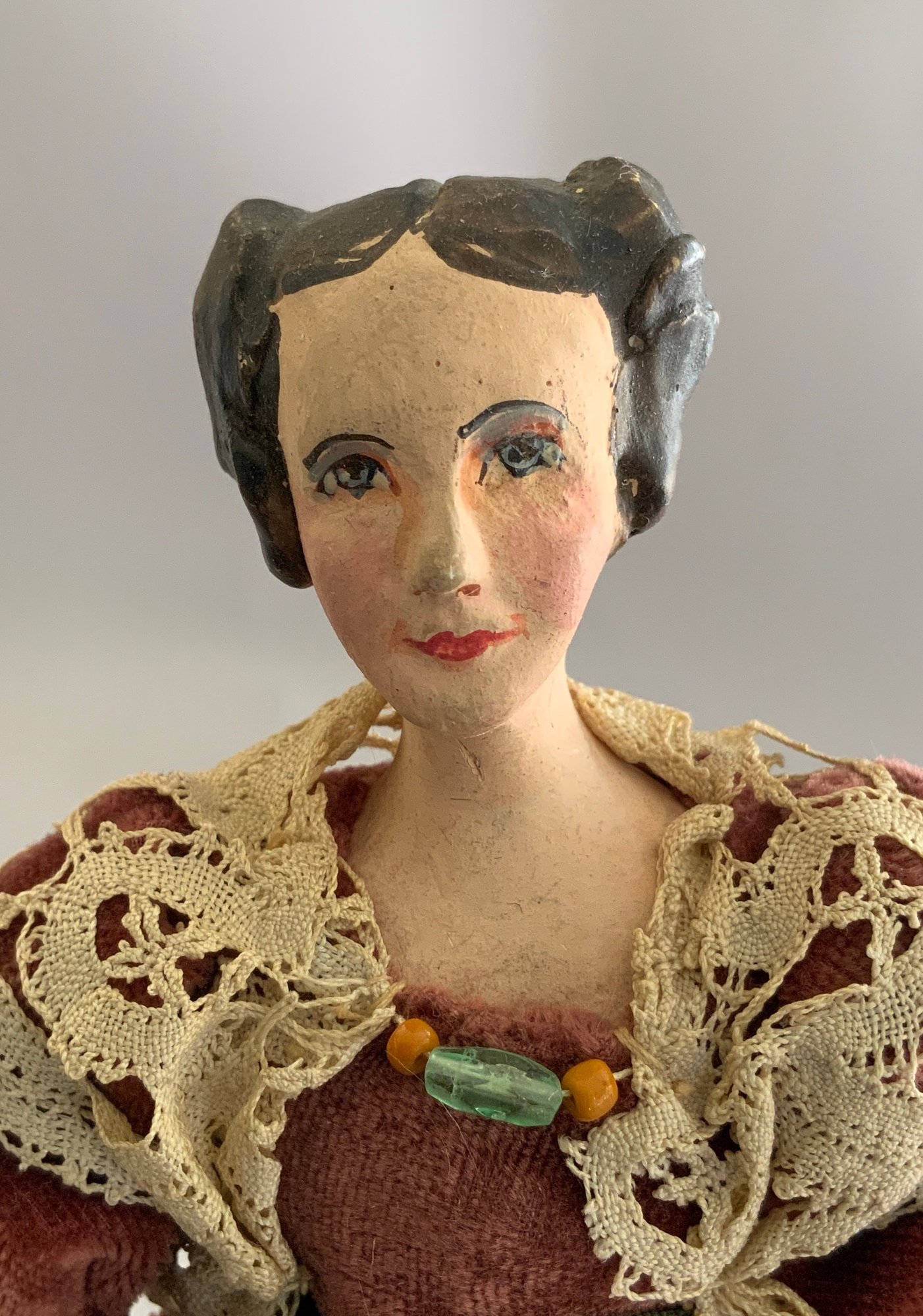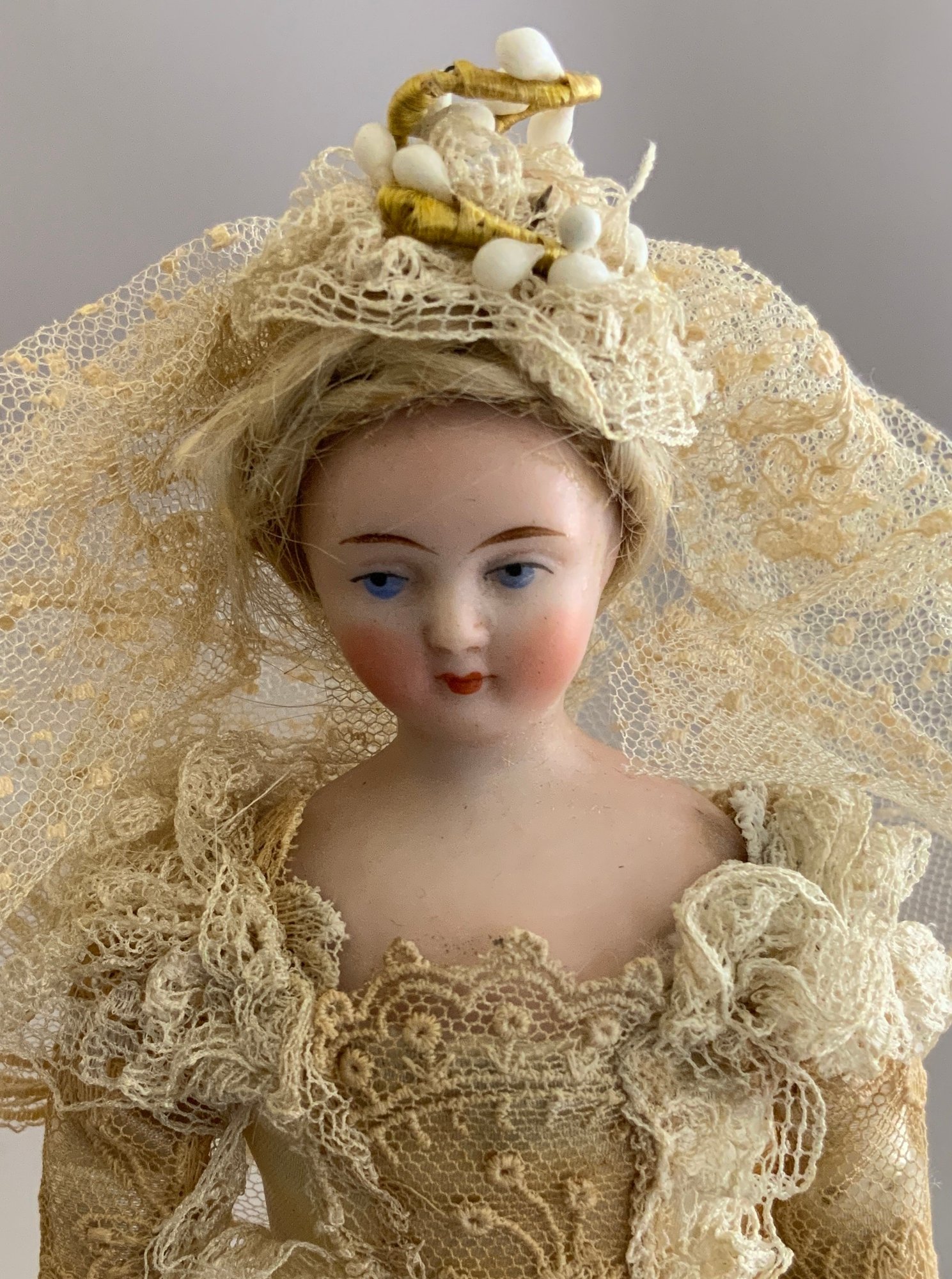 Lot of miscellaneous dolls, 6 – Small 2”-3” Hedi Ott bisque dolls, 11” AM370 holding 2 small all bisque dolls, blue dress (melting), 1 – 8” bisque shoulder head 560?, cloth body, 9 ½” artist doll of Anna Symmes Harrison wife of William Henry, molded, painted features, red velvet gown, Skinner tag