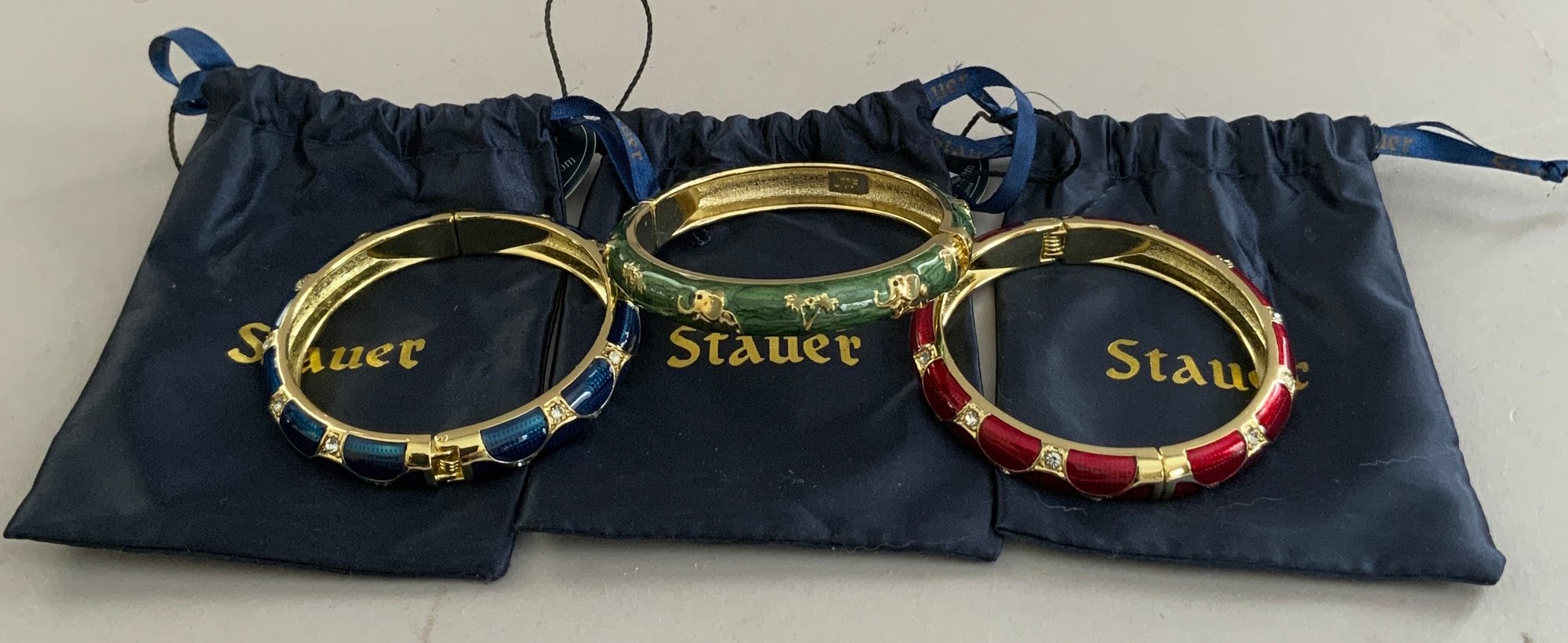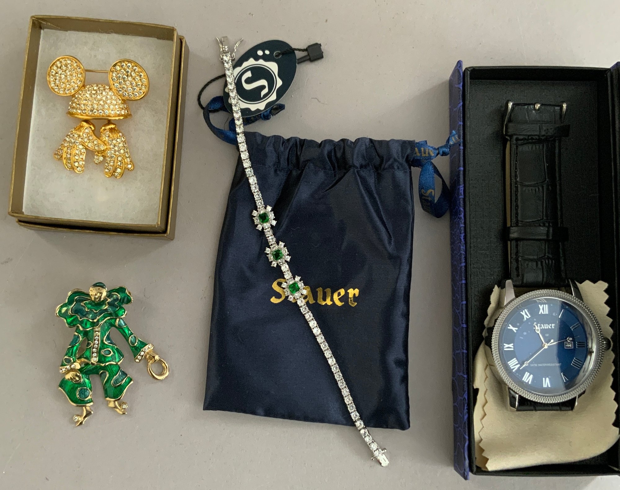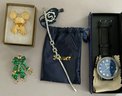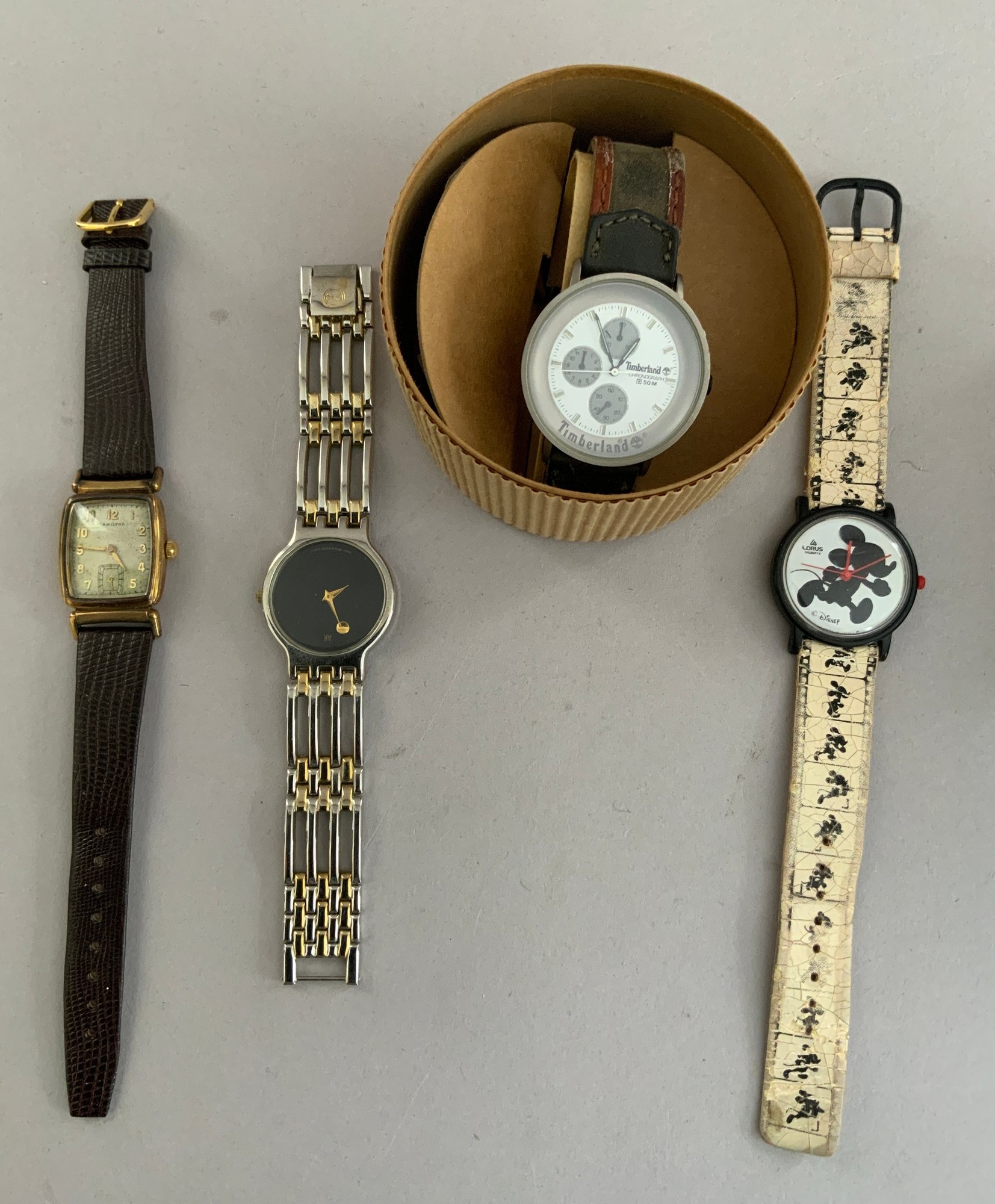 Lot of modern watches & jewelry, Timberland wrist watch 48148 10401 3 in original box, Stauer urban blue wrist watch 28997, Stauer sapphire blue bangle 50392, Stauer verde bracelet 51546, Stauer emerald green bracelet 50396, 2 – Metropolitan Museum of Art NY pins, Lorus Disney Mickey Mouse watch, Movado V834 watch, & 1949 Hamilton retirement watch with inscription