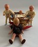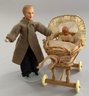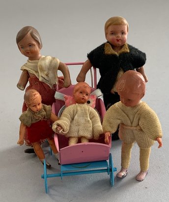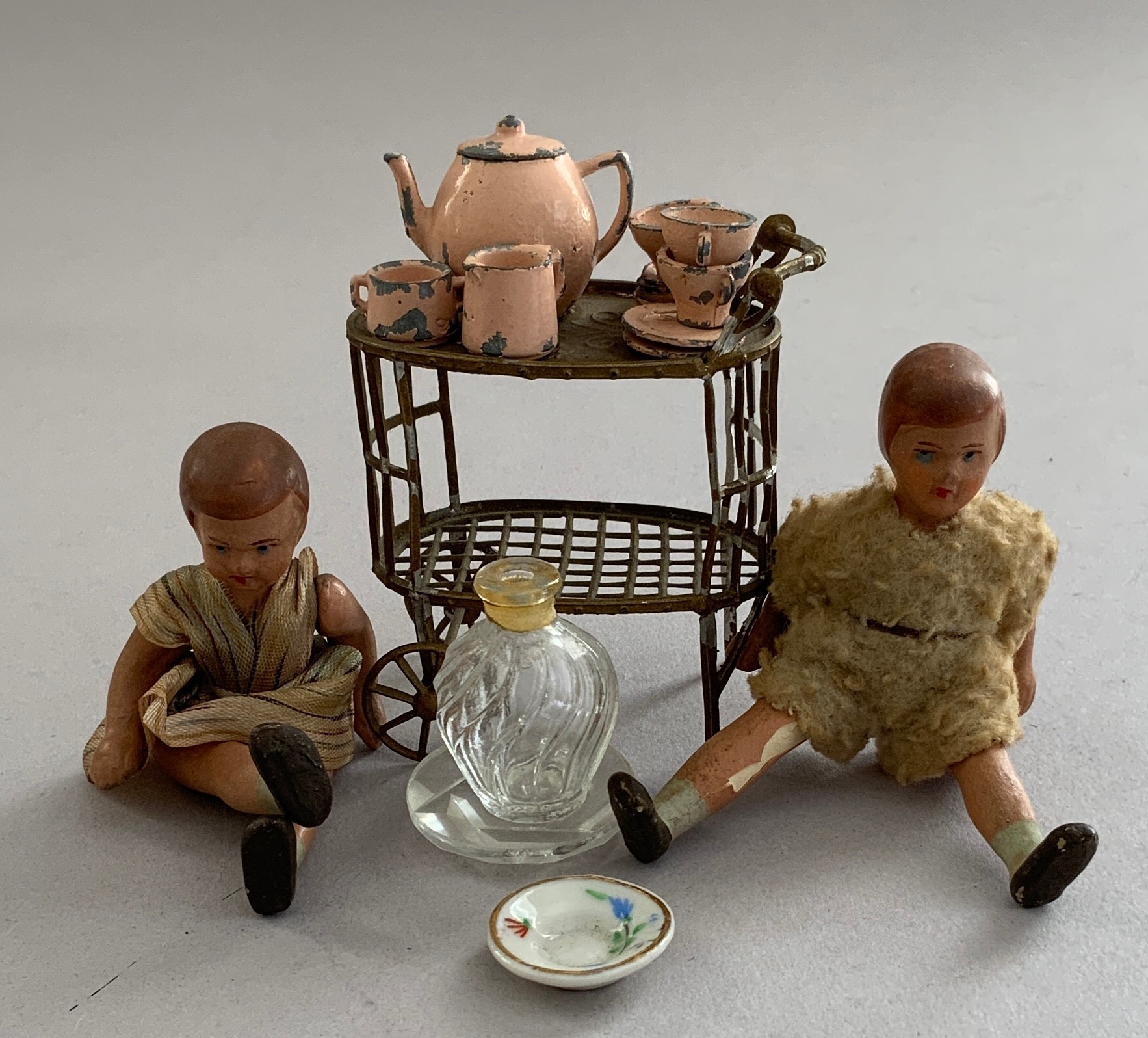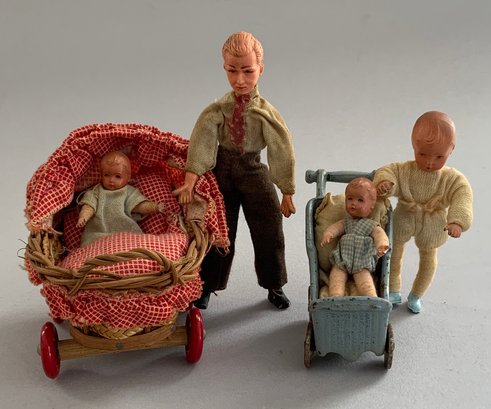 Lot of small bisque/plastic dolls, carriages, cradles, etc., 1 ½” – 4” long