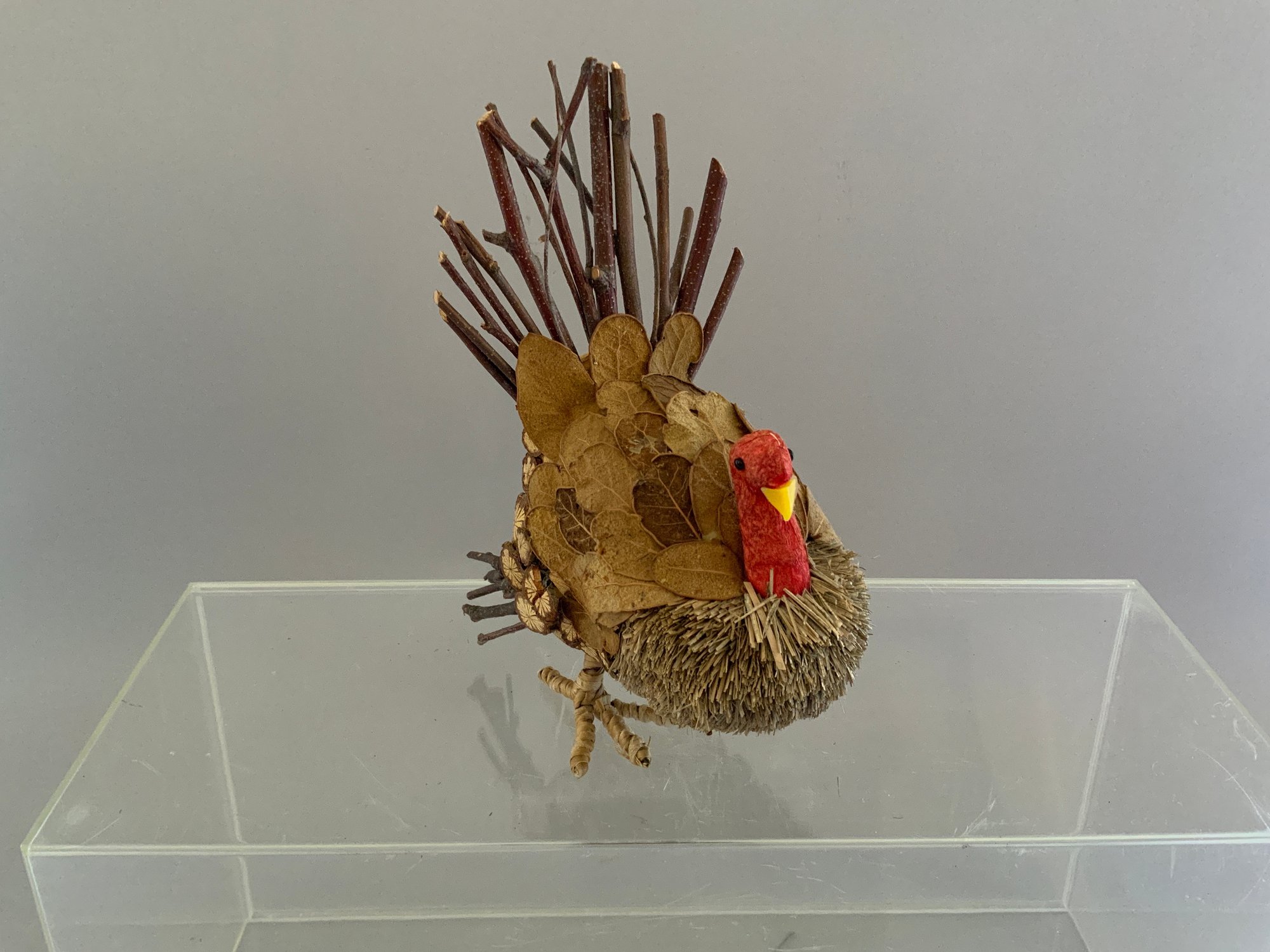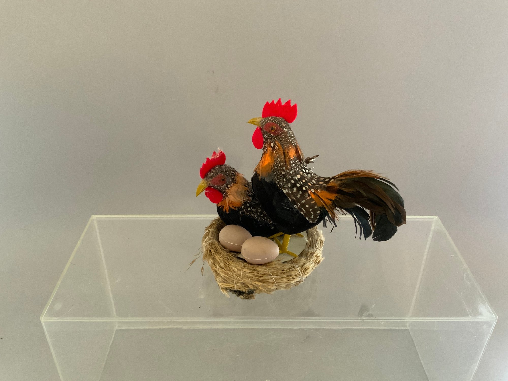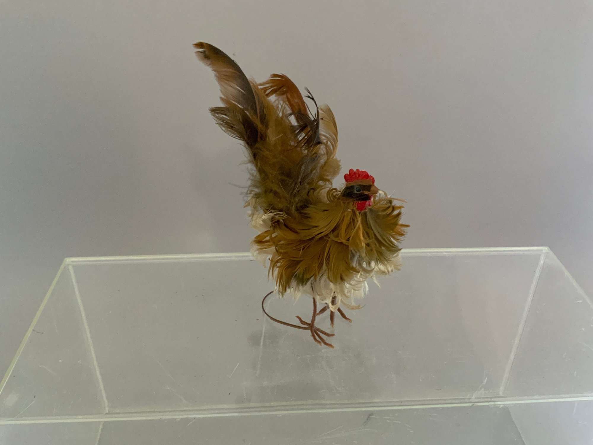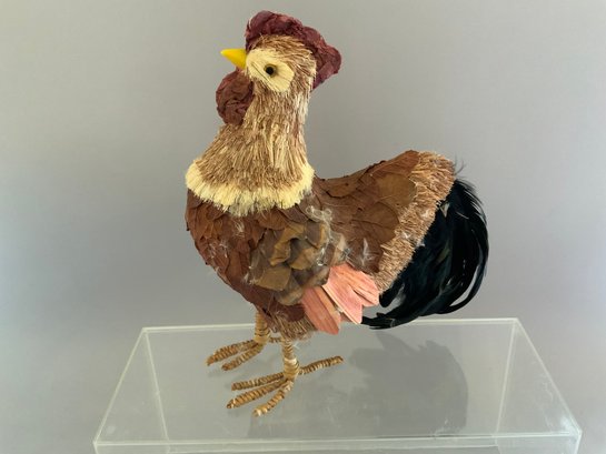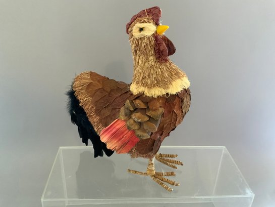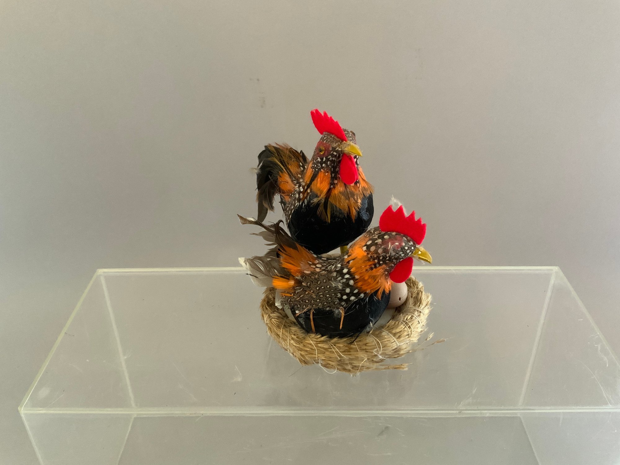 Lot of thirteen various feathered, paper or straw birds. Roosters, chickens, chicks, and turkey.