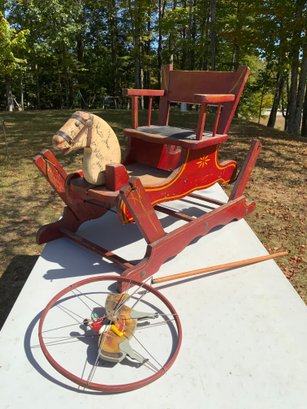 Lot of two children’s toys. One 32.5”x23.5” antique children's platform rocking horse, with white horse and red and gold accents. One 33”x13” antique horse push toy.