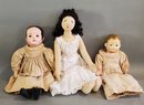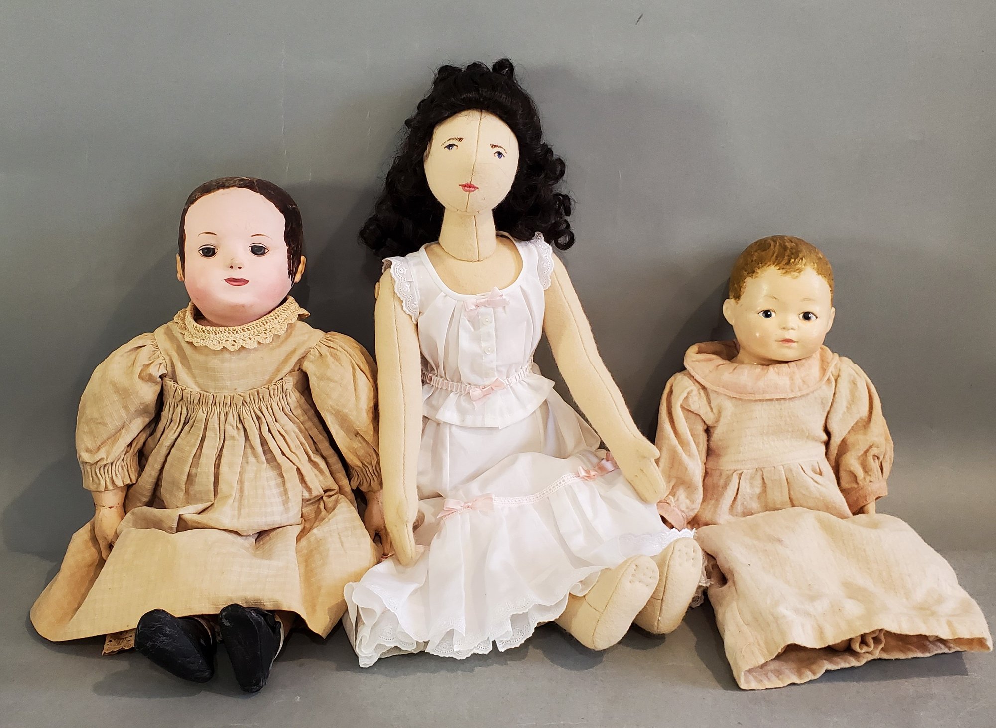 LOT OF VINTAGE / ANTIQUE CLOTH DOLLS - 1- 20", ALL FELT W/ EMBROIDERED FACIAL FEATURES, WHITE DRESS, 1- 16 1/2" OLD MARTHA CHASE THAT HAS BEEN PAINTED IN THE IZANA WALKER STYLE, 1- 14" MARTHA CHASE THAT HAS BEEN REPAINTED