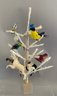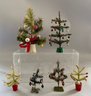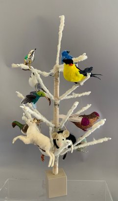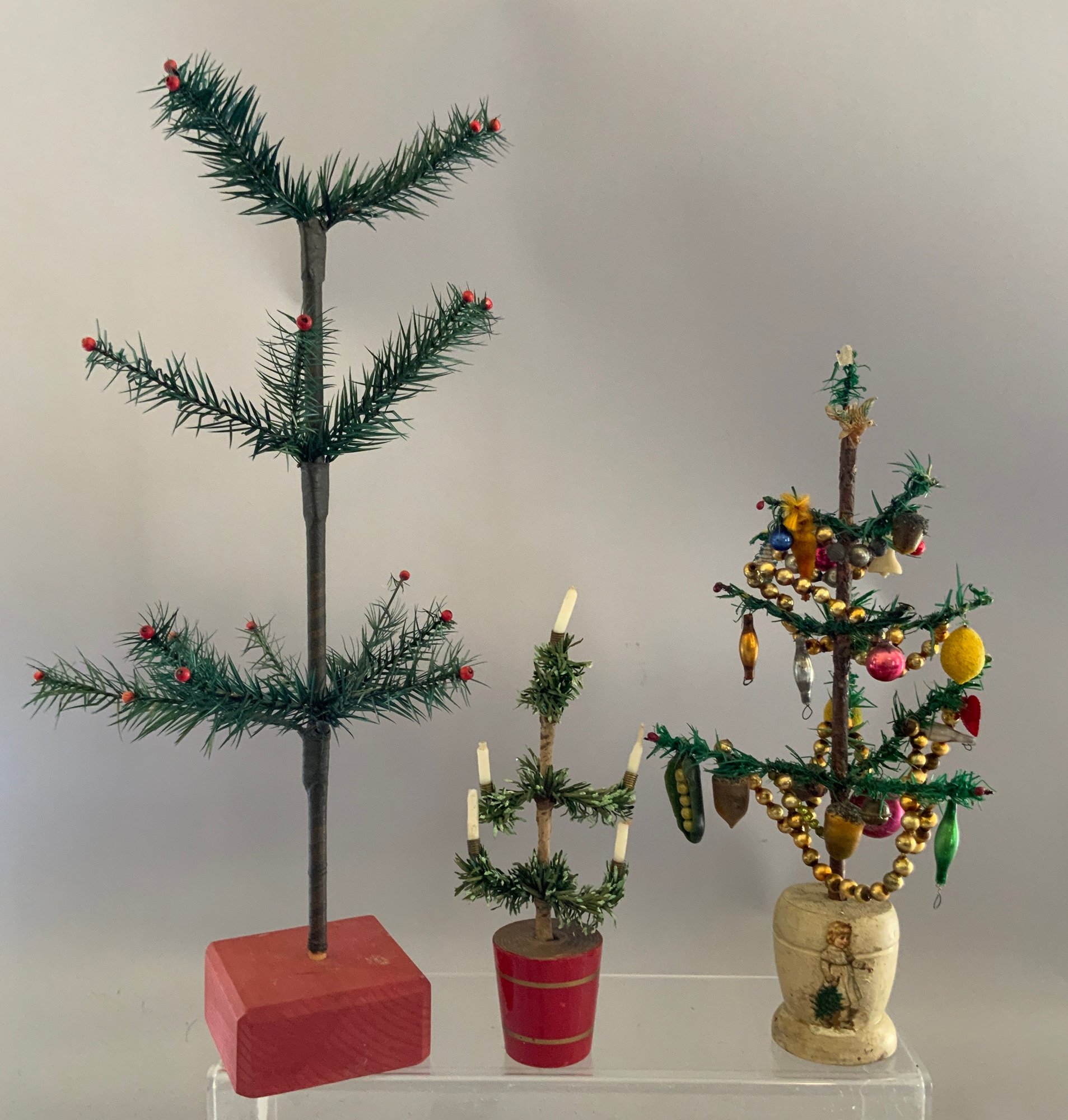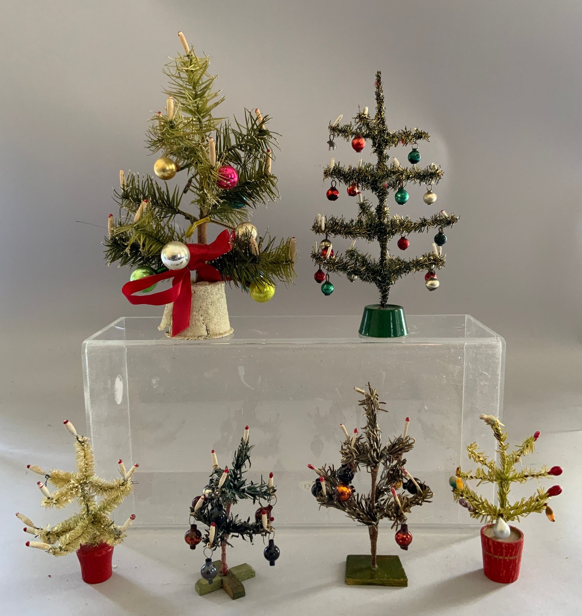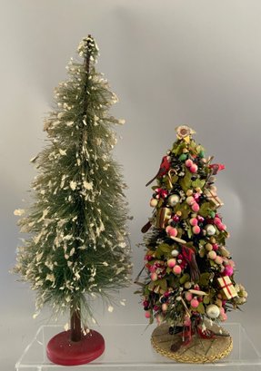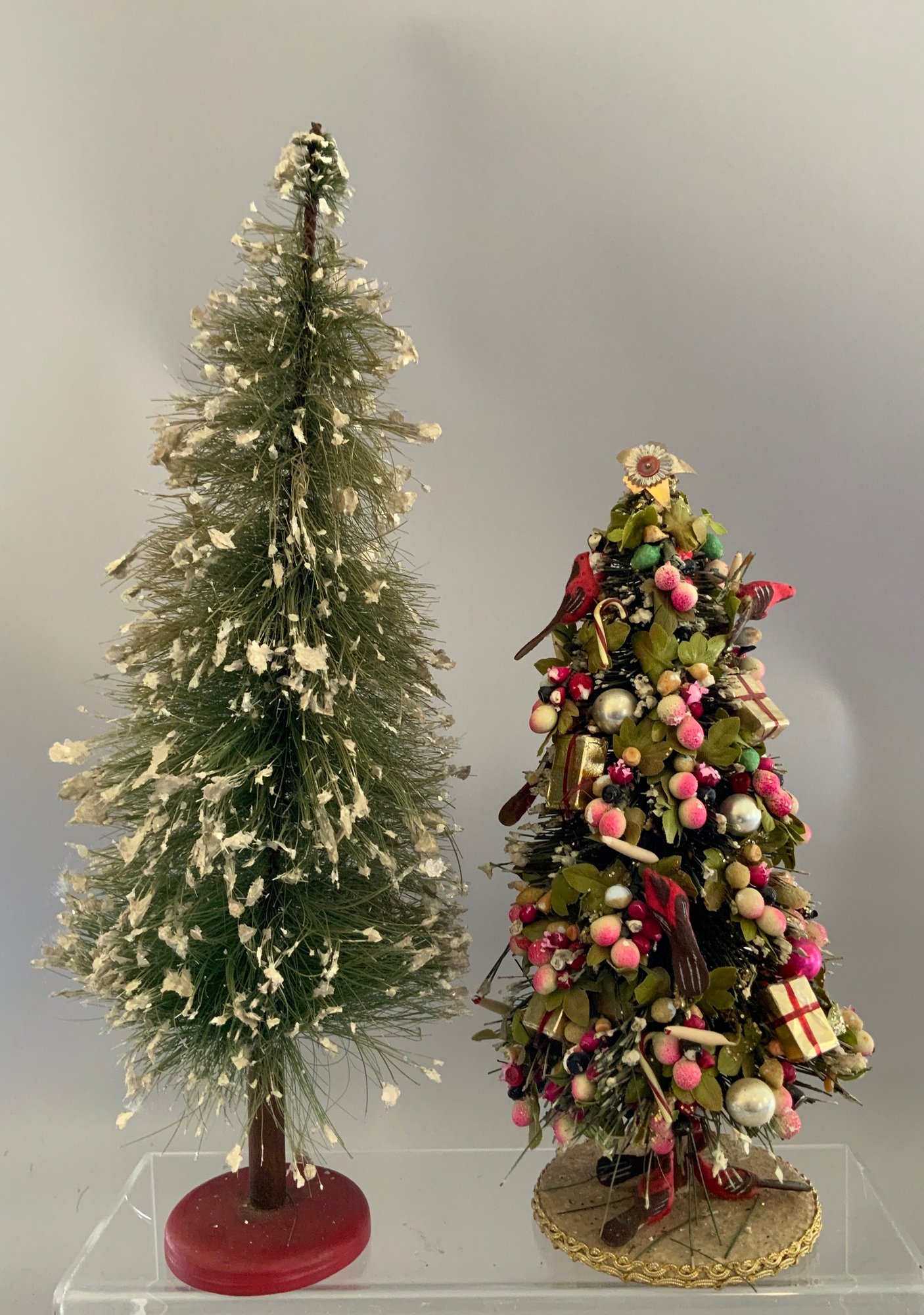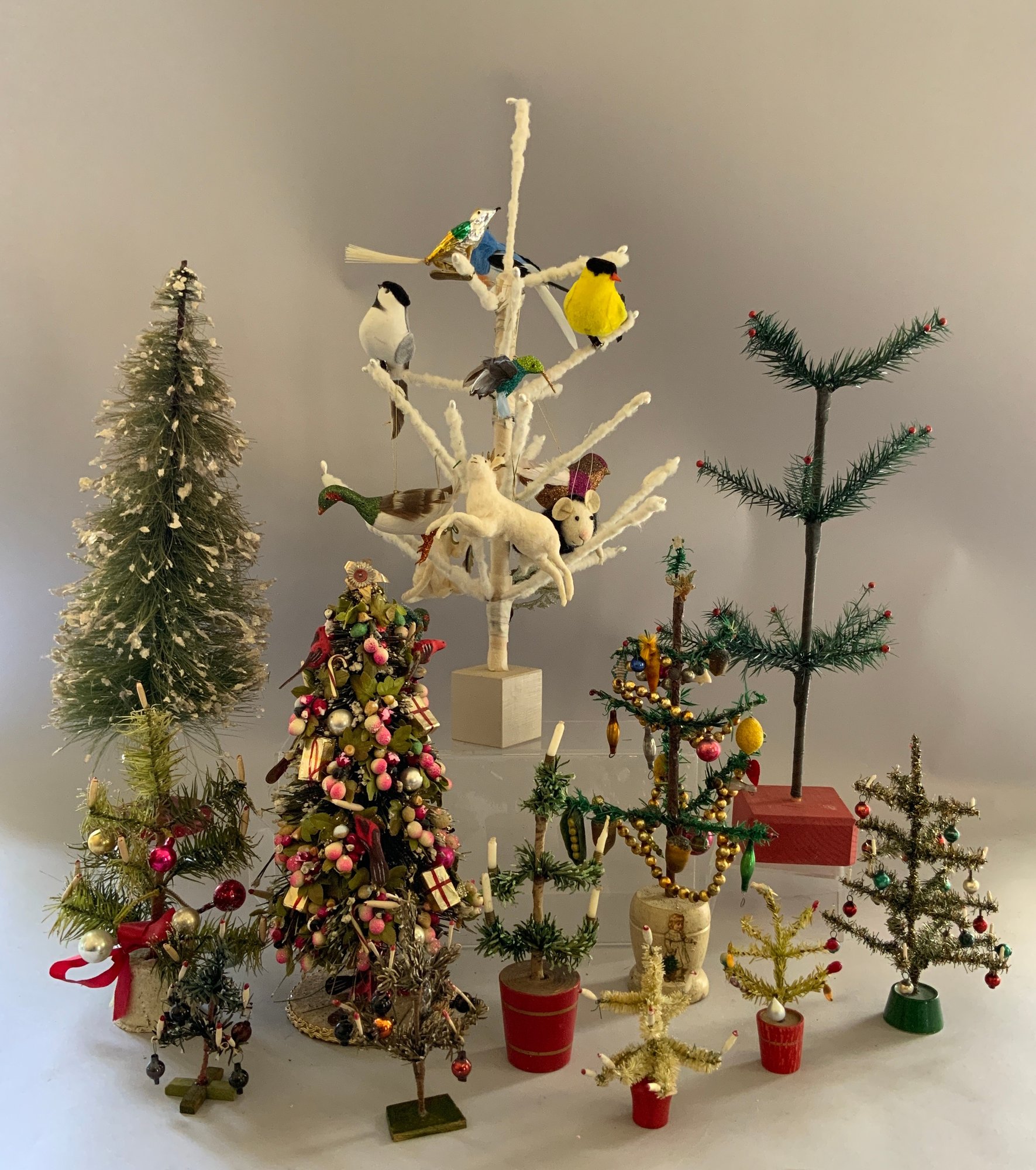 Lot of vintage Christmas items, 15”, 12” & 8” feather trees, 2 – bottle brush trees, 6 tiny tress, flock tree with birds & fruit