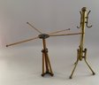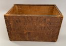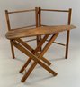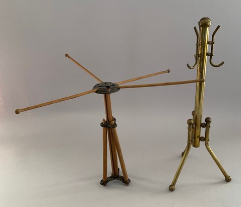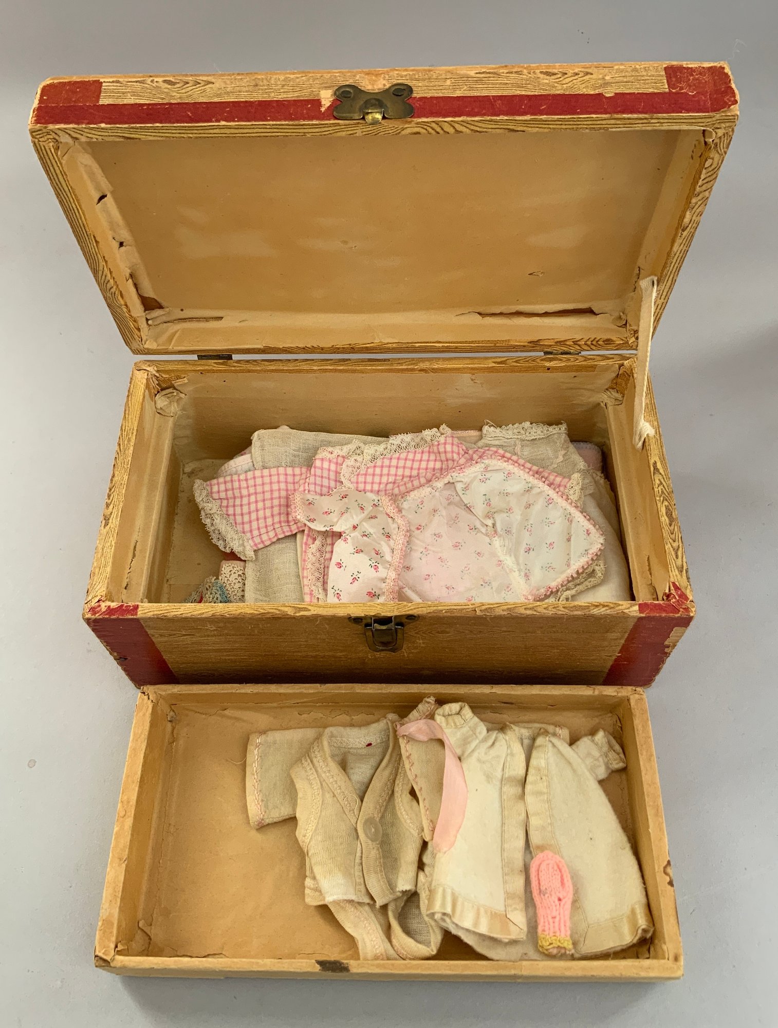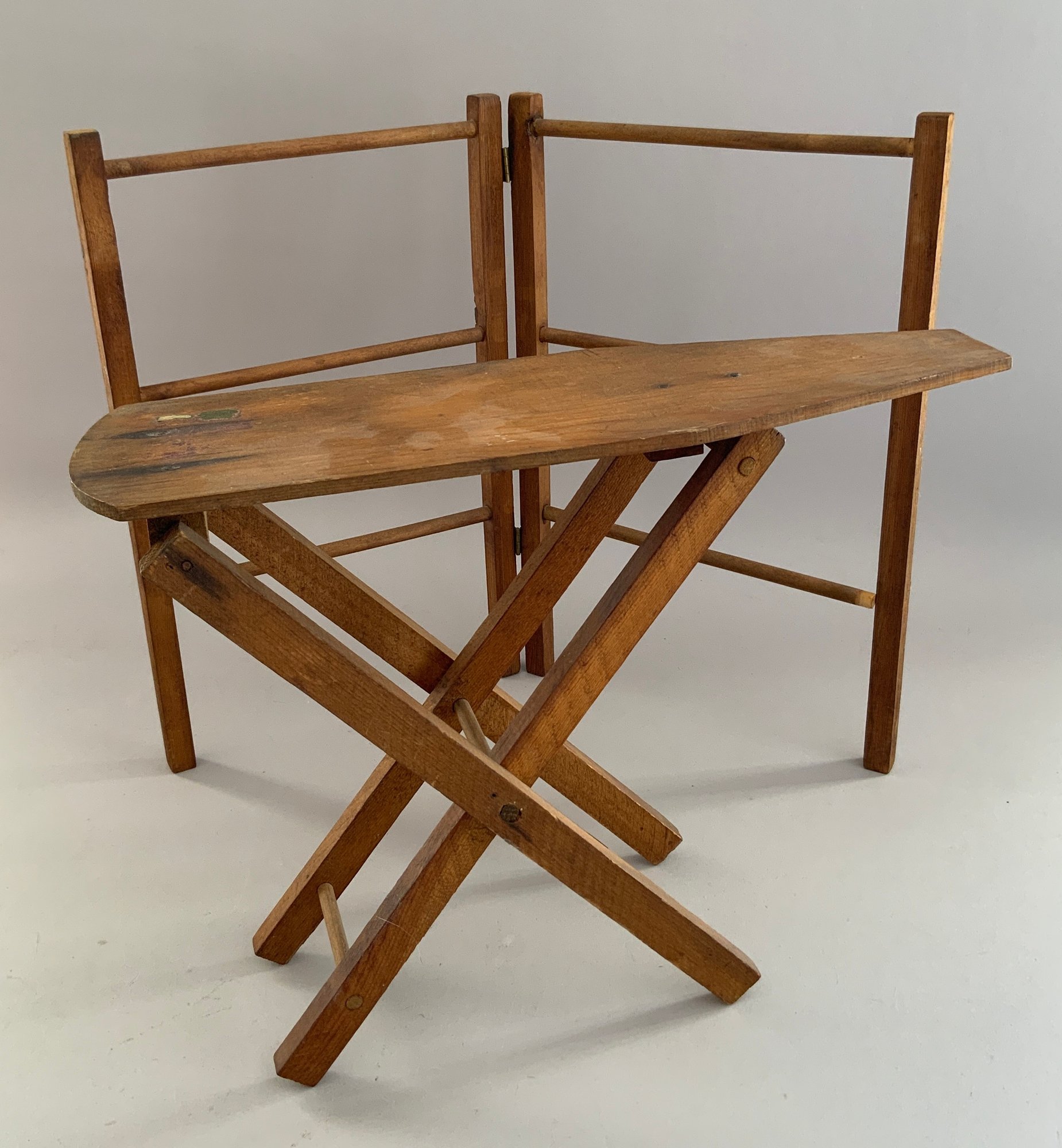 Lot of wooden items, child’s ironing board & towel rack, Satin glow advertising box 10” long, 11” doll trunk paper covered with small doll clothes, & brass doll/child’s hat rack