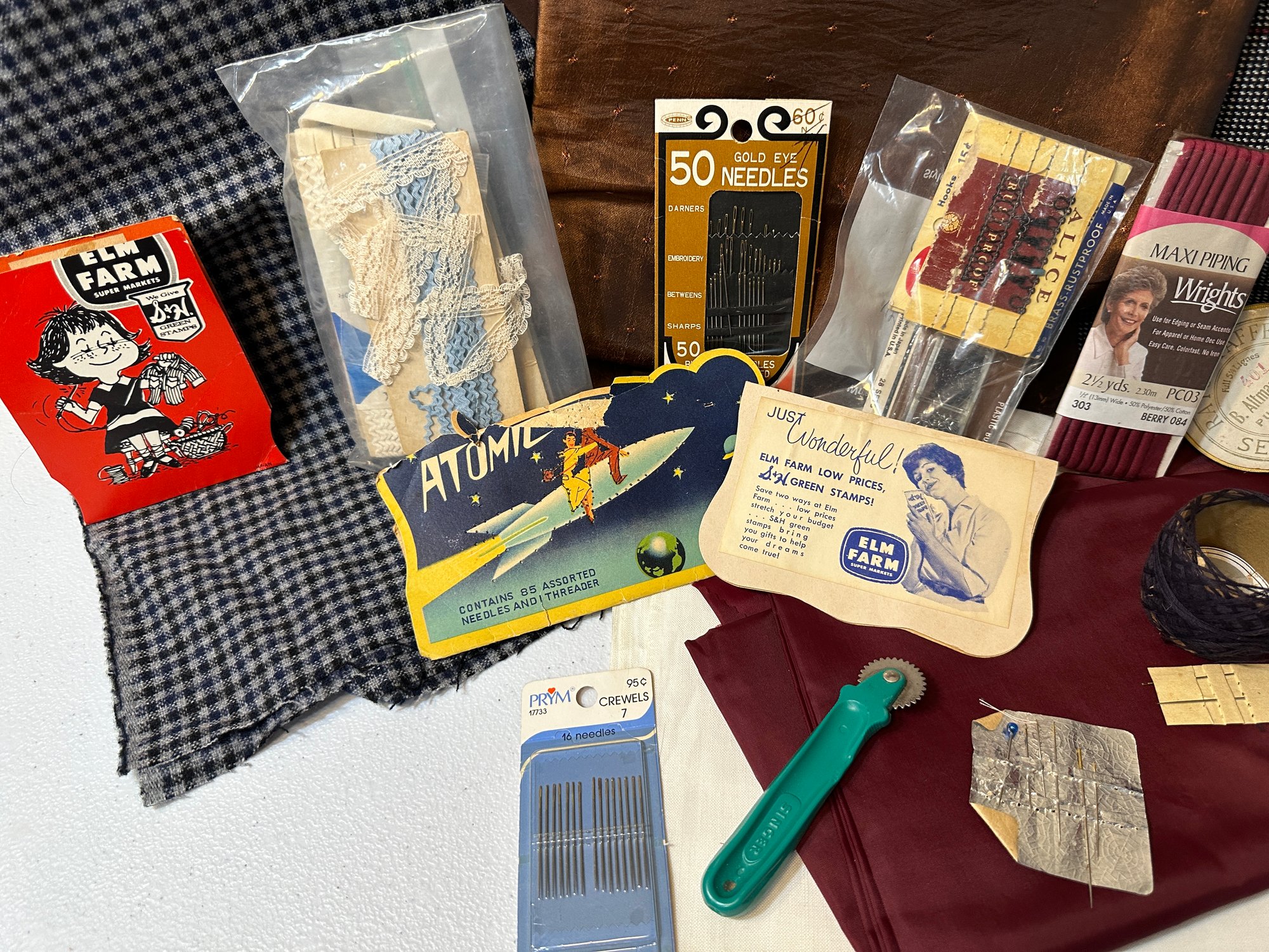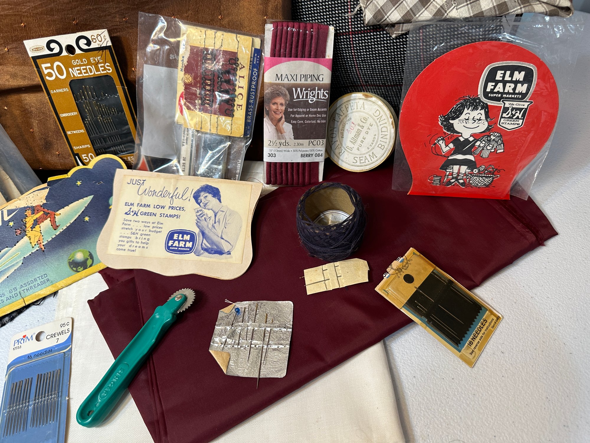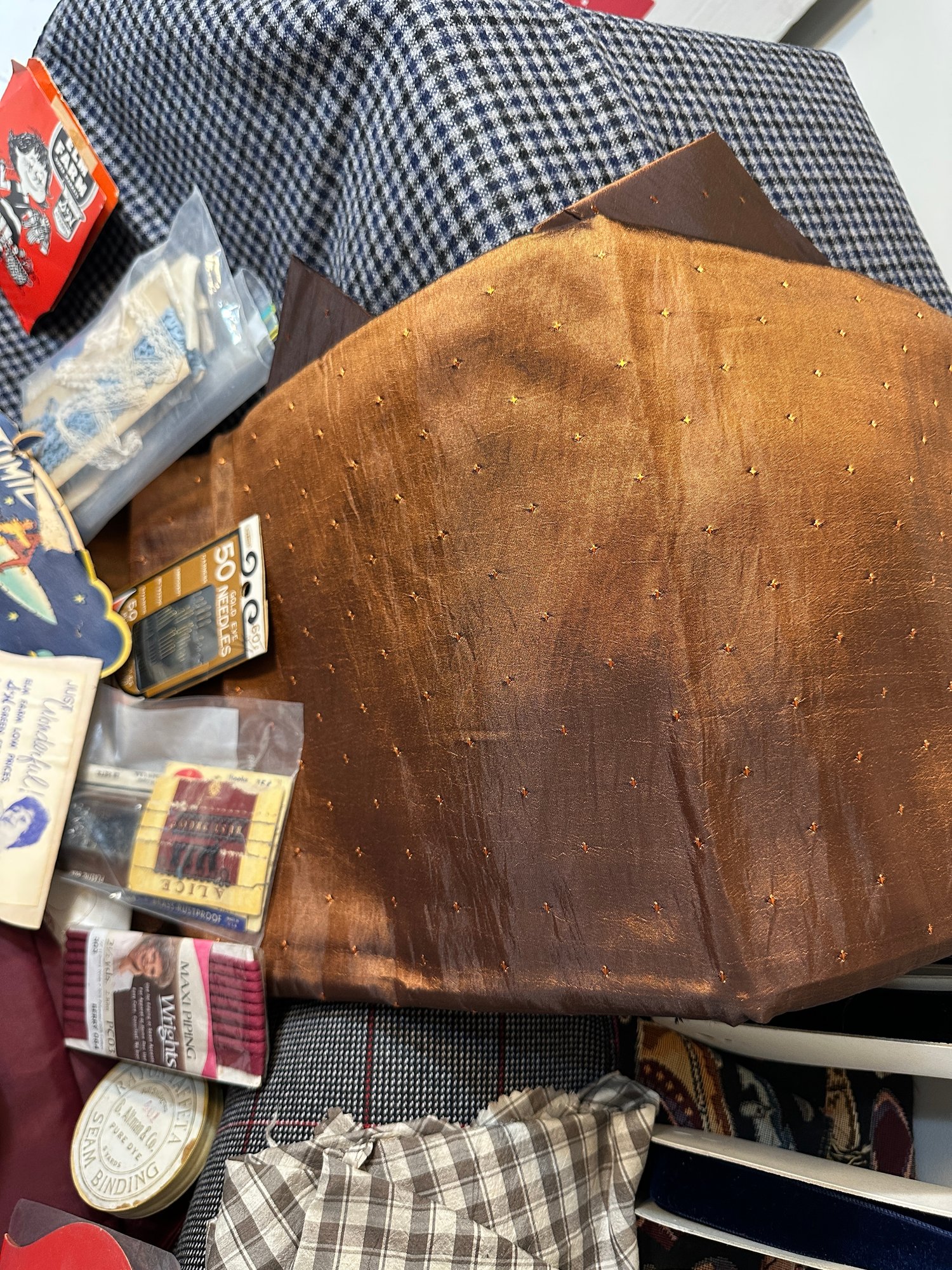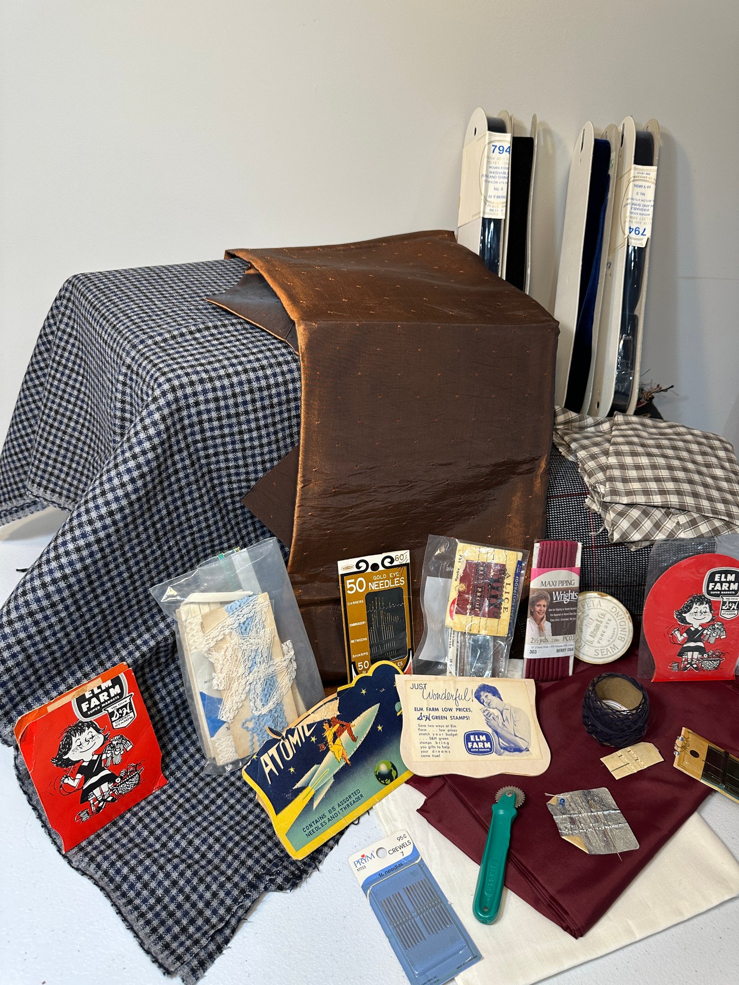 Material and sewing lot, velvet ribbons, needles, material and more