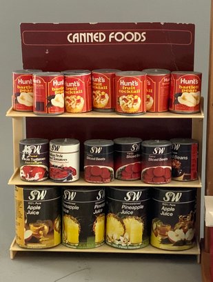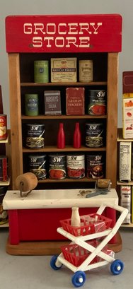 Miniature lot, 1- wood grocery store 10”T x 5”W x 4” D, accessories, large lot of miniature foods, & lot of doll house accessories