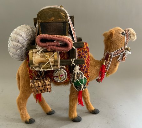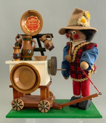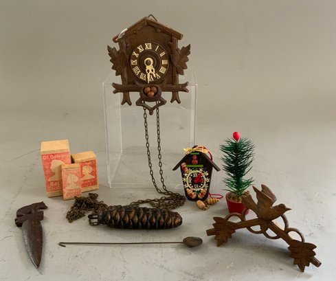 Misc toys & miniatures, German peddler/organ grinder 9” long music box, small German cuckoo clock, camel pack animal