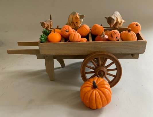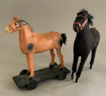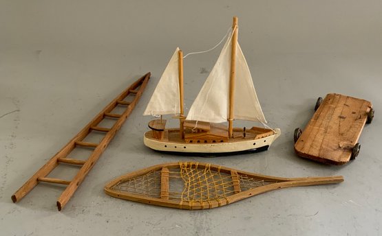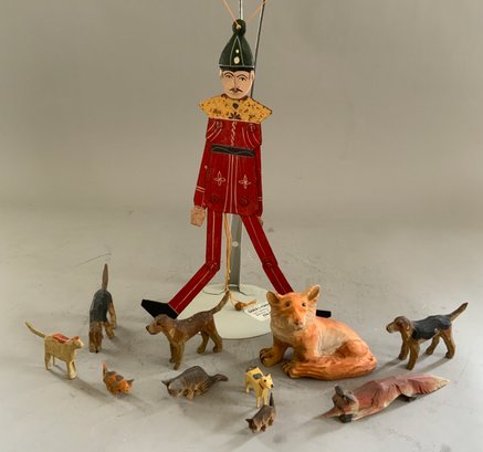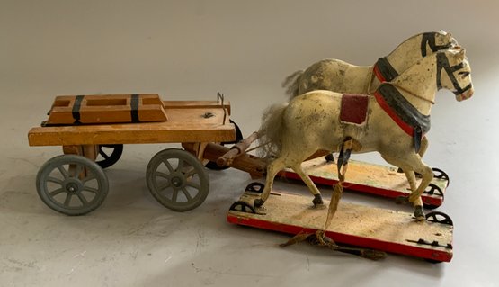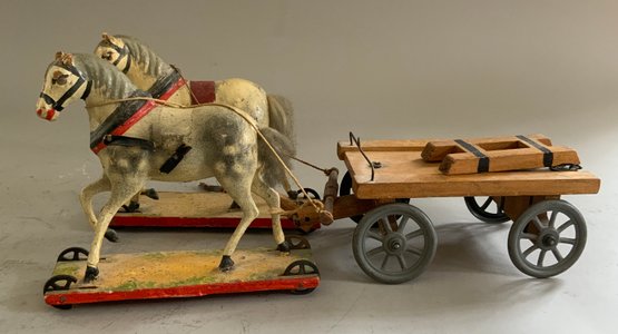 Misc. toys & miniatures, 11” cart pulled by 2 horses, 11” tin Jolly Dancer, small sailboat, carved wood animals, felt black horse, etc.