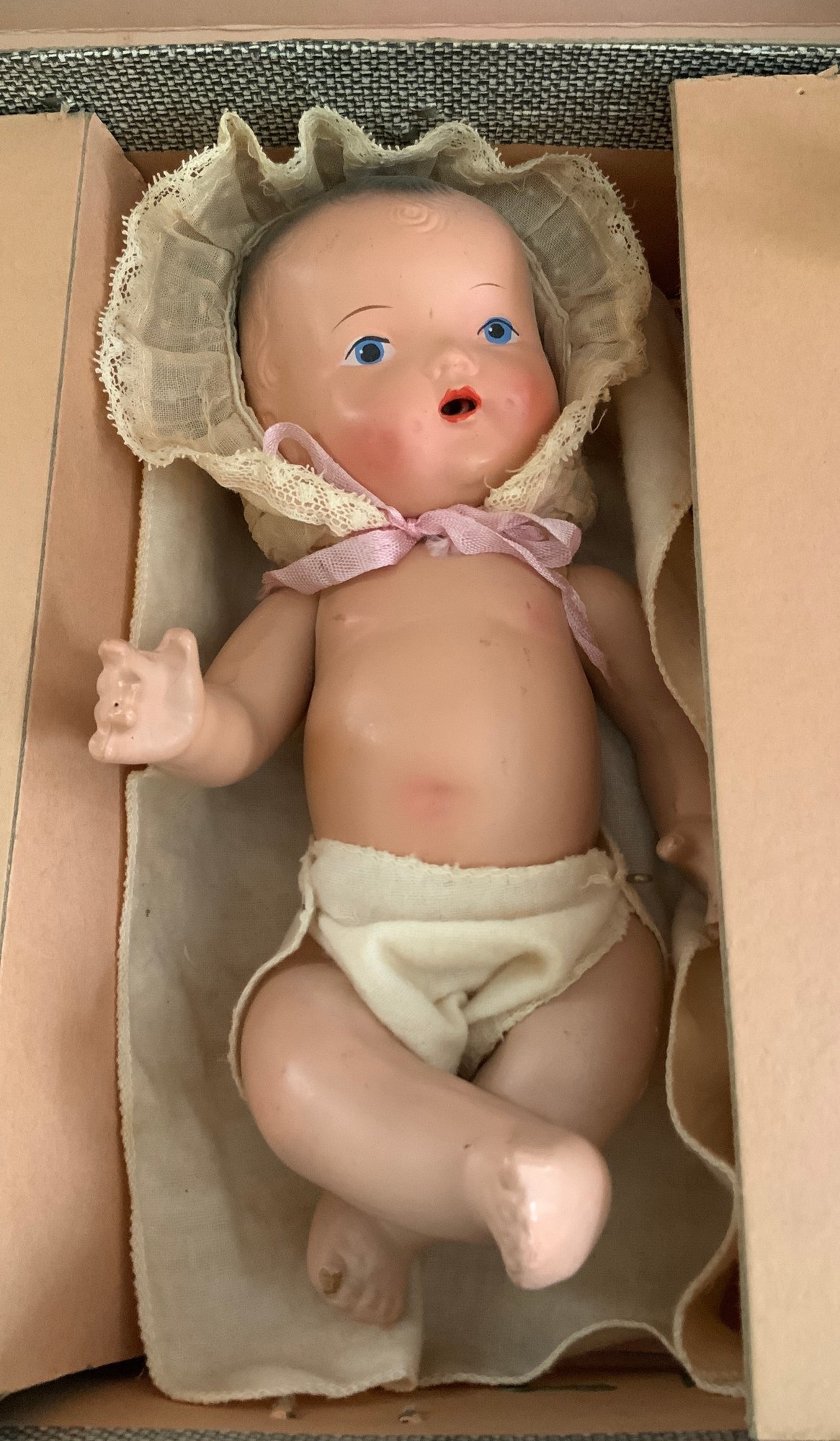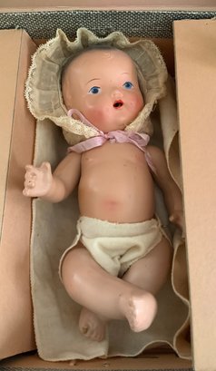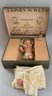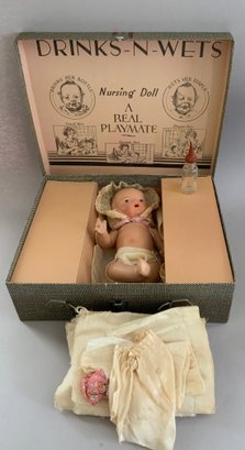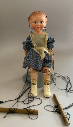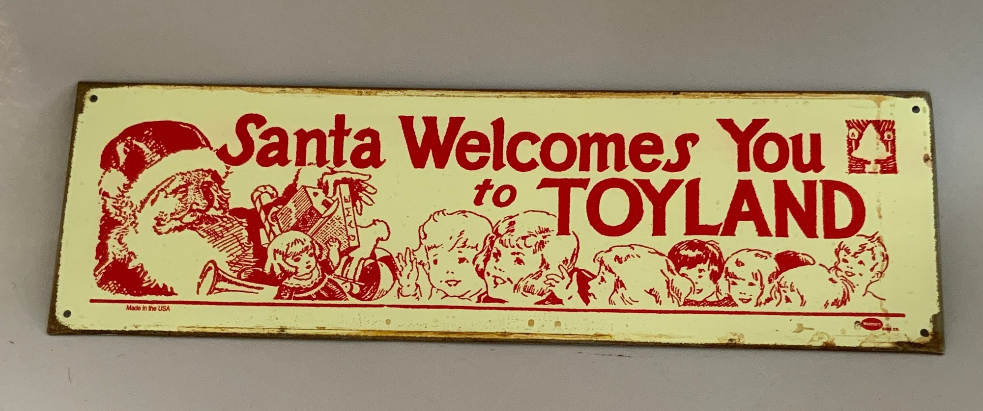 Miscellaneous Lot: A Screen printed Enamel sign: “Santa Welcomes You to Toyland” from Goudreault’s Farm Stand, a 13” Compo & wood Marionette by Effanbee, molded hair w/ braided crown, painted blue eyes, Emily Ann, Valistin, C. 1936 and “A Nursing Doll A Real Playmate” 10” Unmarked Compo, comes with clothes, hangers & a bottle, in original traveling suitcase (Ralph A. Feundlich??)