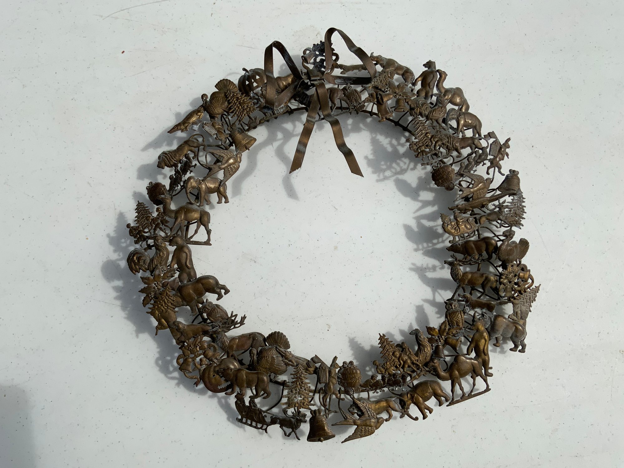 One 16”x16” round brass appears to be a Dresden Petites All Seasons Wreath featuring Christmas items.