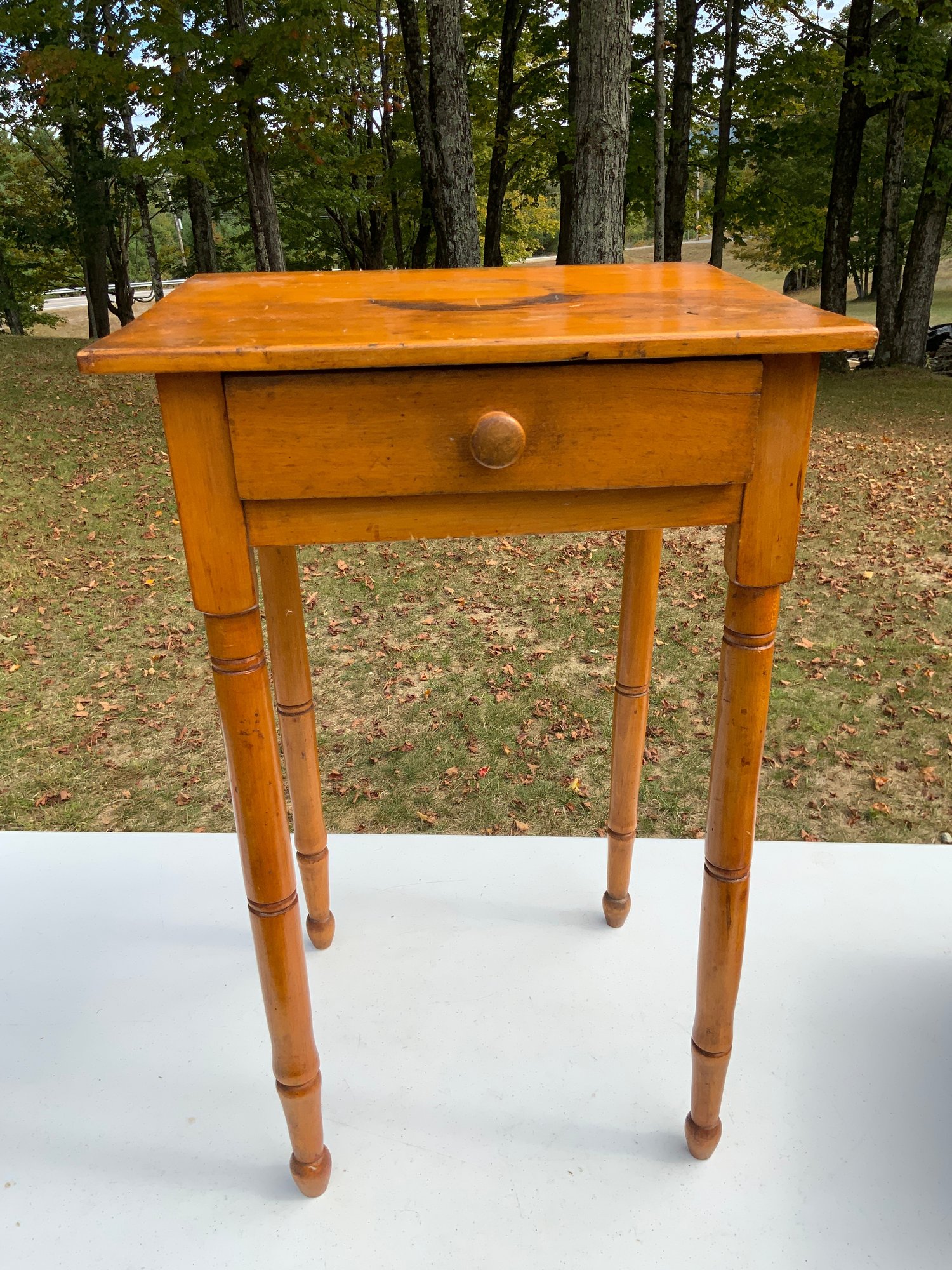 One 18”x28.5”x15.25” appears to be pine single drawer stand. Dovetail drawer, Legs have decorated simple banding. Under drawer is painted robin’s egg blue.