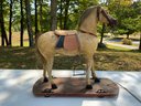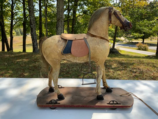 One 27”x10.5x”26” antique horse pull-toy. Features a wooden or carved body covered in hide or burlap-like material, with details like glass eyes and genuine horsehair for the mane and tail. Hair and stitching show signs of wear, saddle, on wood base with metal wheels.