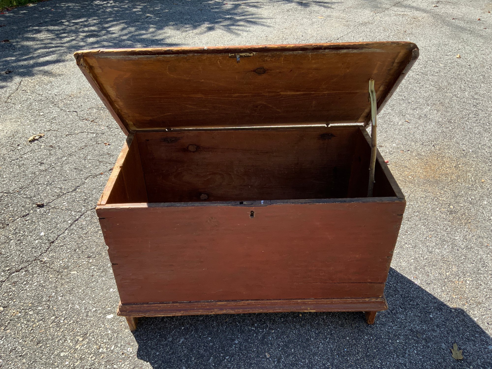 One 30”x19.5”x16” small six board blanket chest with snipe hinges, old red paint, early lock set, trim band molding around the base with bootjack ends. Overall wear.