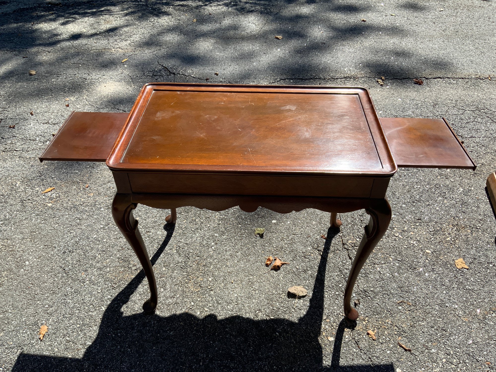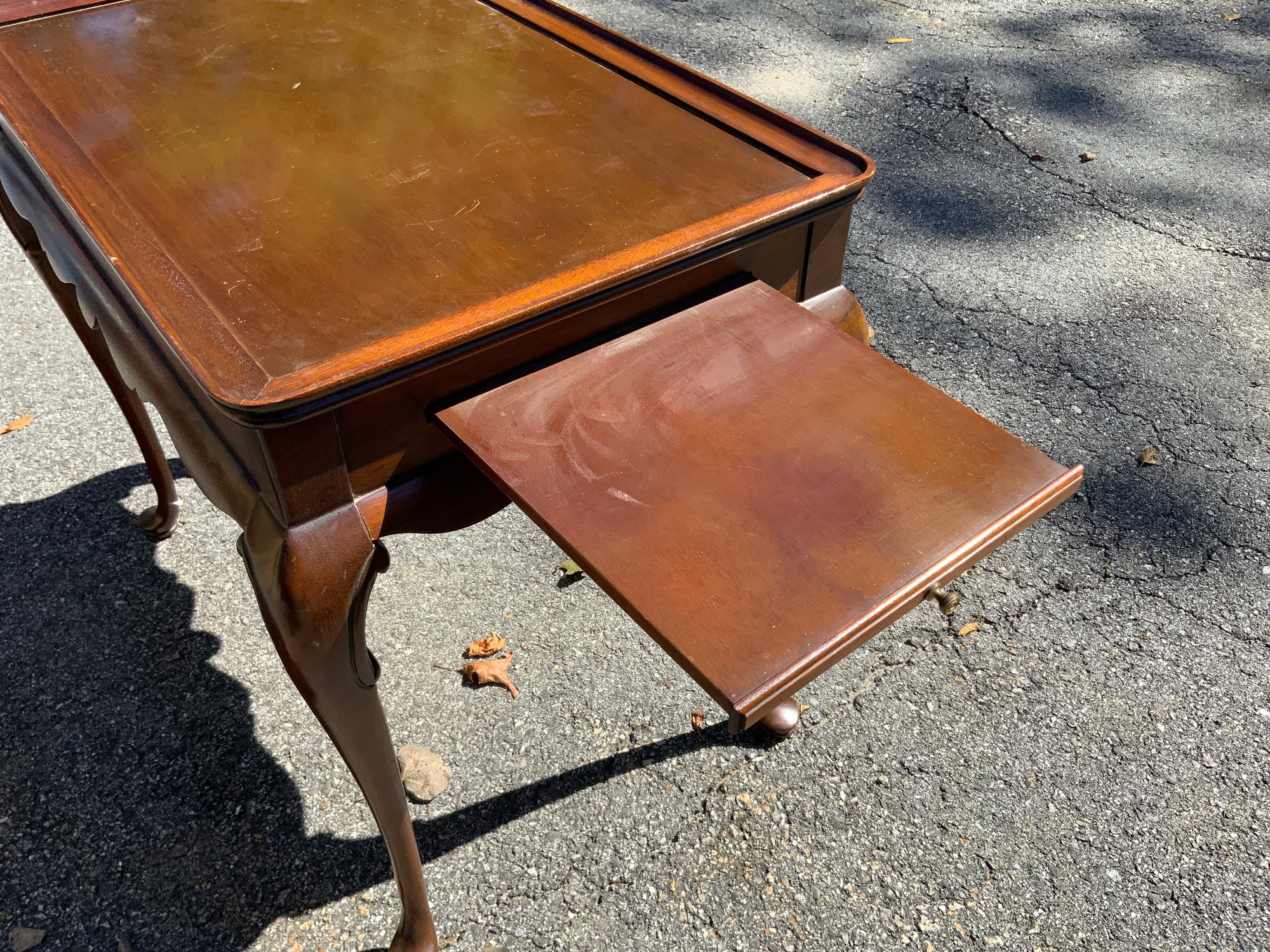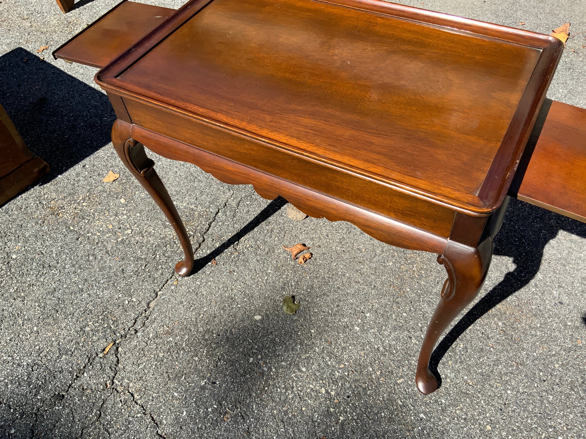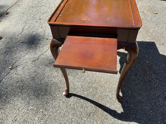 One 30”x26.5”x19” Queen Anne style tea table, probably mahogany with Queen Anne feet. Shaped skirt, raised edge rim, pullout candle slides, looks like bench made reproduction.