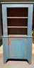 One 34”x71”x17.5” dark blue finish stepback cupboard, pine 19th century, three board back, single door panel with bead, pegged, bootjack ends, small band molding at the top. Appears to be reworked.