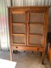 One 39.5”x59”x16.5” pierced tin pie safe, two doors, over one drawer, Bennington knobs, dovetail drawers. Three shelves. Worn on back left leg. Some signs of wear throughout.