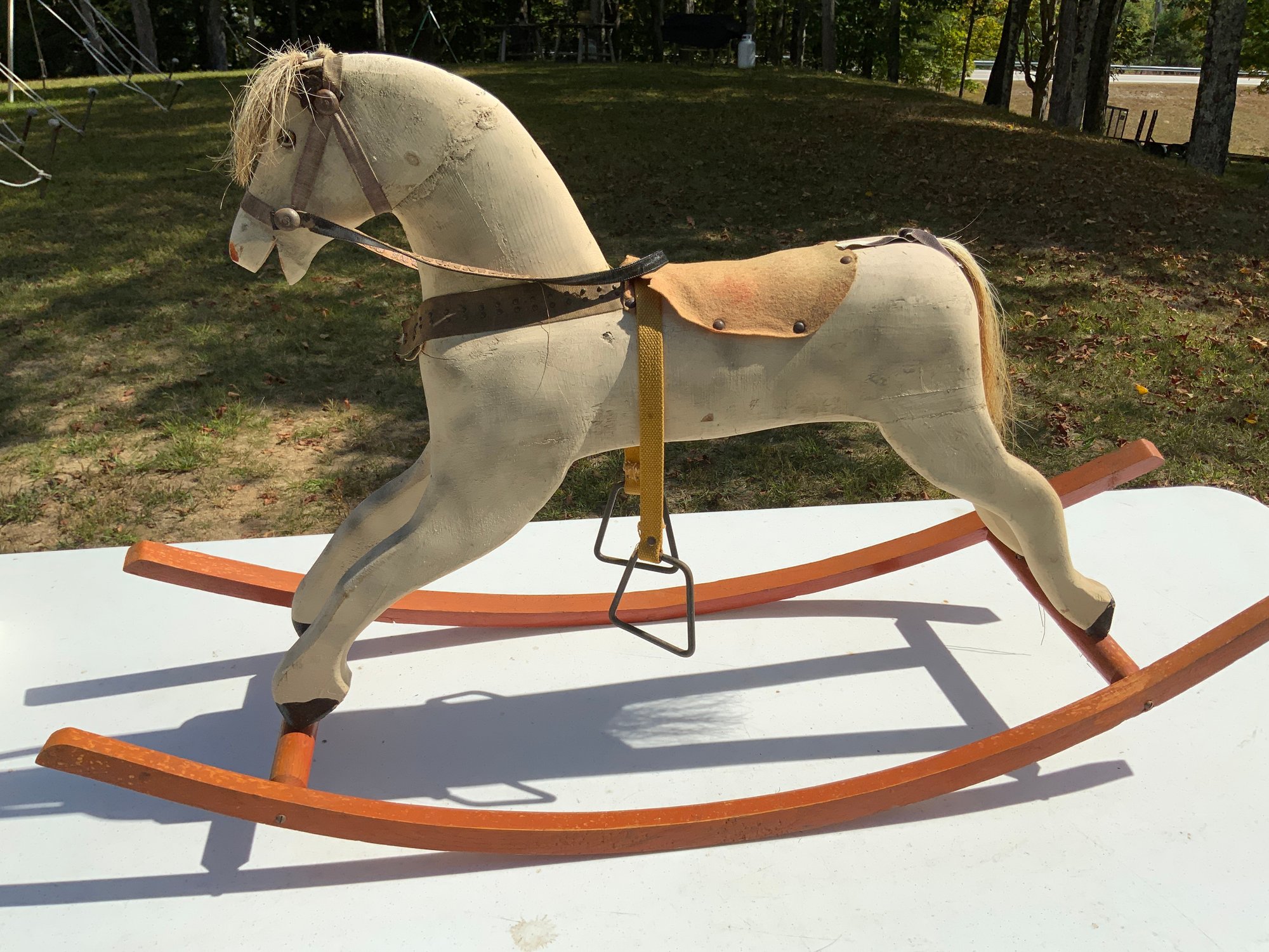 One 42”x24.5” wooden rocking horse with glass eyes, hair mane and tail. Painted body. Signs of wear on rocker.